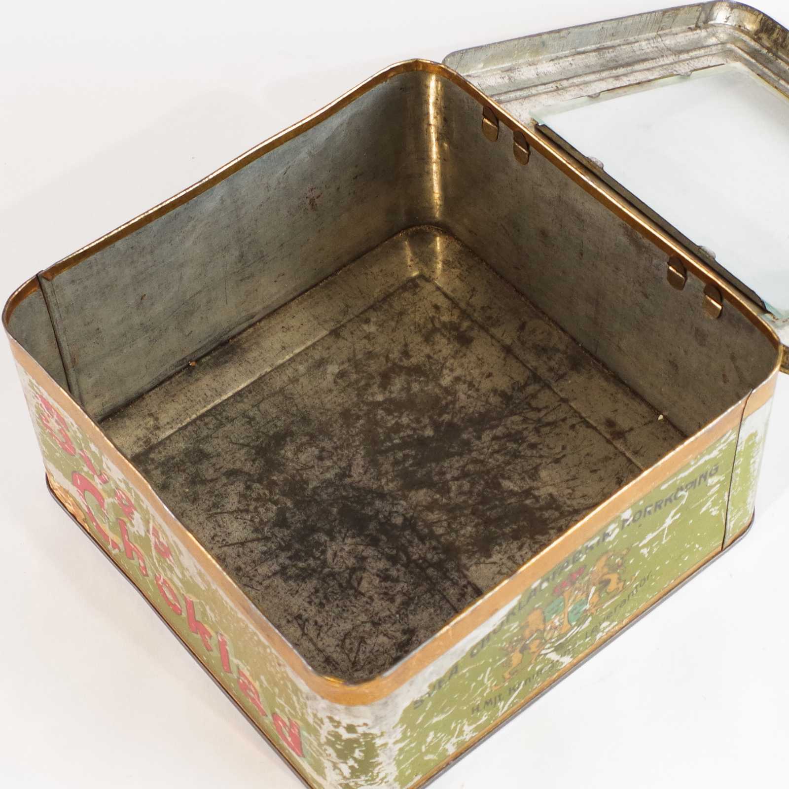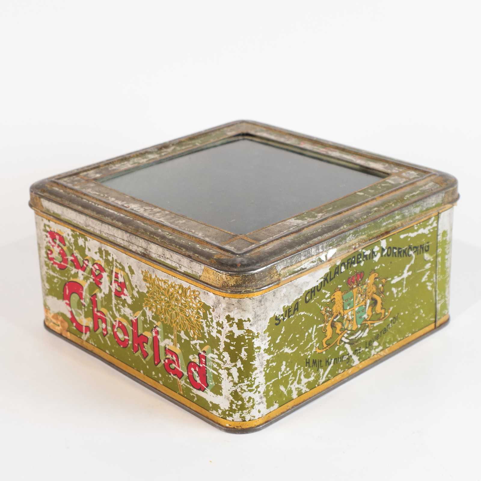 PLÅTBURK äldre, glasat lock. Svea chokladfabrik Norrköping. H:11x 22x 22cm. (färgskav)