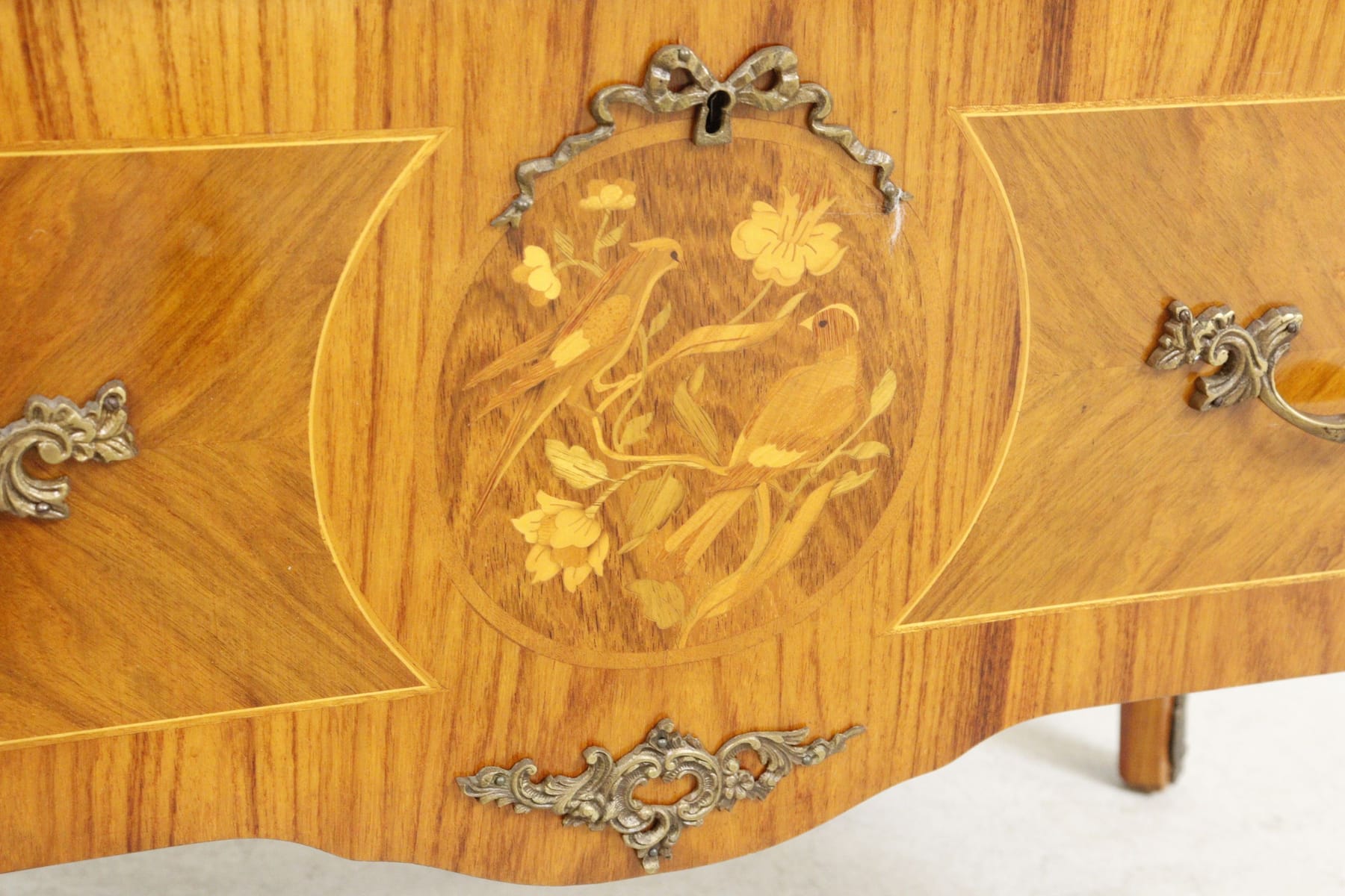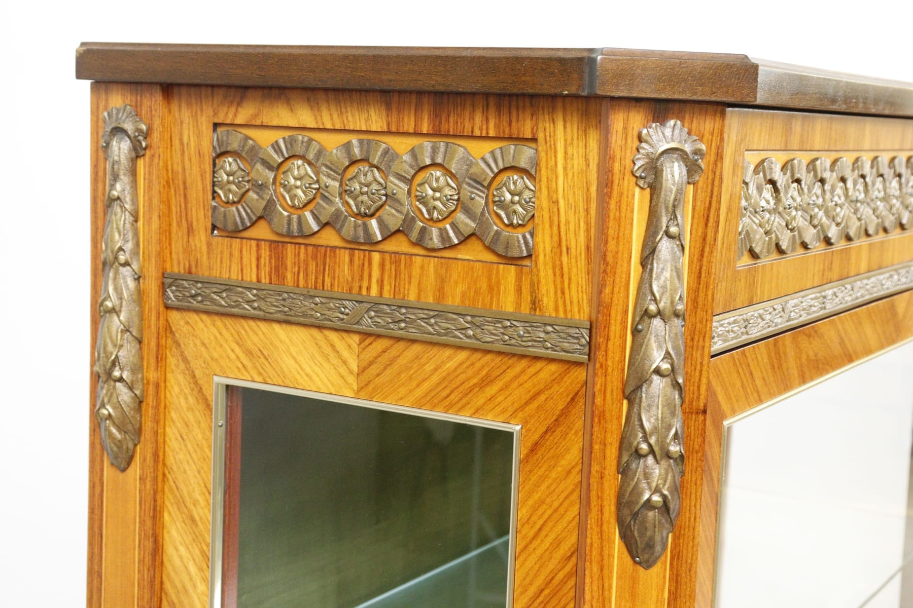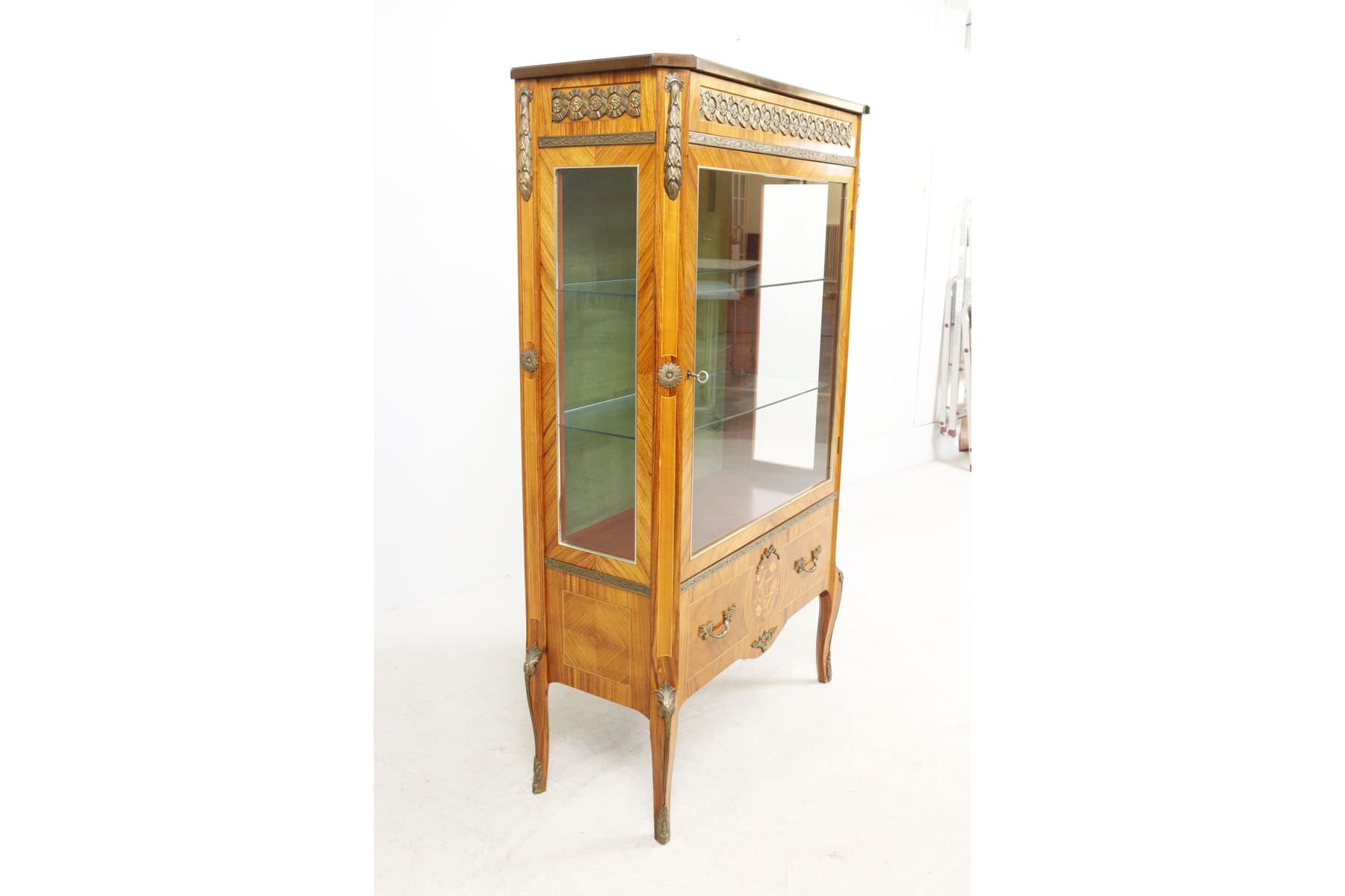 Vitrinskåp med intarsia, belysning och glashyllor