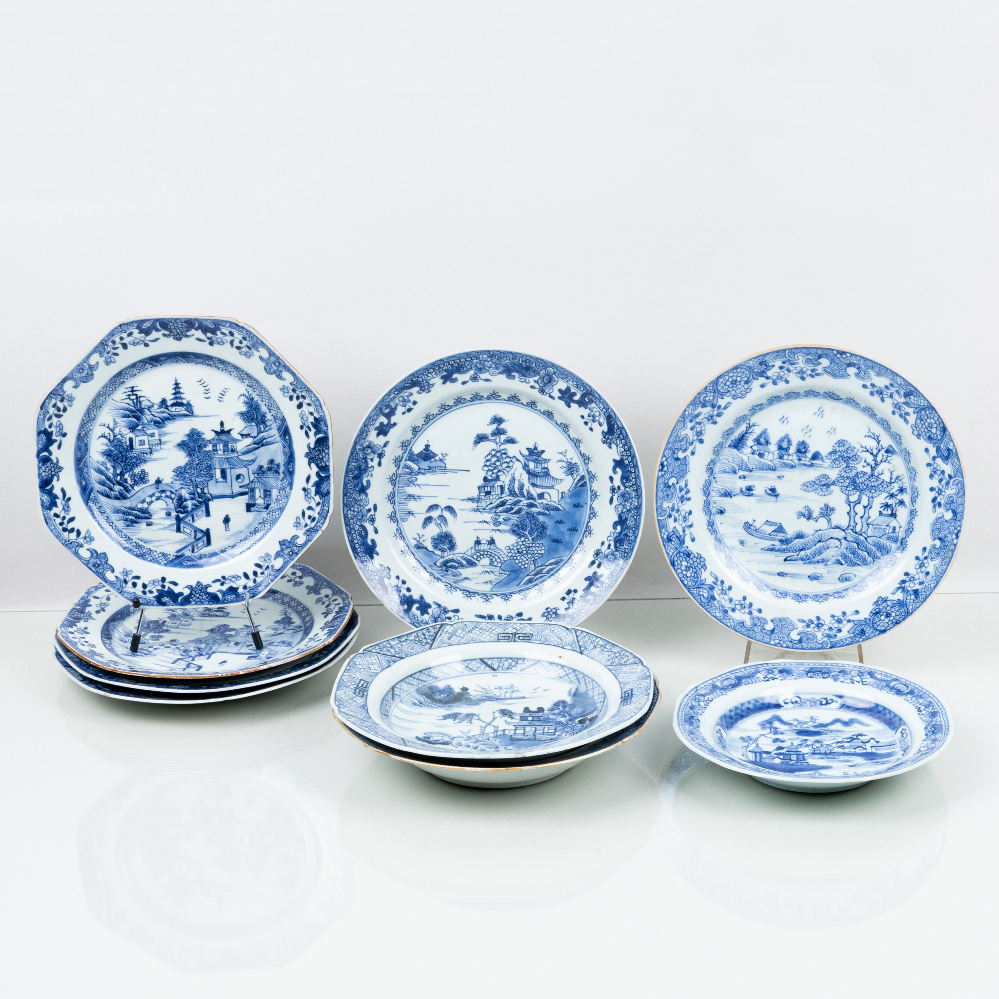 Blå dekor av flodlandskap, omfattande 6 flata tallrikar, 2 djupa tallrikar samt 1 mindre djup tallrik, diameter 19,5 - 23 cm