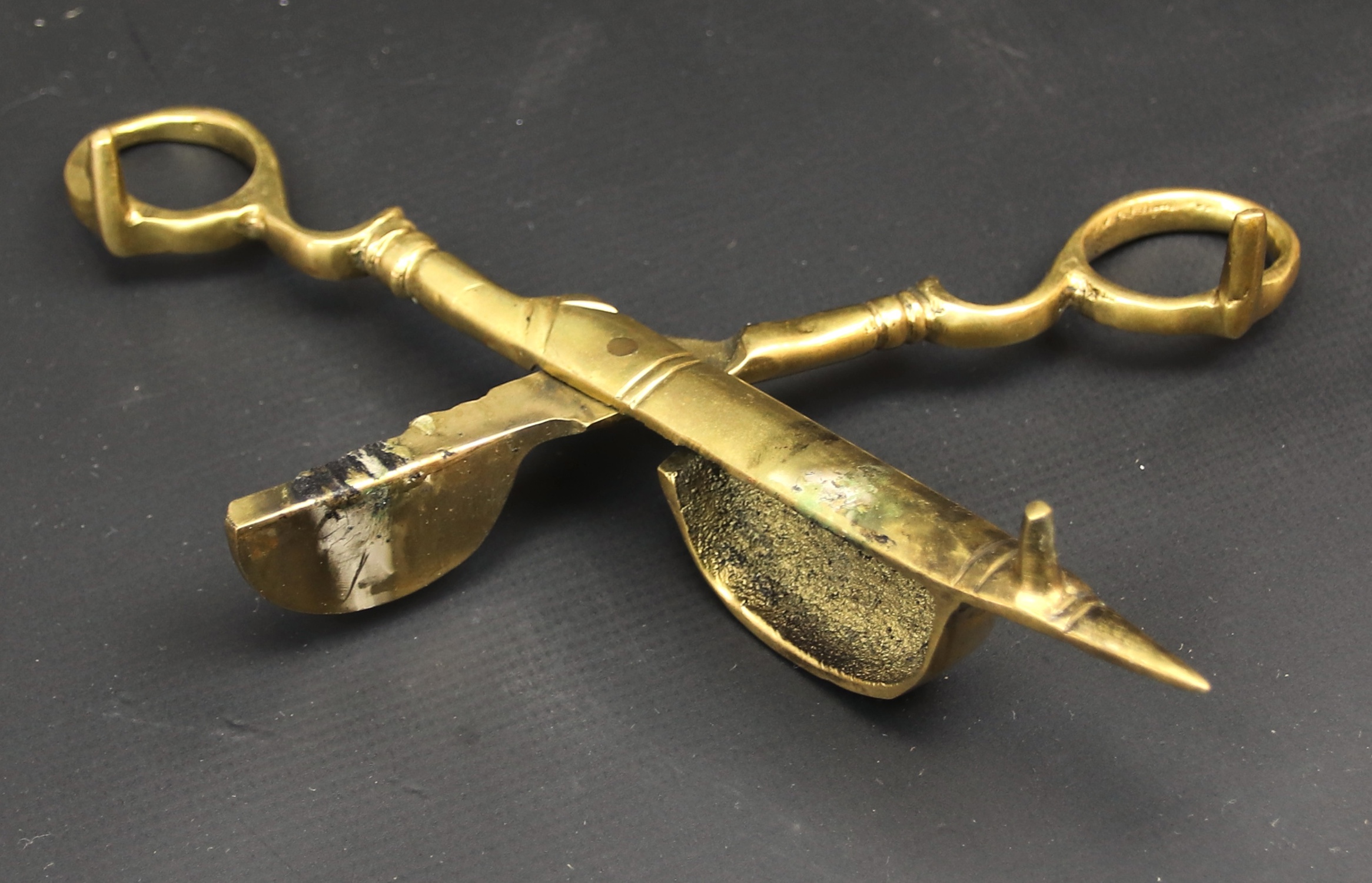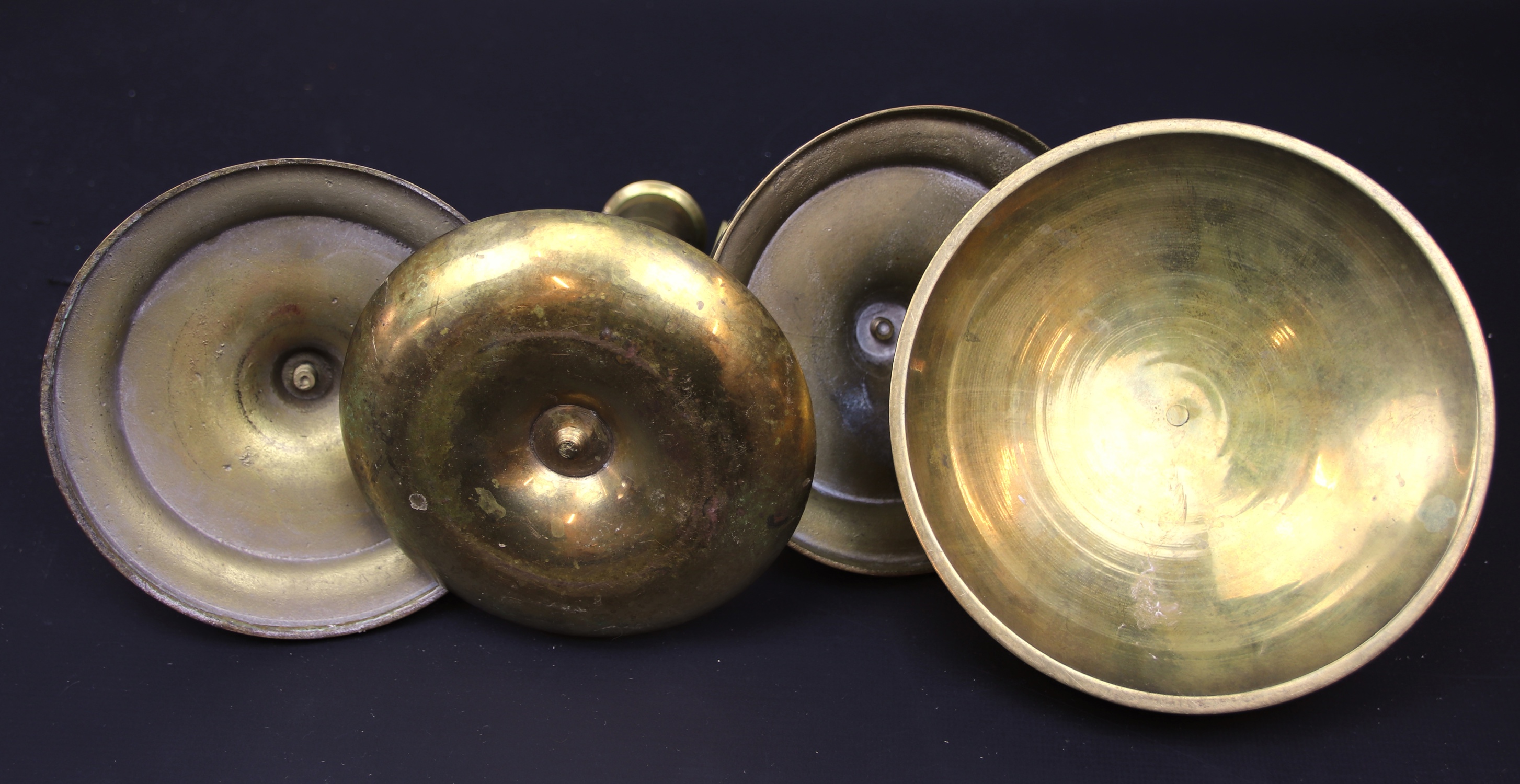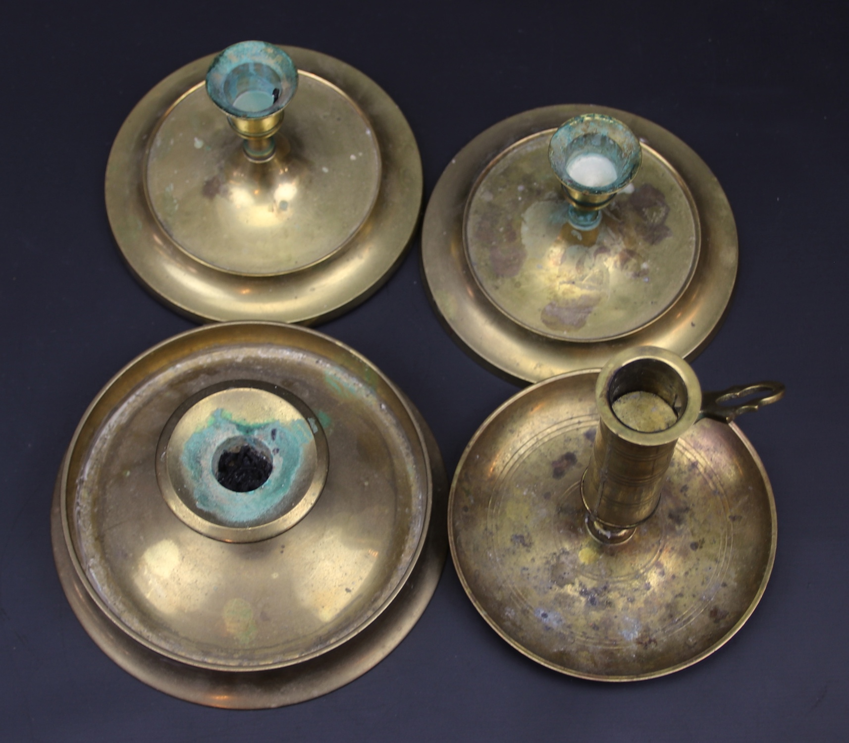Ljusstakar, stormlyktor och ljussax, 5 delar, mässing/glas.