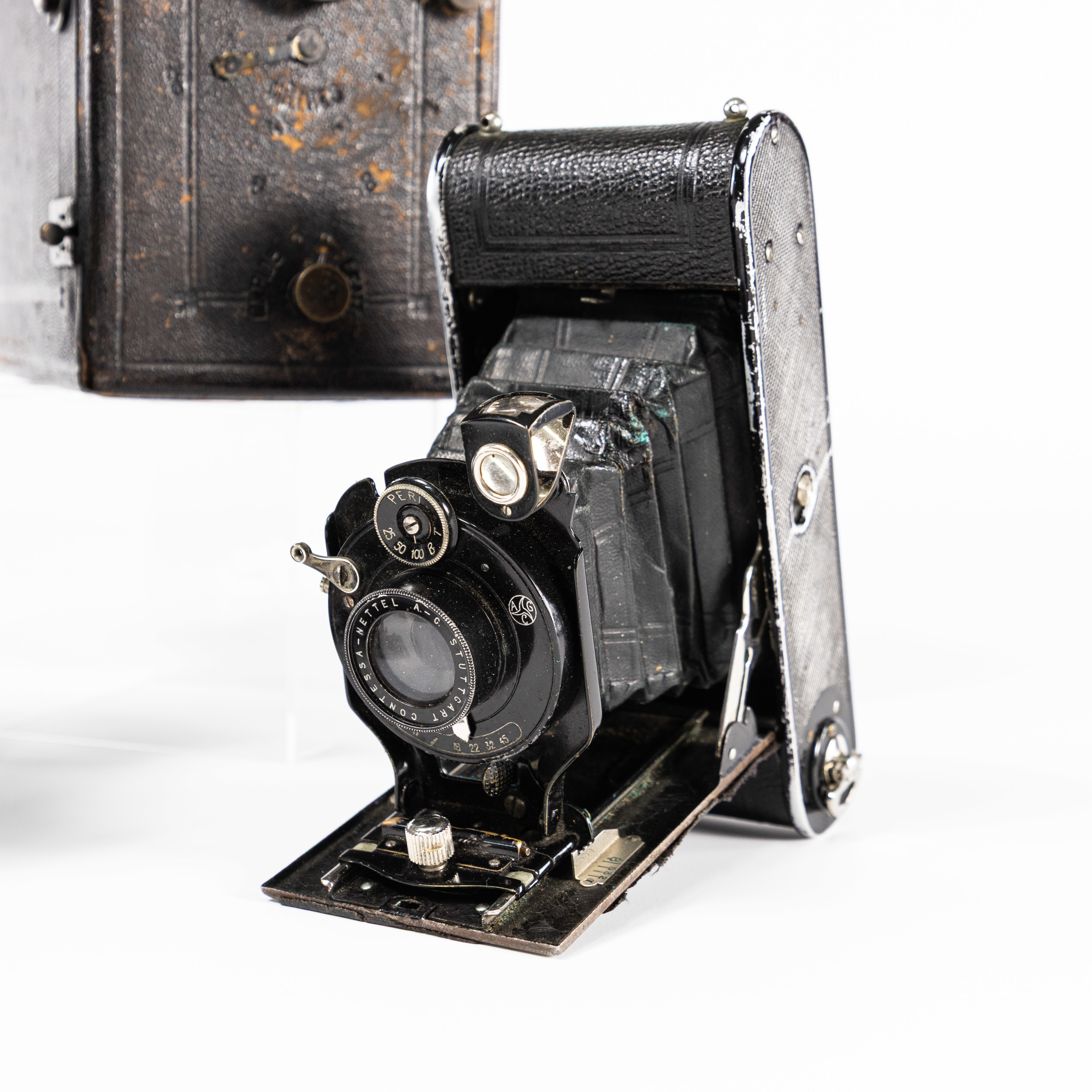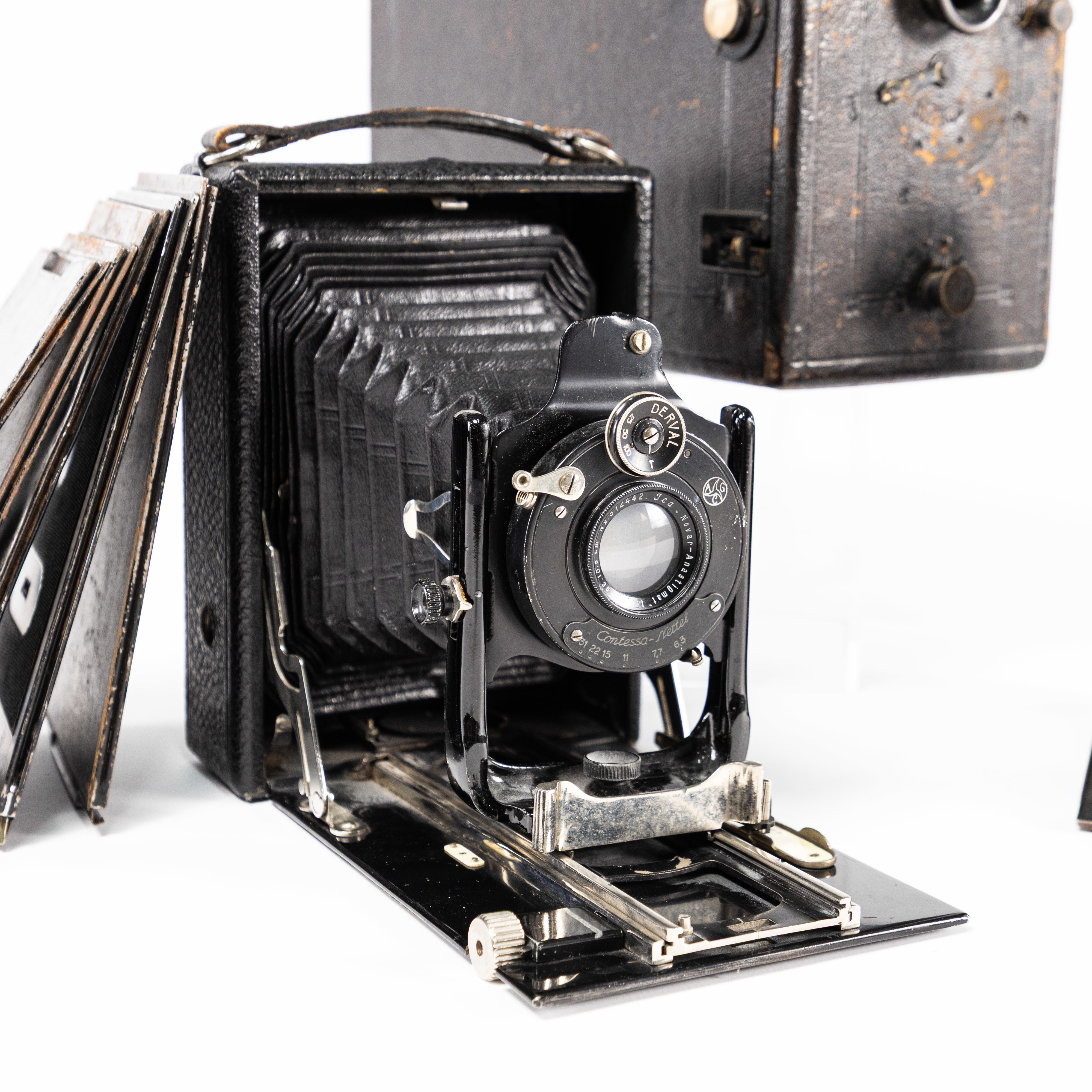 Kameror, 3 st, lådkamera, bälgkameror, Murer's Express, ICA, ACG, kommer med plåtar