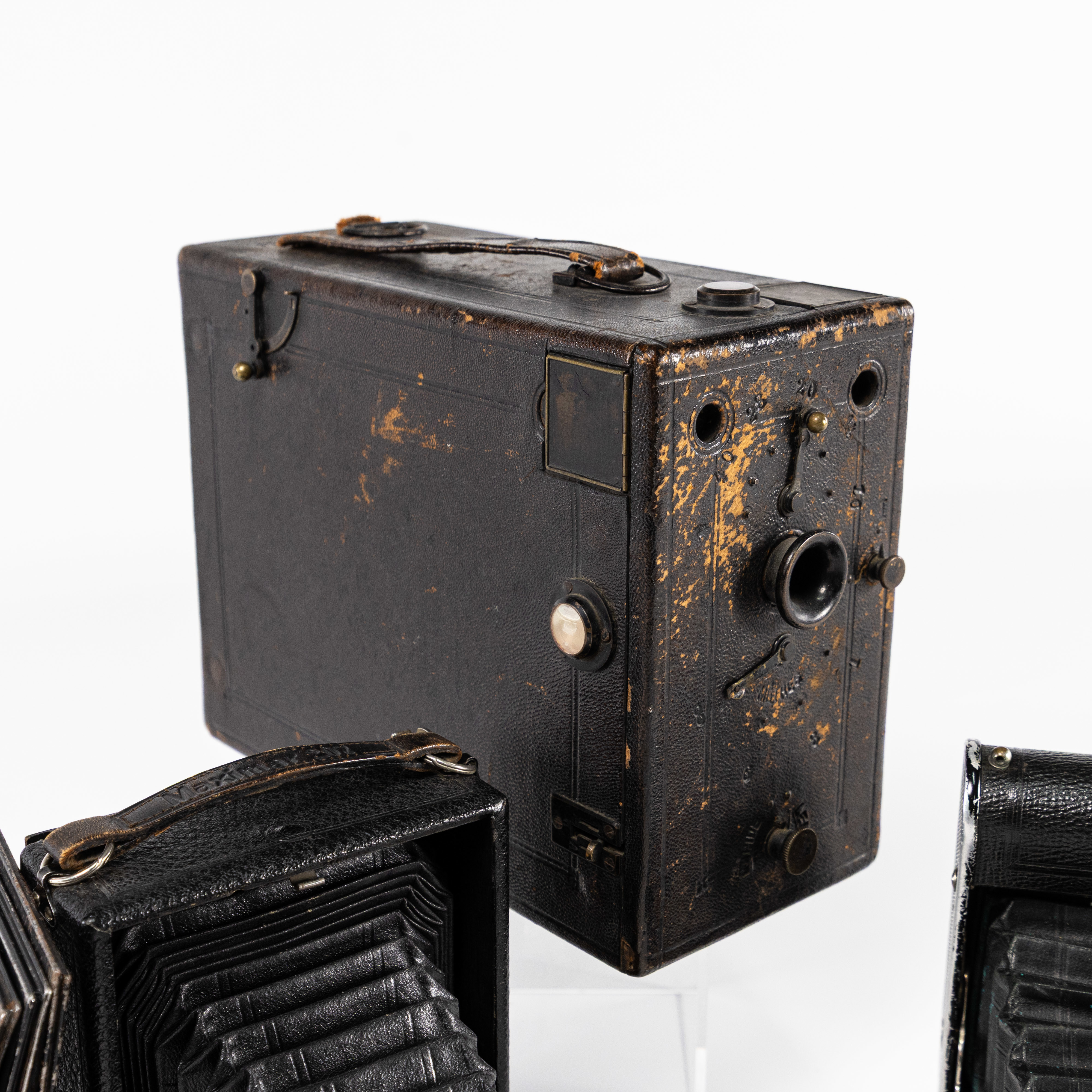 Kameror, 3 st, lådkamera, bälgkameror, bl a Murer's Express