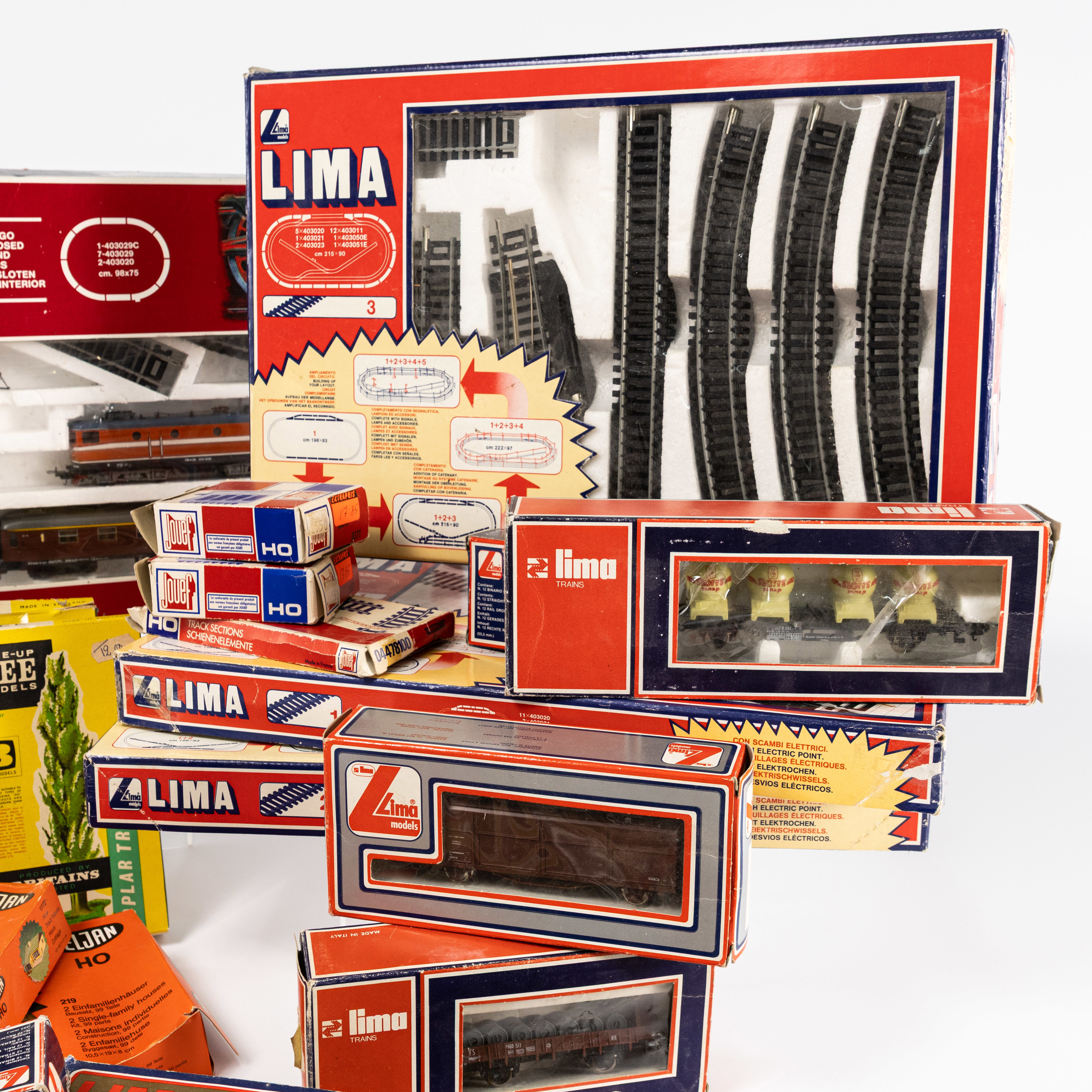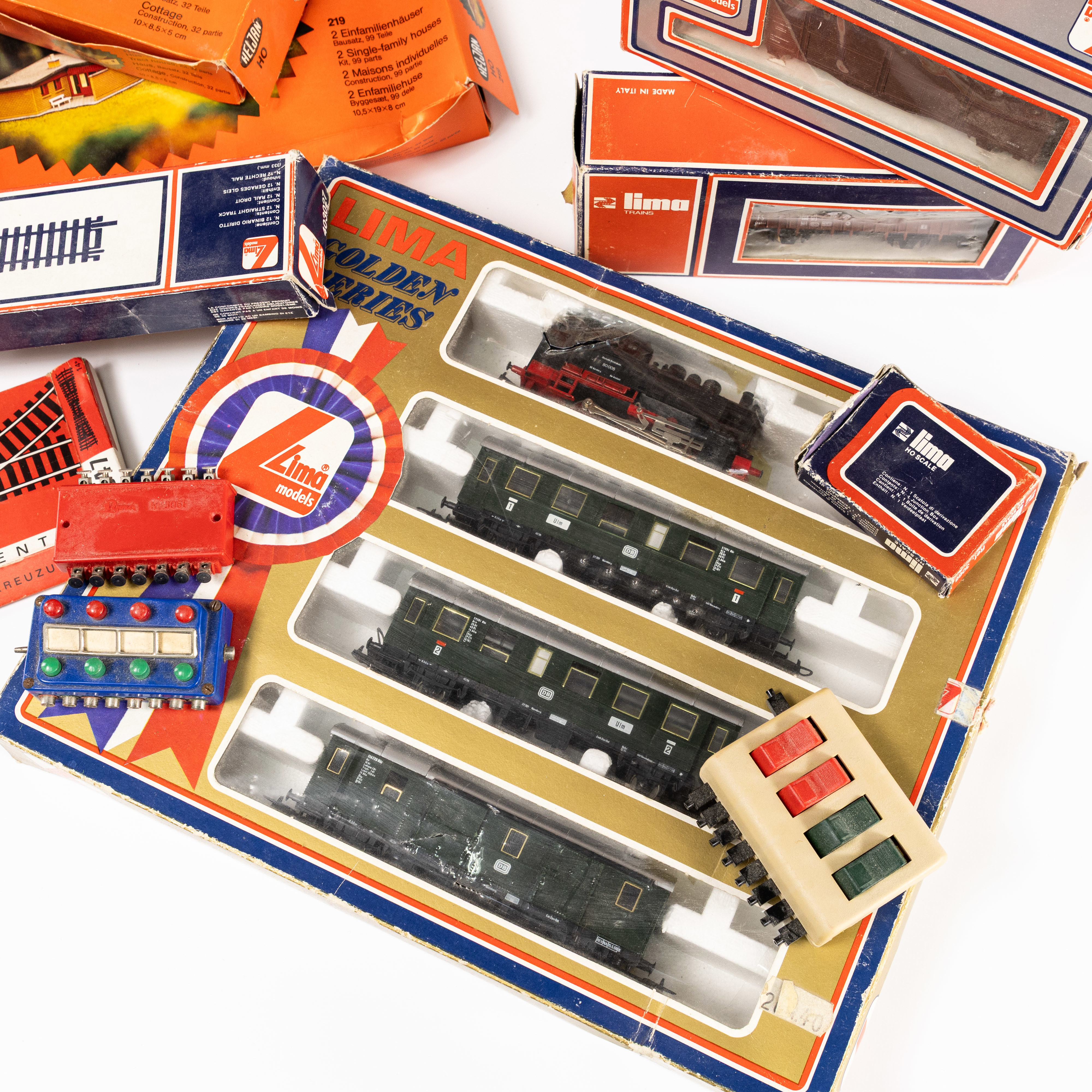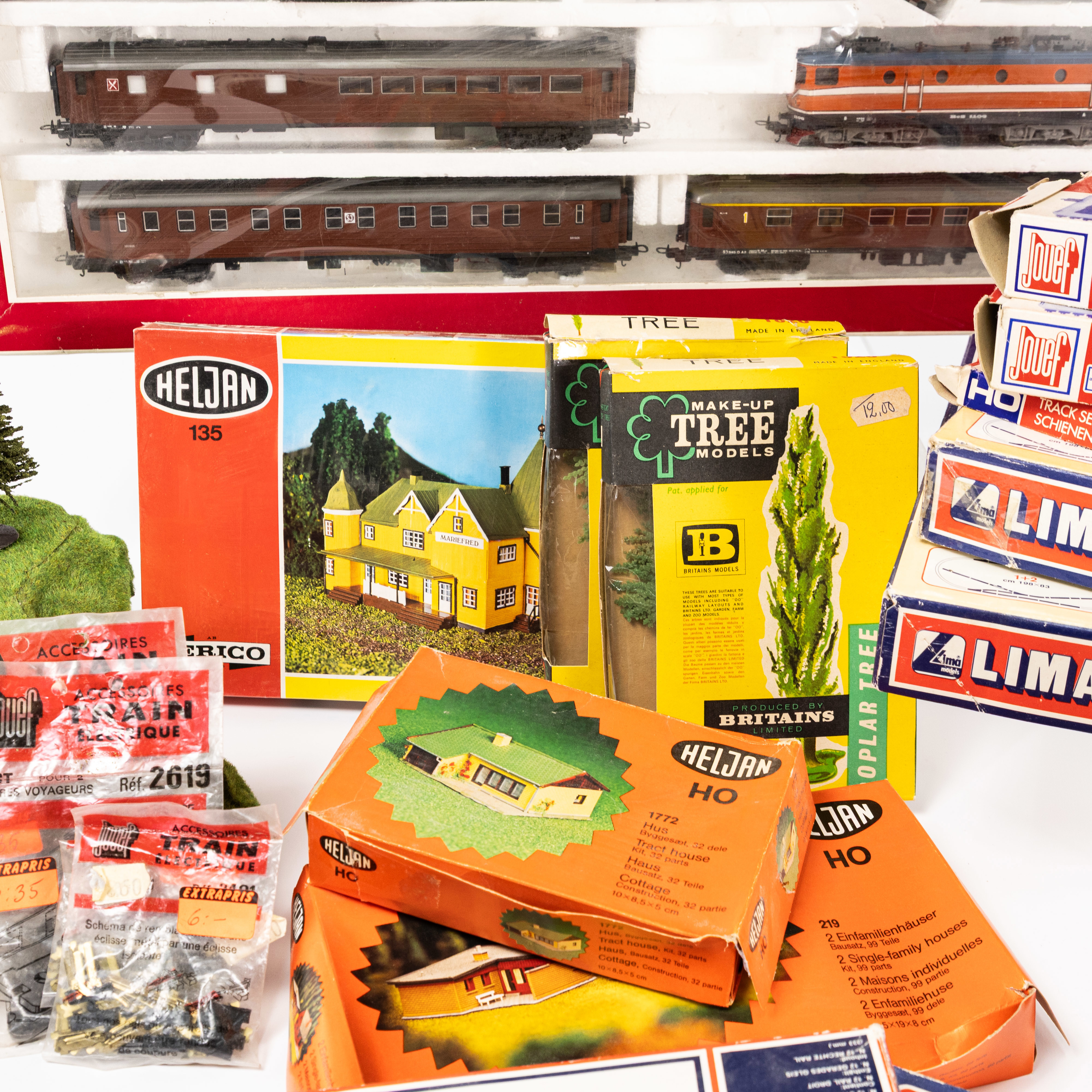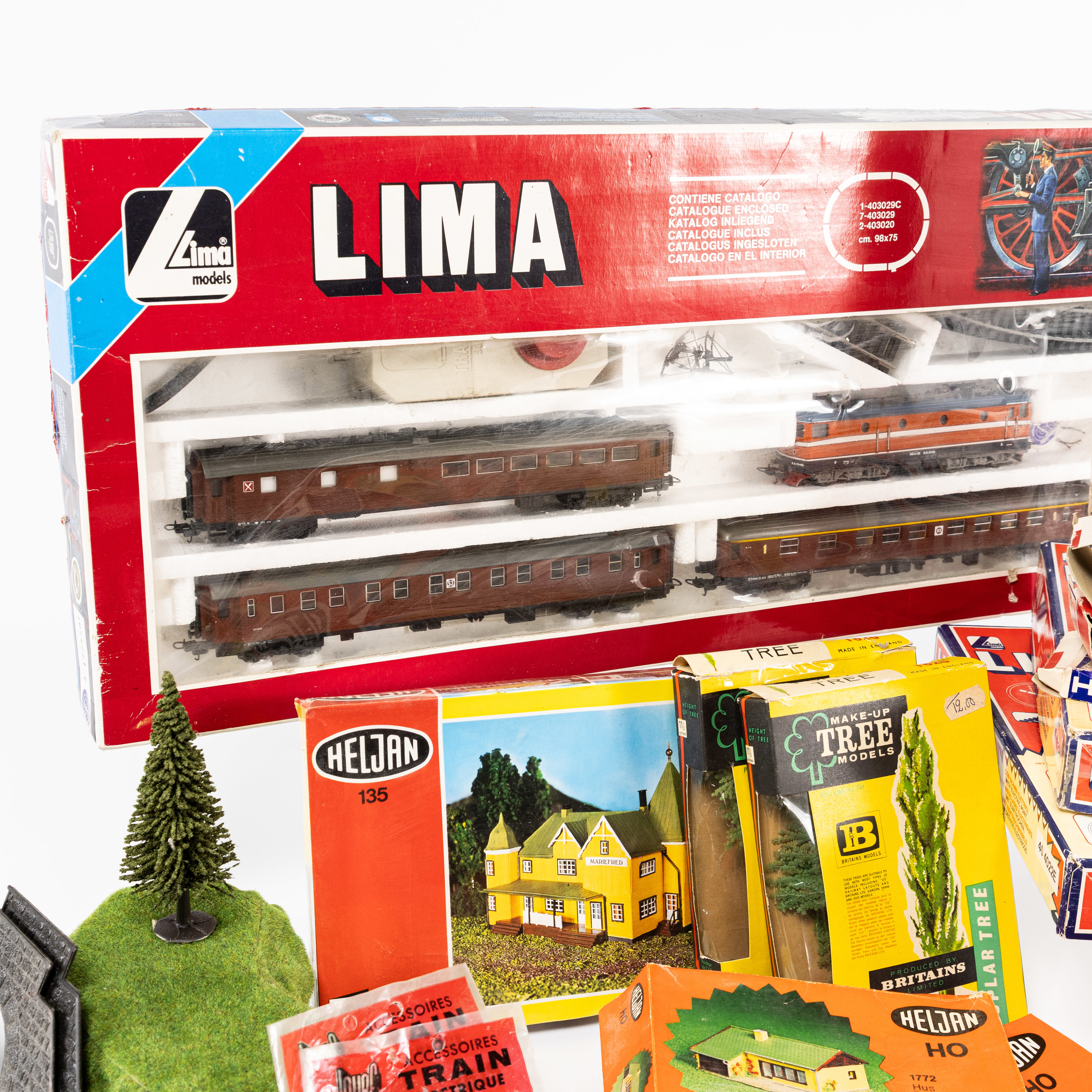 Modelltåg, ett parti, Lima, räls, lok, vagnar och landskap.