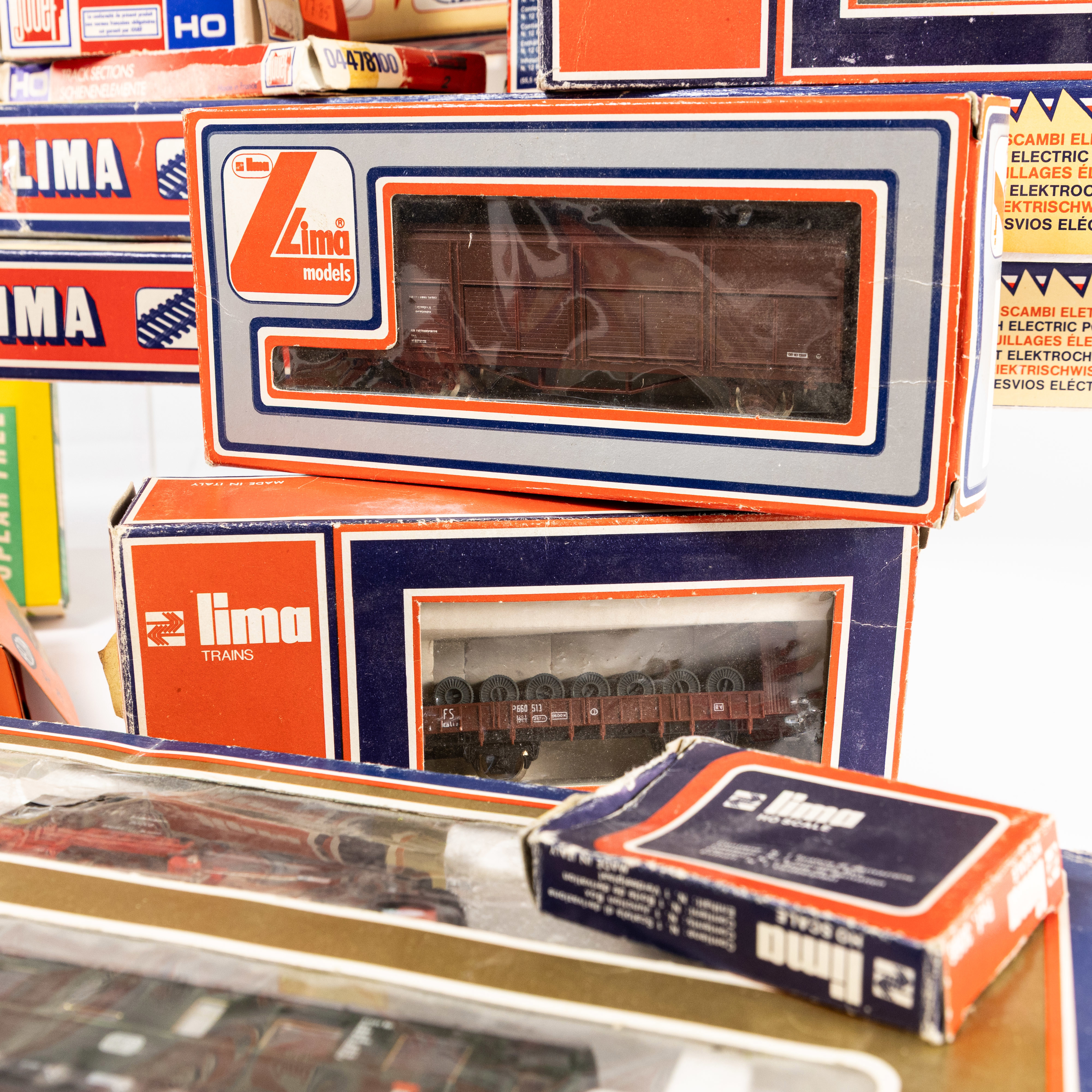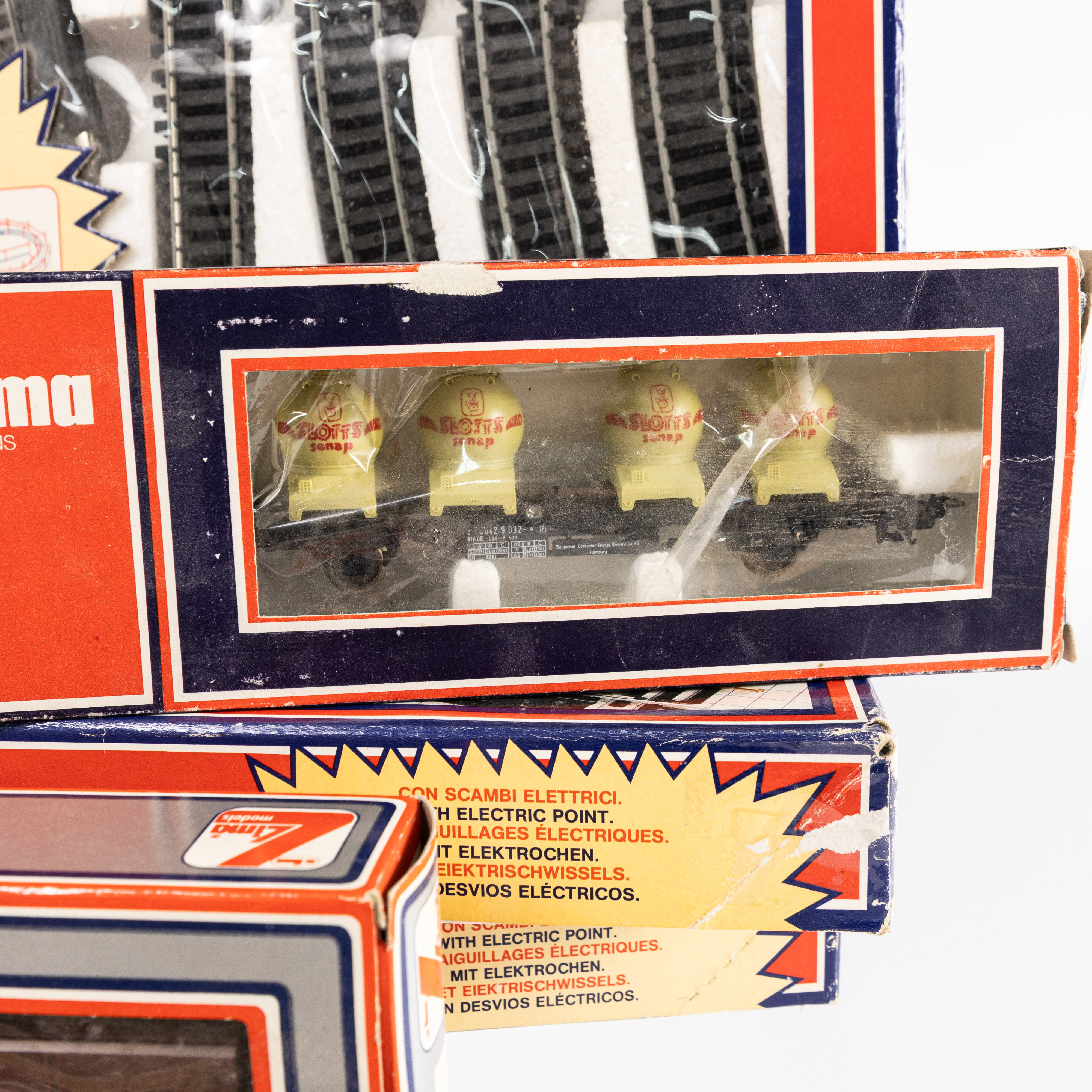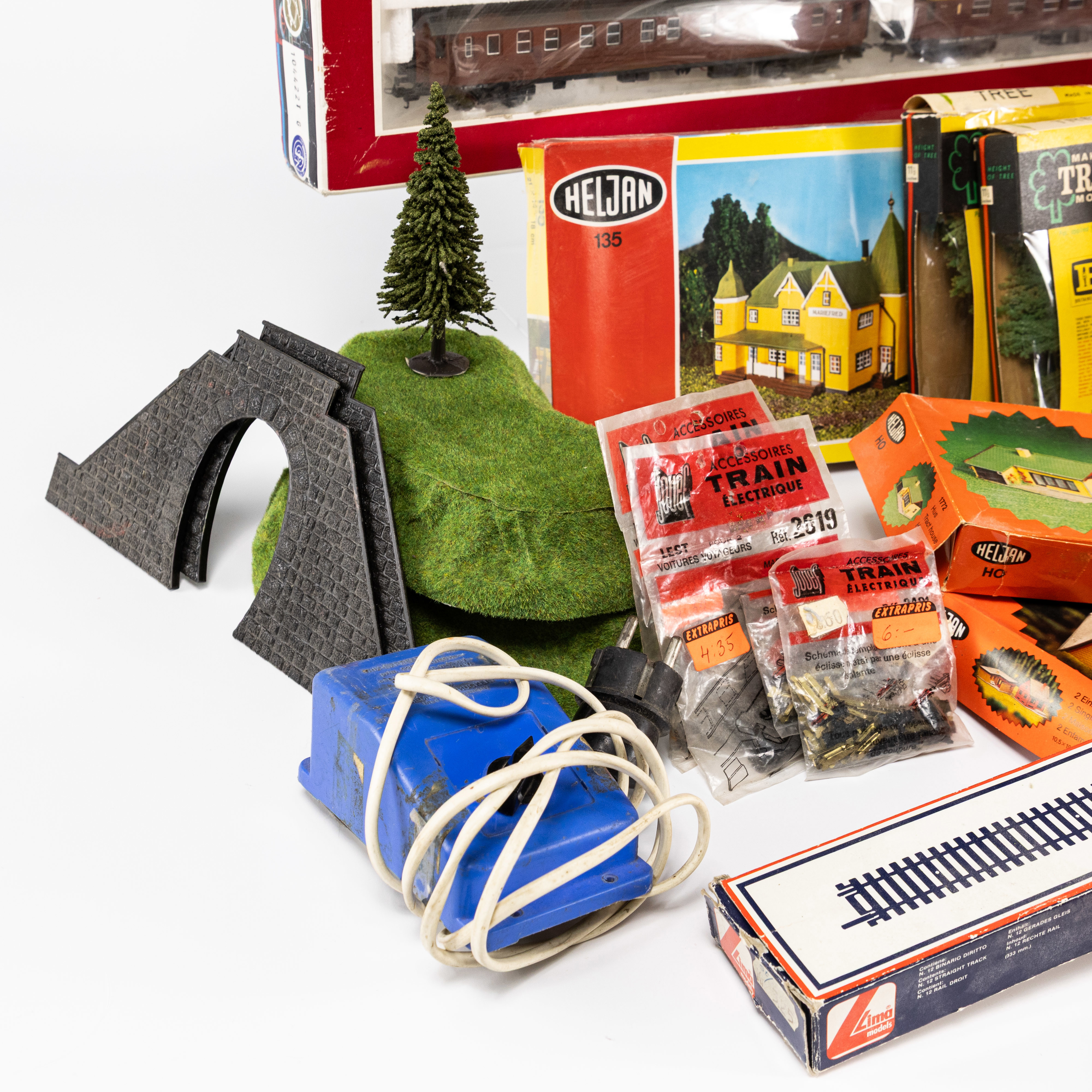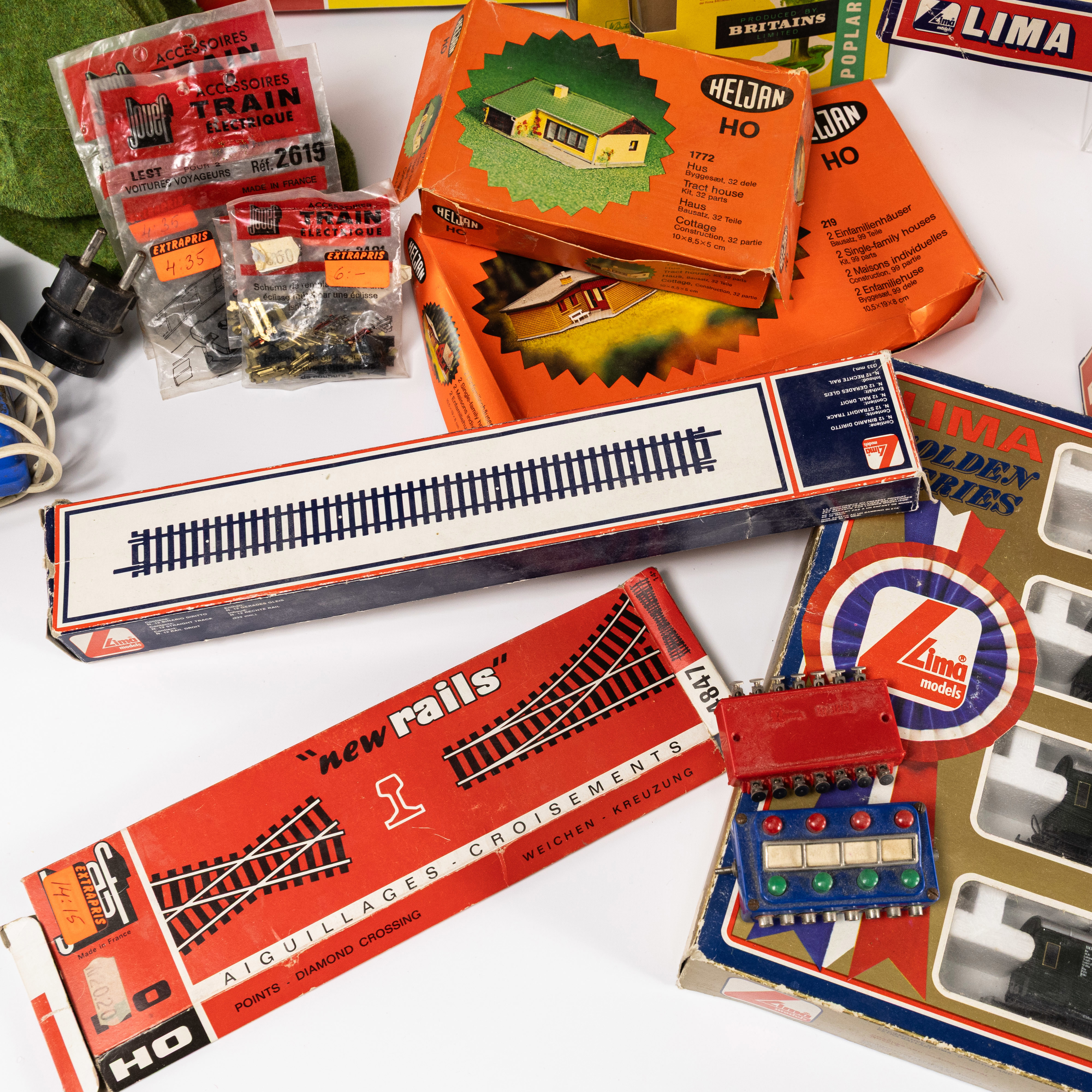 Modelltåg, ett parti, Lima, räls, lok, vagnar och landskap.