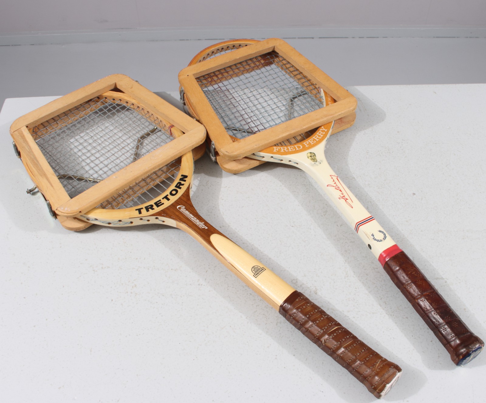 2st tennisrack, 1st "Tretorn Commander" samt 1st "Fred Perry", 2st racketpressar Dunlop, mindre åldersrelaterat slitage. (vån3)