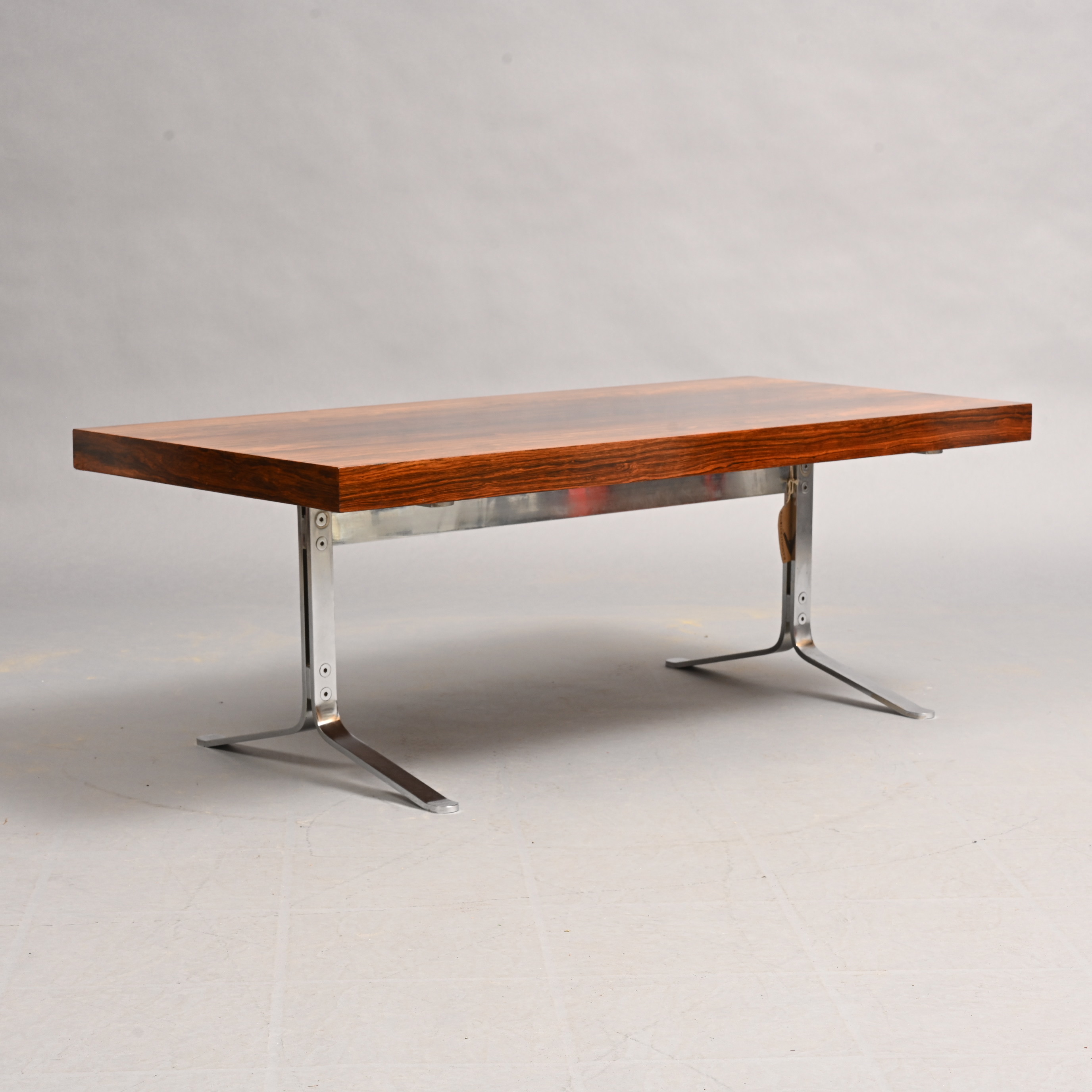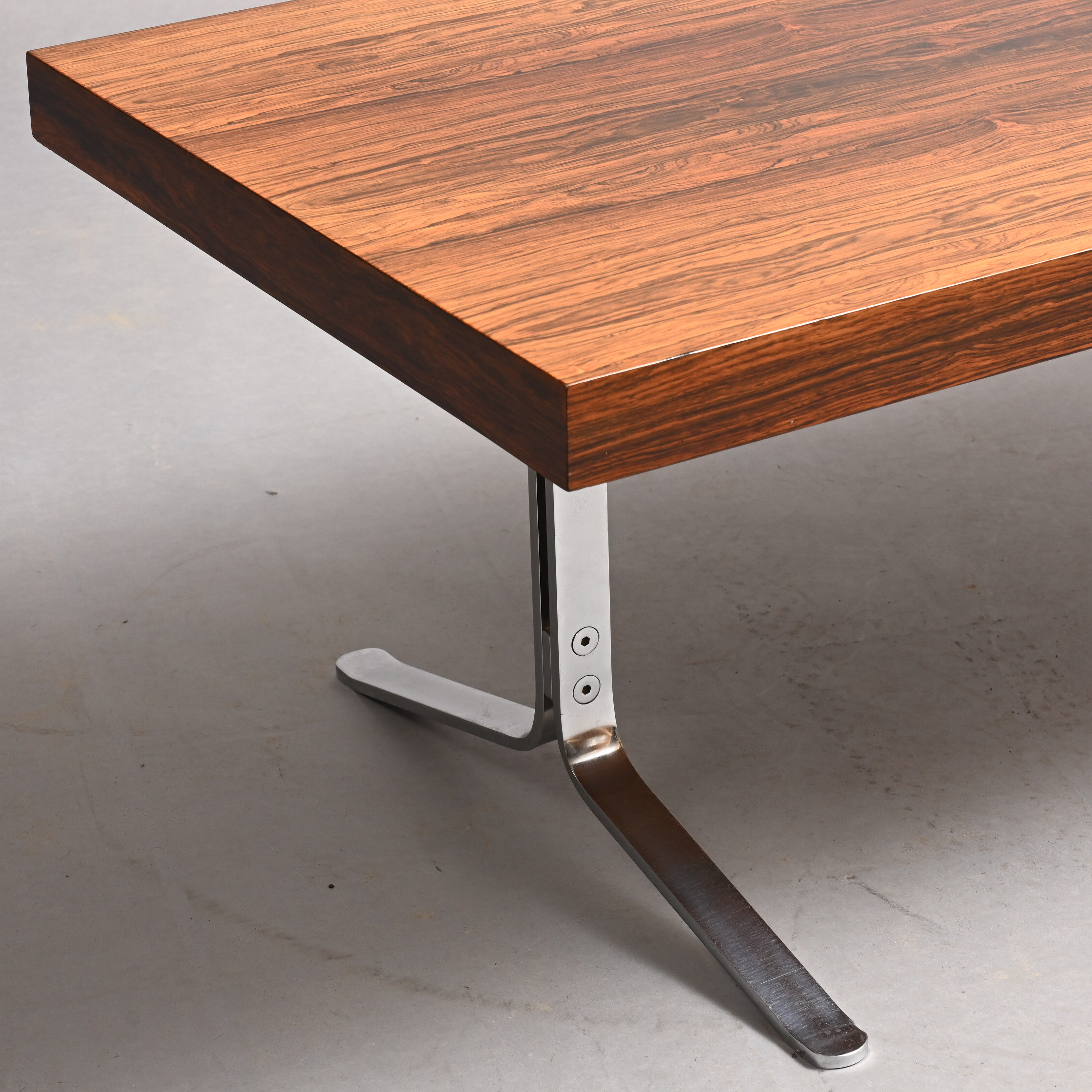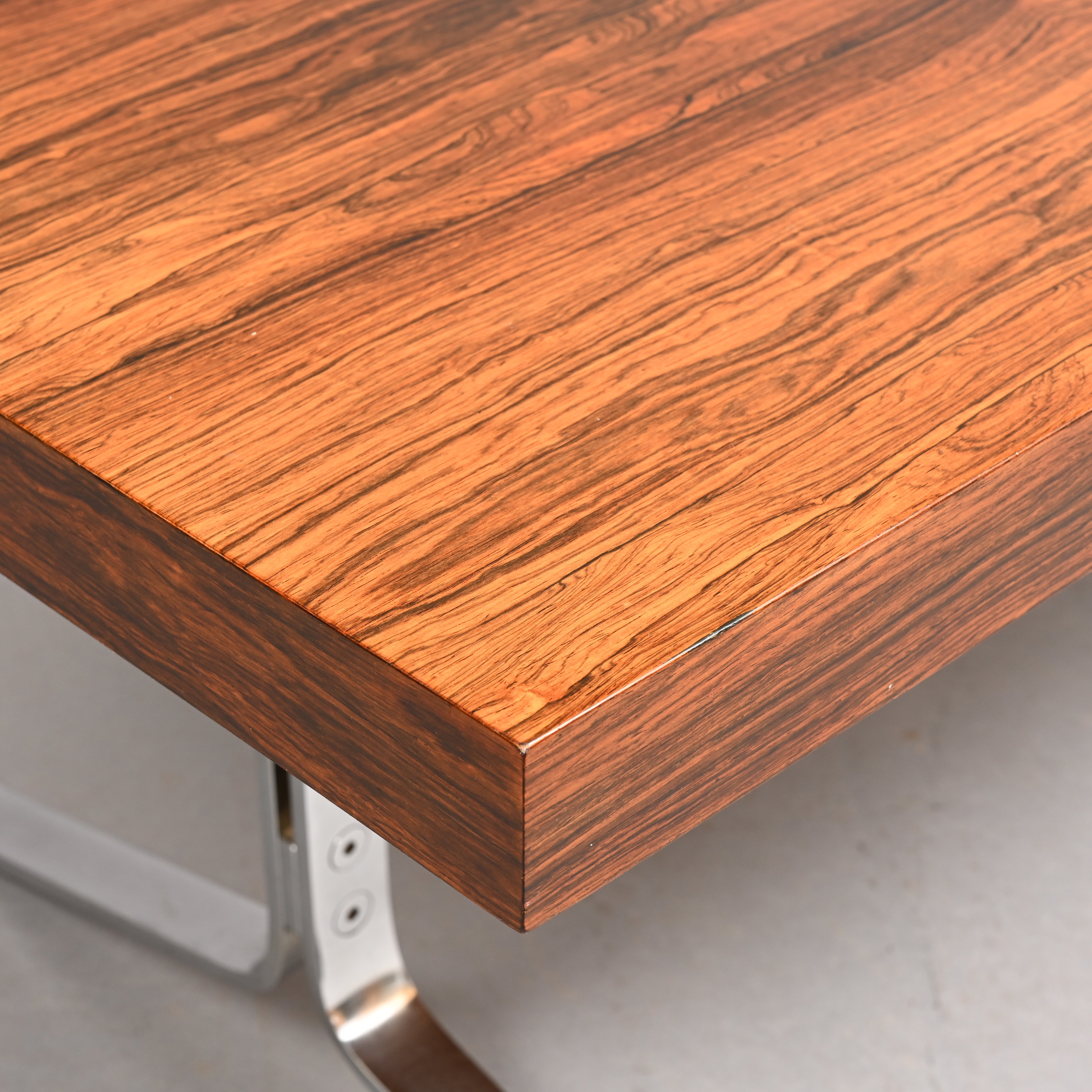 Bordsskiva fanerad med palisander, benställning av kromat stål. CITES-intyg medföljer, höjd 50, 140 x 65 cm