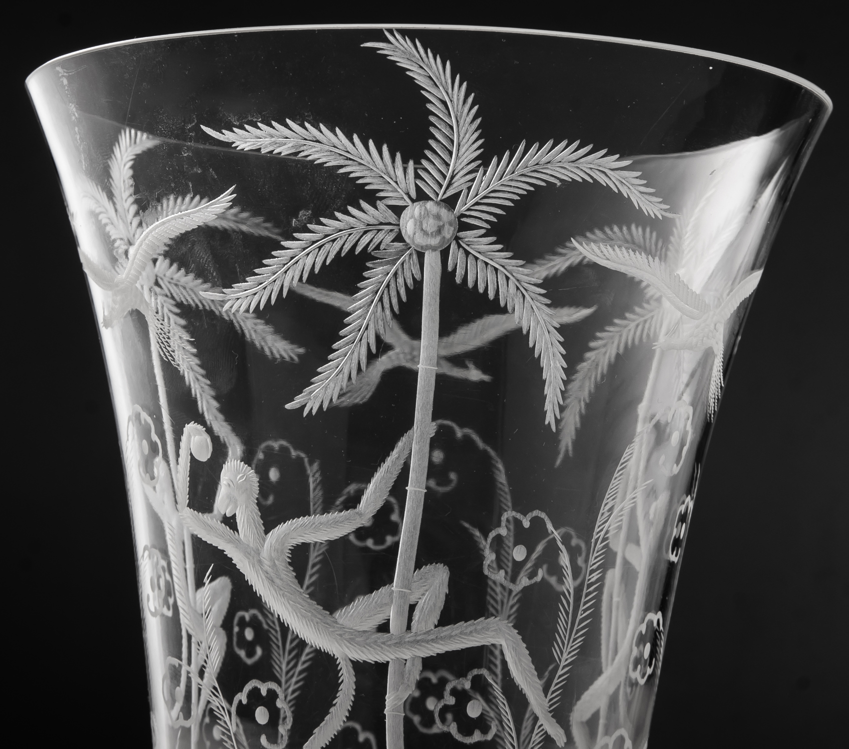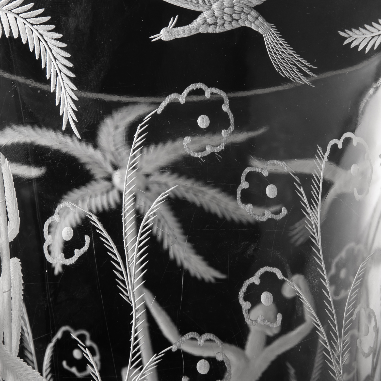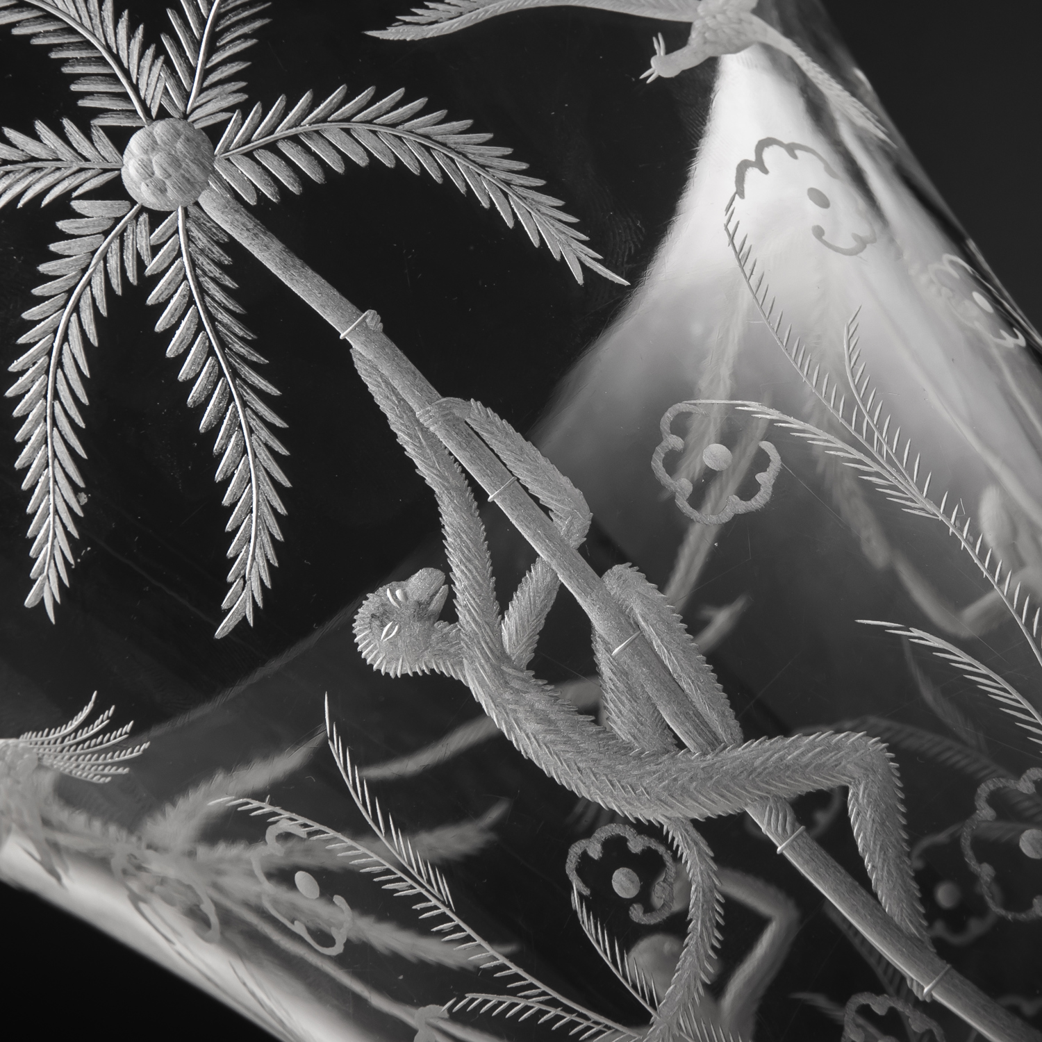 EDWARD HALD, "Urskogen", vas, Orrefors 1924, graverad dekor av apor och fåglar i urskogsvegetation, signerad: Orrefors Hald 378.24.J.02.