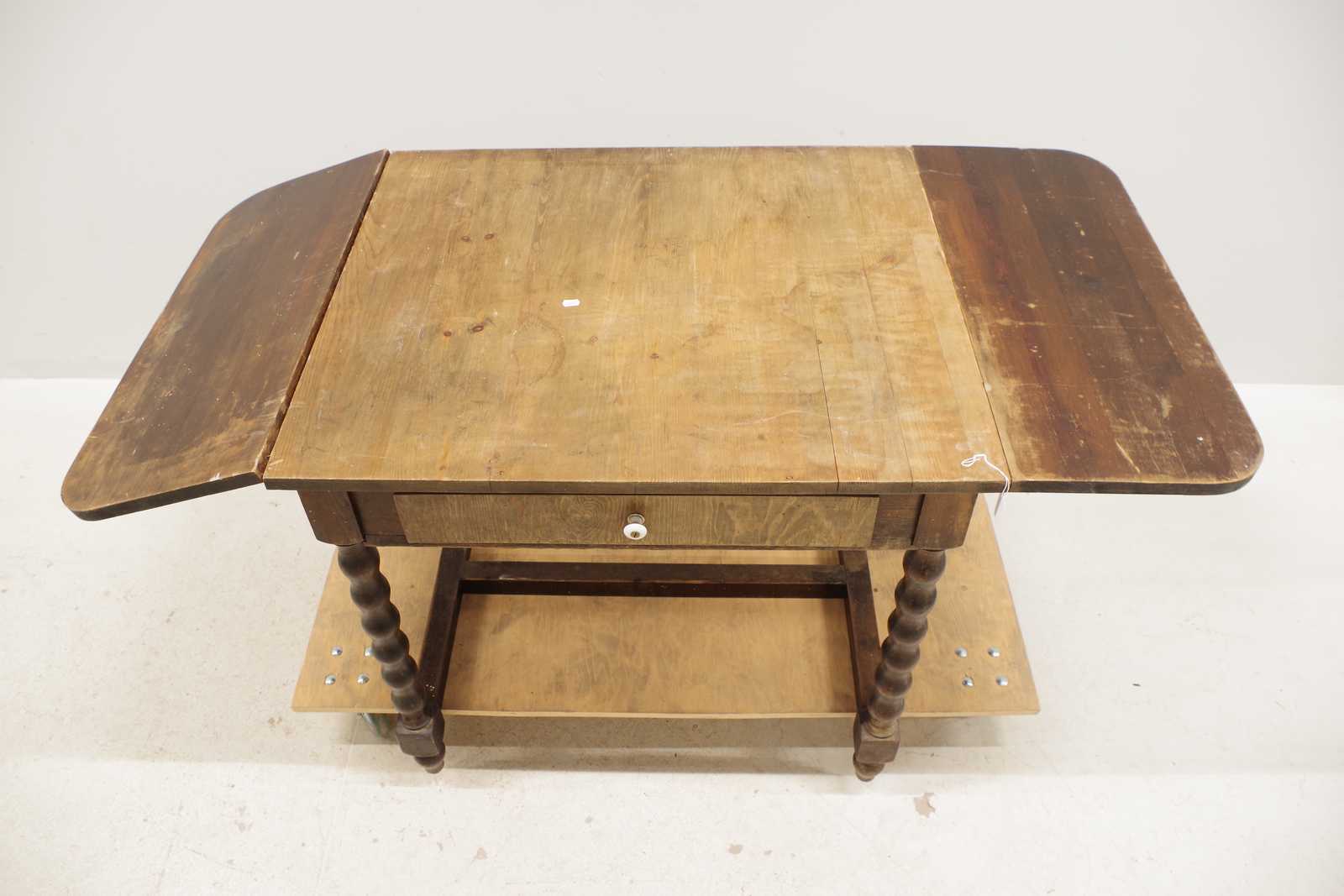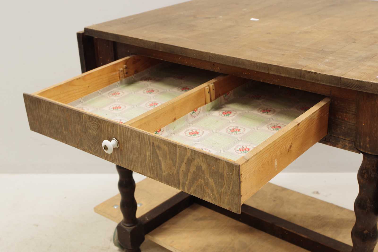 Auktioner KLAFFBORD med låda, 1900 talets första hälft. H:77x 70x 80cm + 2st klaffar 30cm/st (slitage, fläckar)