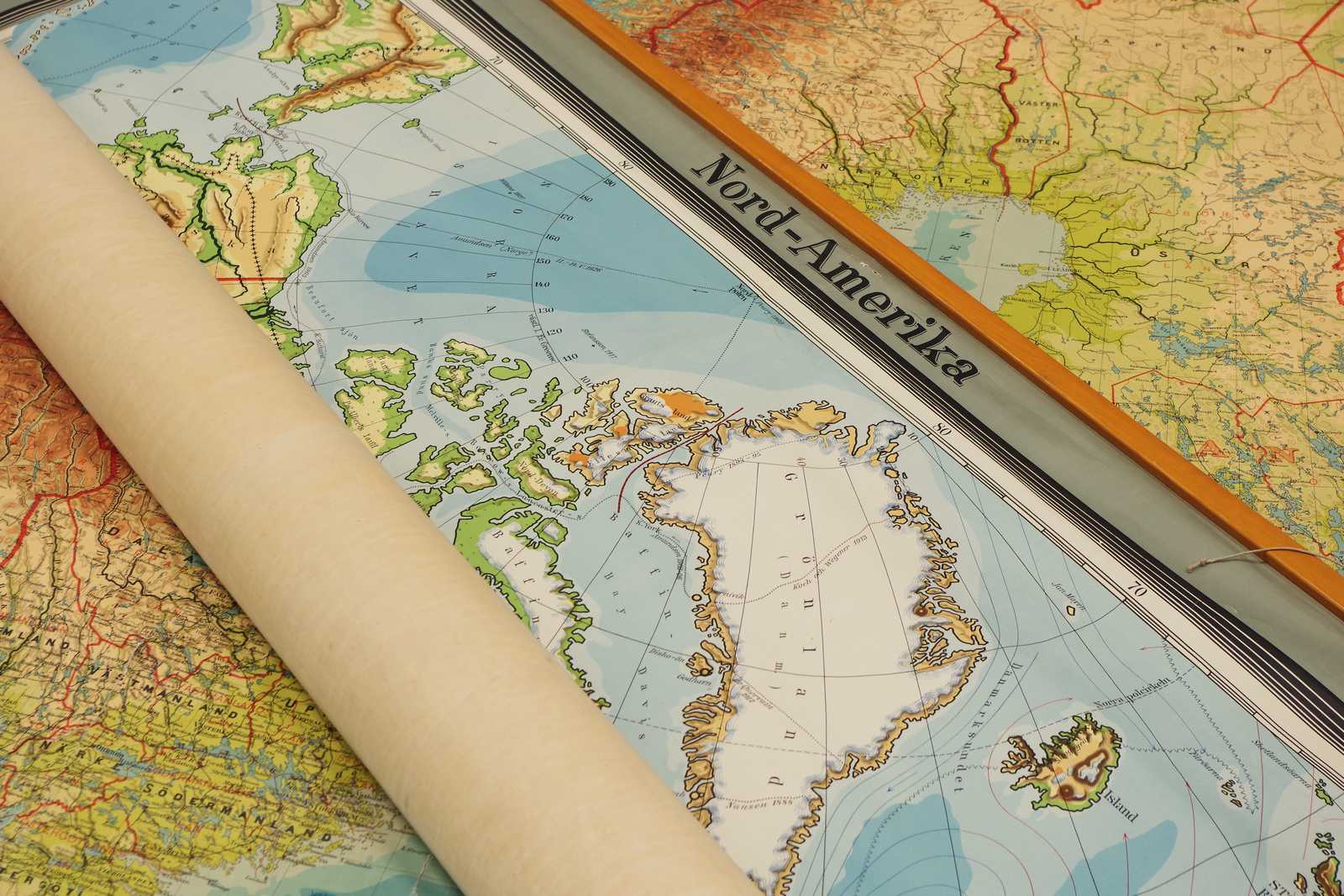 Bilder SKOLKARTOR 2st, bl.a "Norden" 155x200cm (slitage, fläckar, skador)