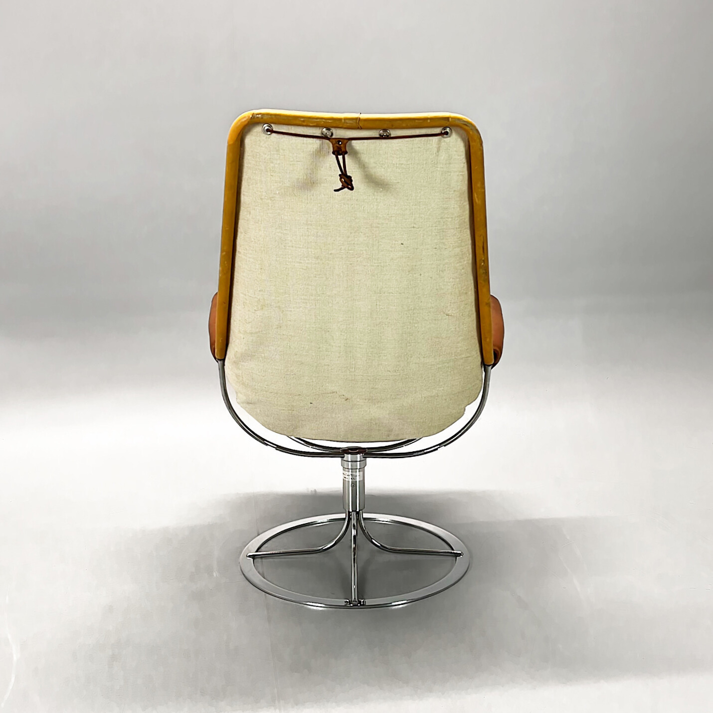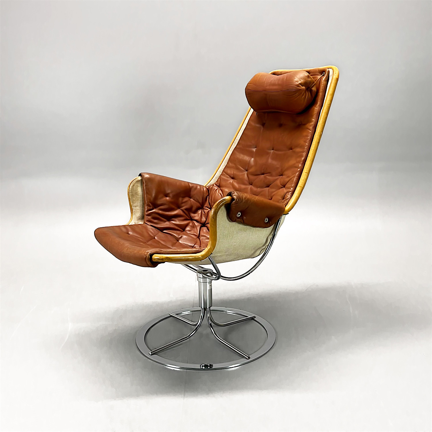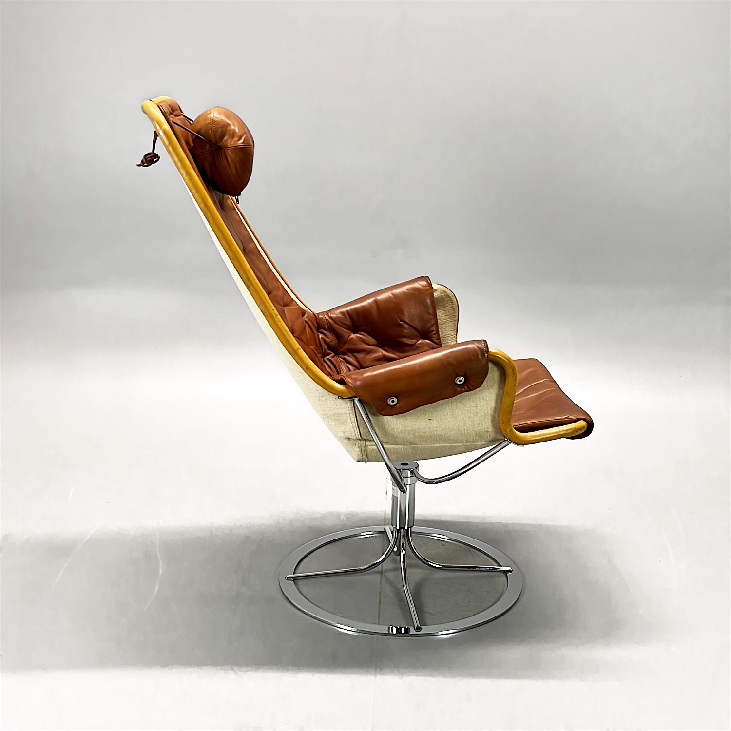 Fåtölj Jetson 69 från Dux, design Bruno Mathsson. Förkromad och svängbar underrede, klädsel och nackkudde i brunt läder, ljusare kant och canvas.
