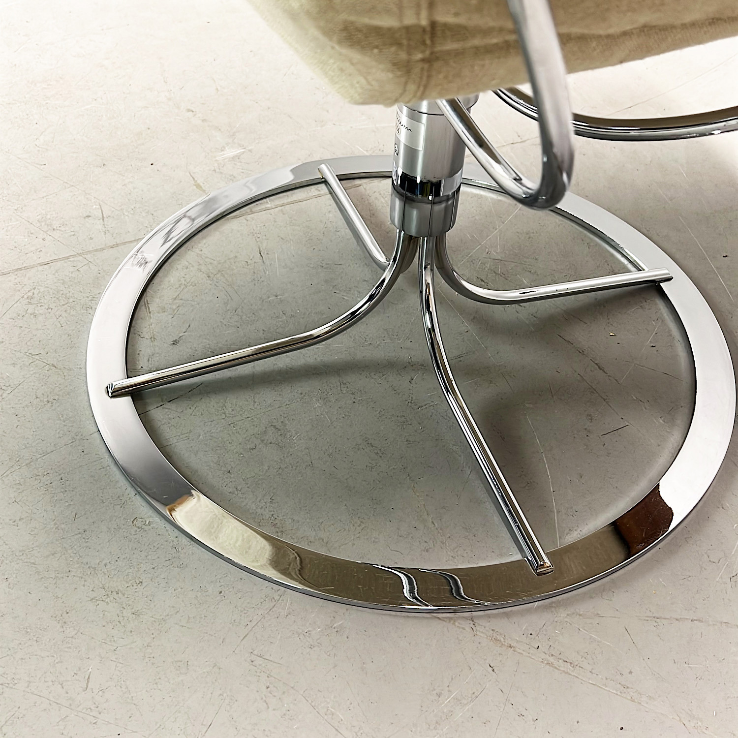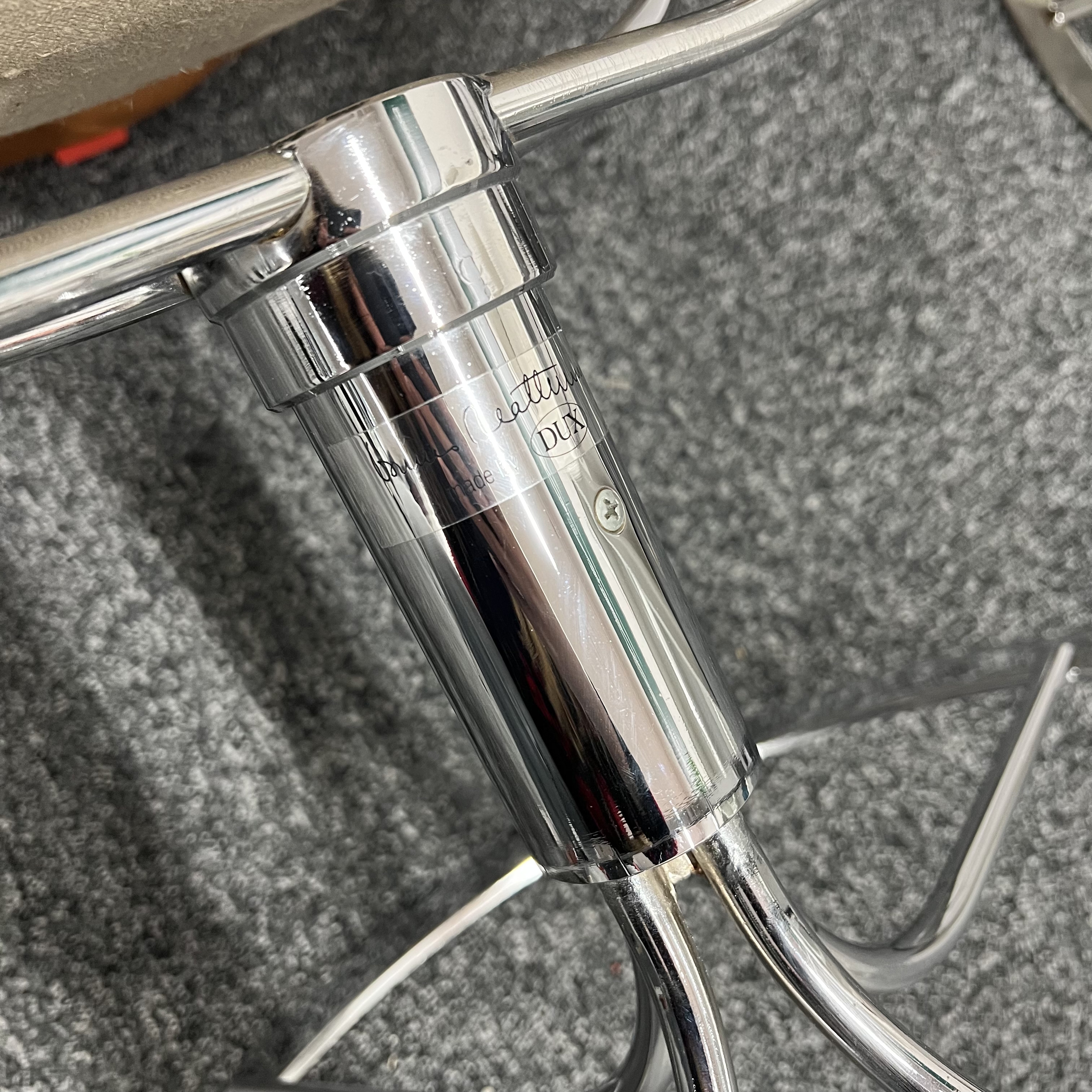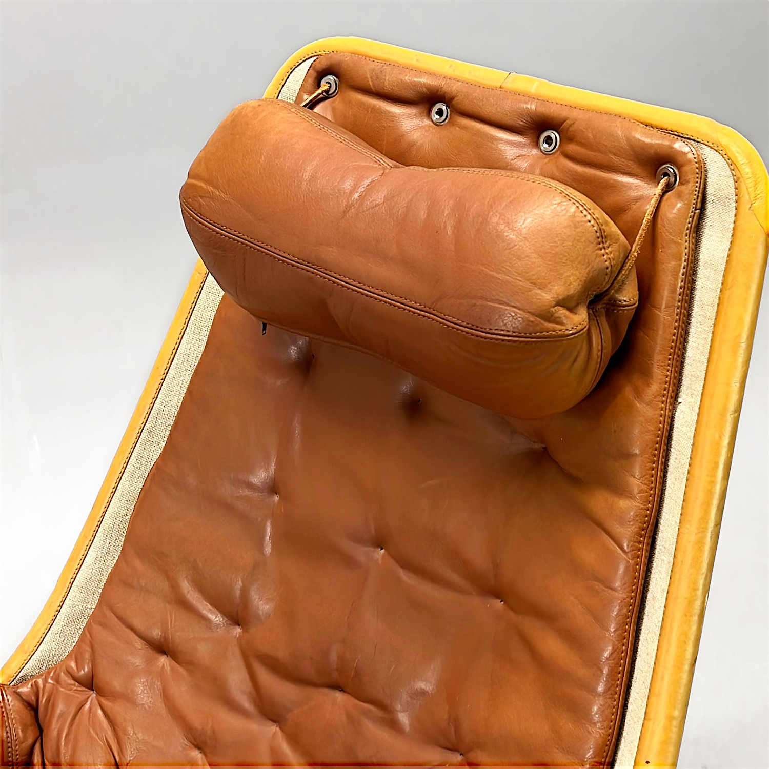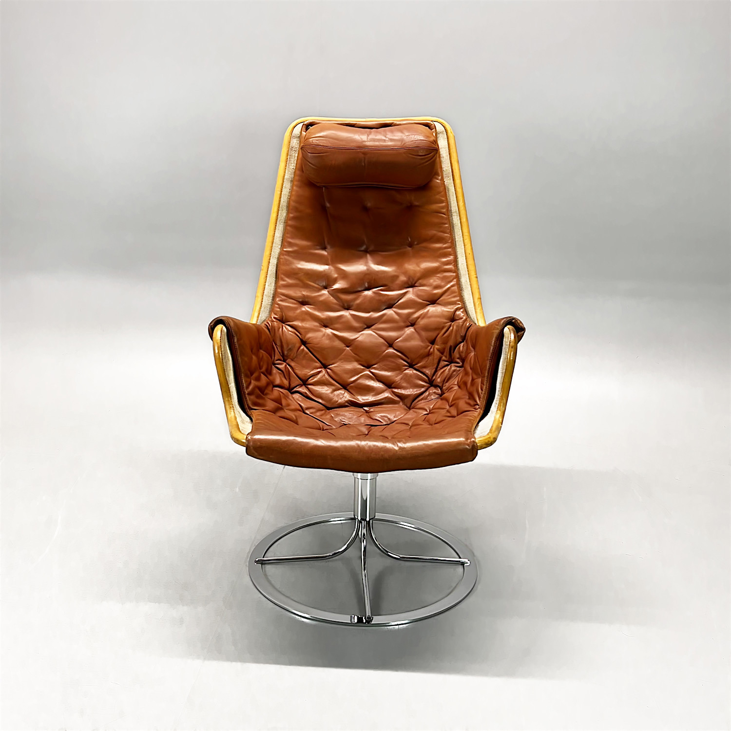 Fåtölj Jetson 69 från Dux, design Bruno Mathsson. Förkromad och svängbar underrede, klädsel och nackkudde i brunt läder, ljusare kant och canvas.