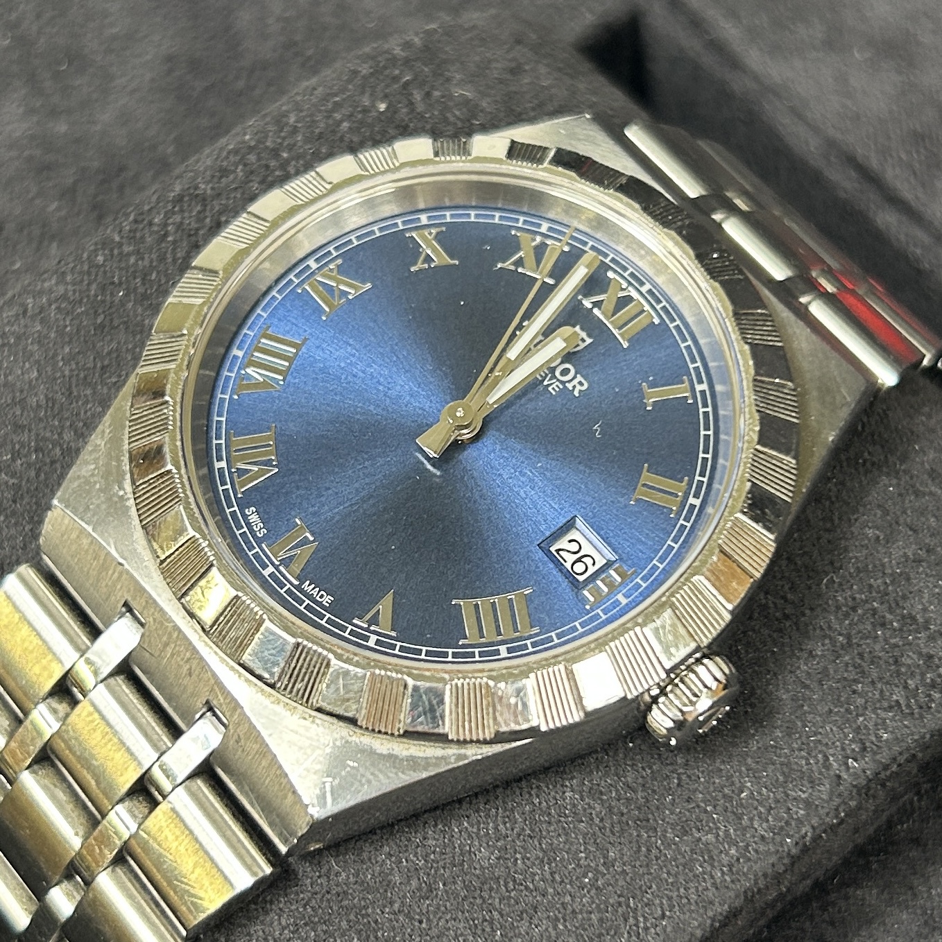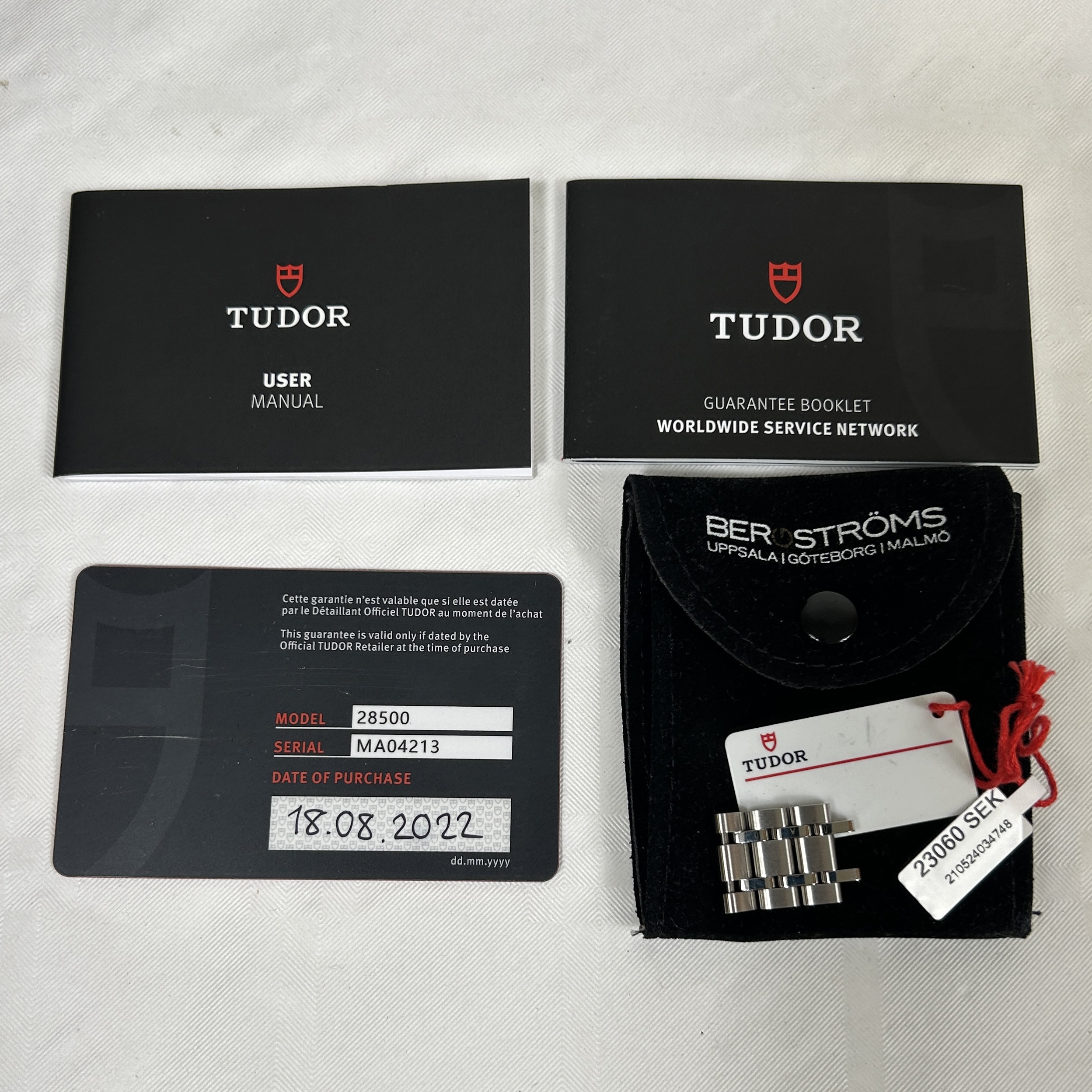 Blå urtavla, safirglas. Garantikort, garantihäfte, box, ytterkartong. Modell: 28500. Serienr: MA04213. Storlek: 38 mm. År: 2022. Extralänk medföljer.