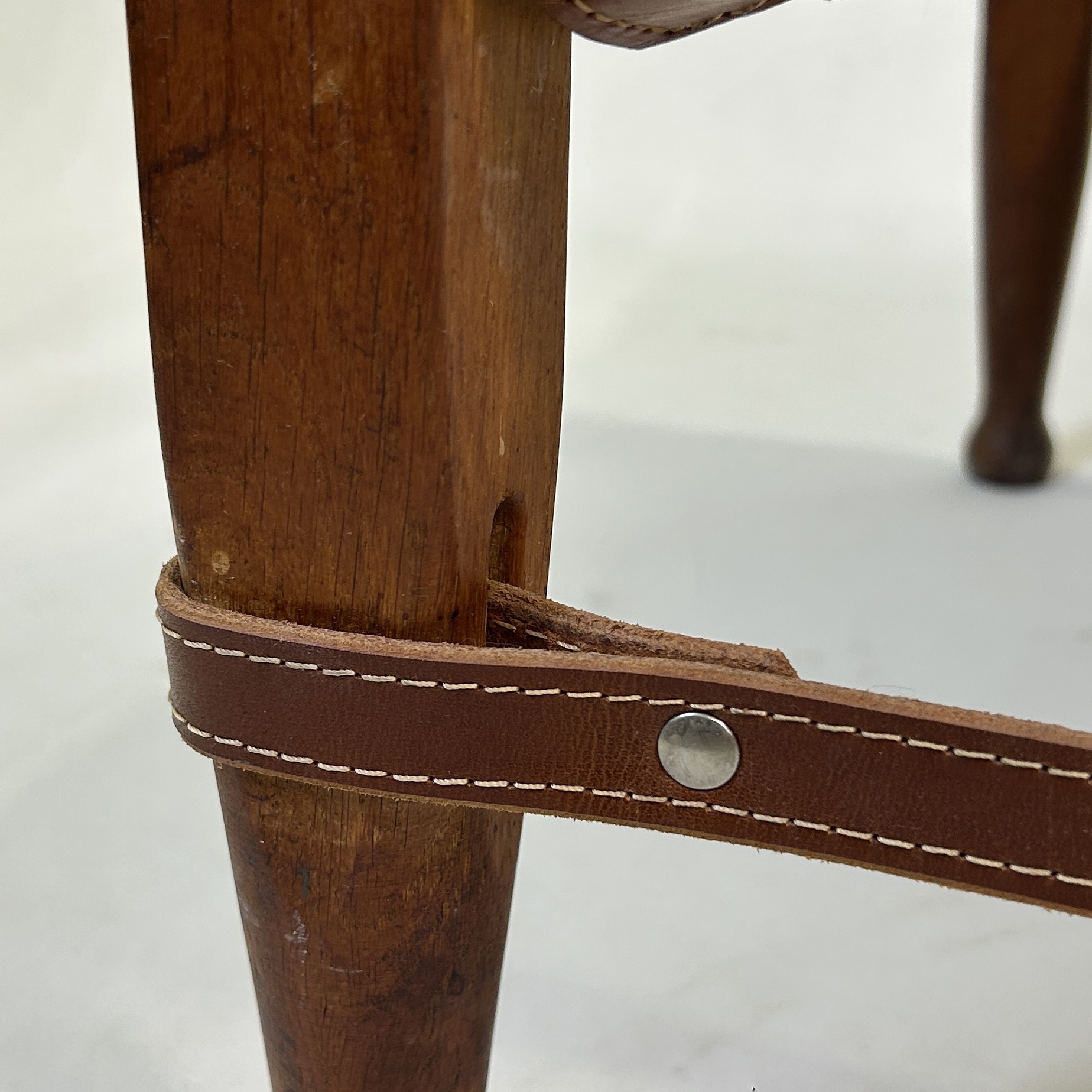 Stomme i teak, samt cognac skinn. Aage Bruun & Søn. Sitthöjd 45, höjd 69 cm.