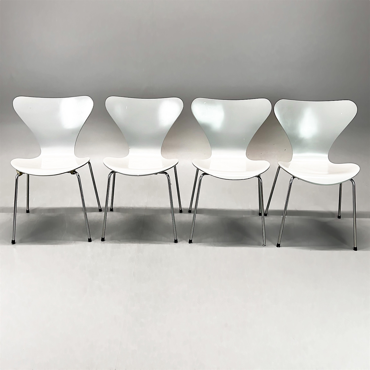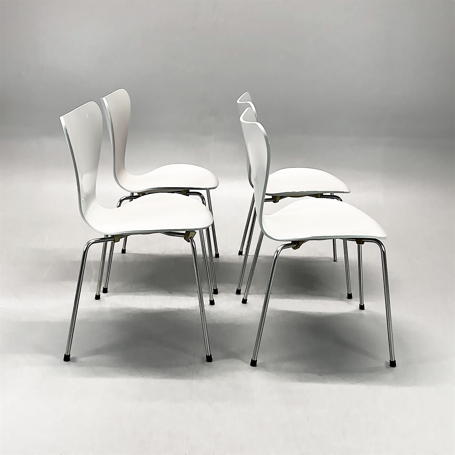 Caféstolar, 4st, modell "Sjuan 3107" från Fritz Hansen. Design Arne Jacobsen. Lackerade sitsar i grå, benställning i förkromat stål.