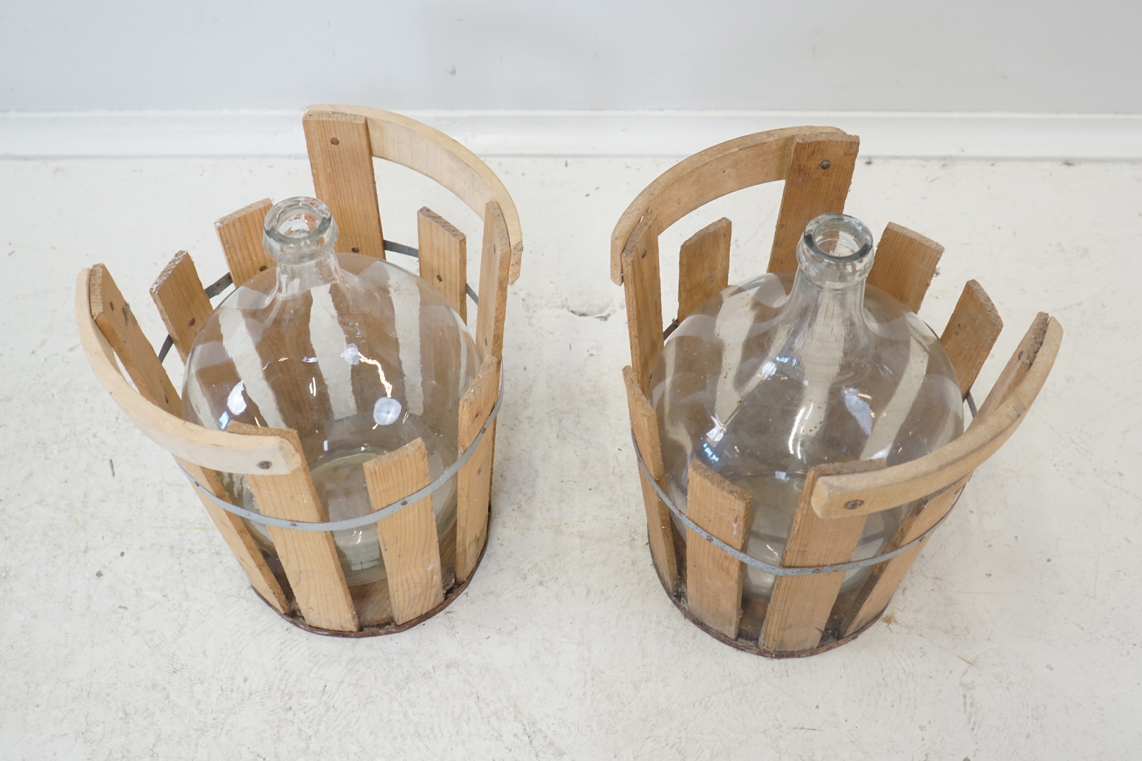 Bilder Damejeanner, 2 st, glas, i träställning.