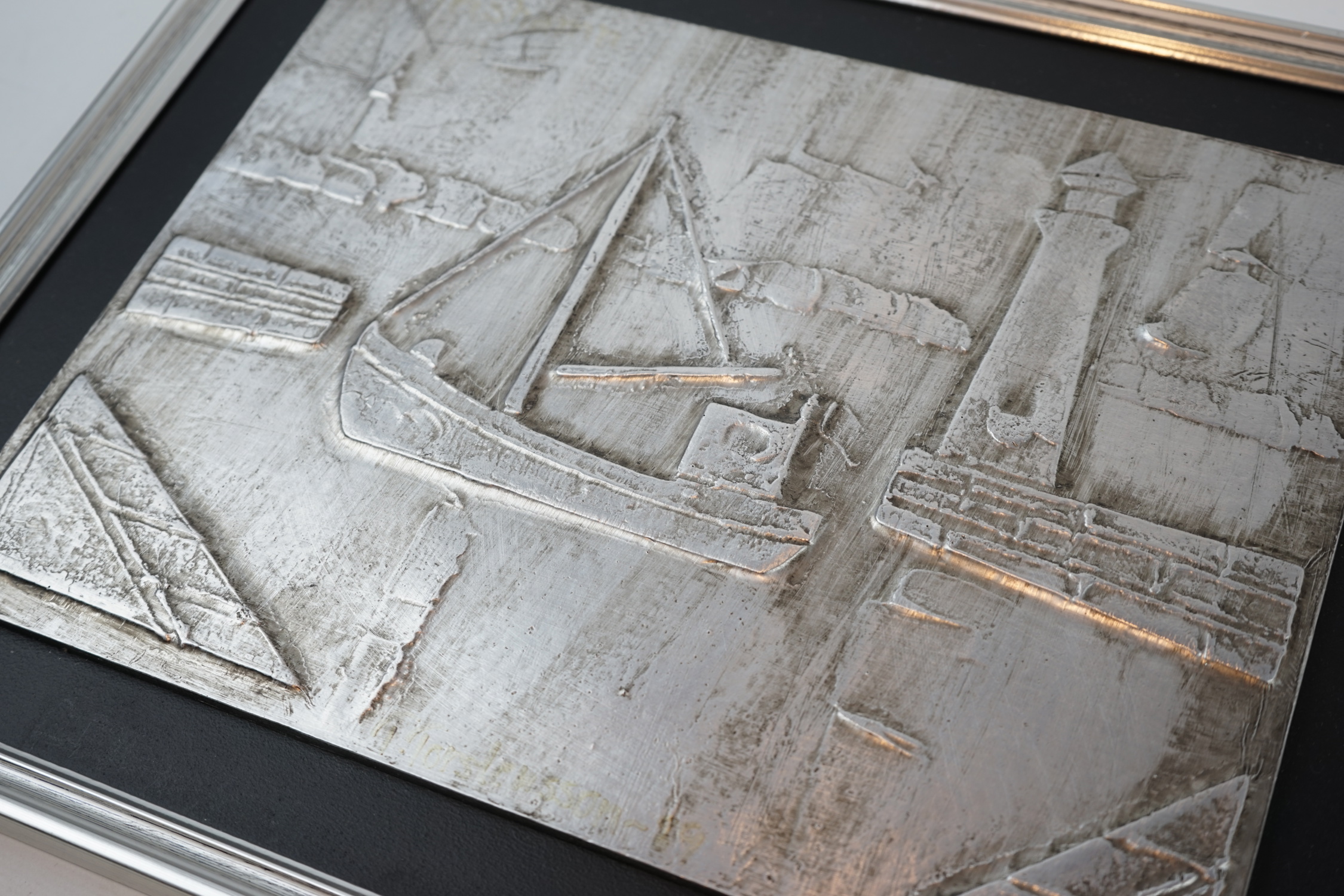 Bilder Torsten Torstensson, "Simrishamns hamn", tavla, tenn, signerad.