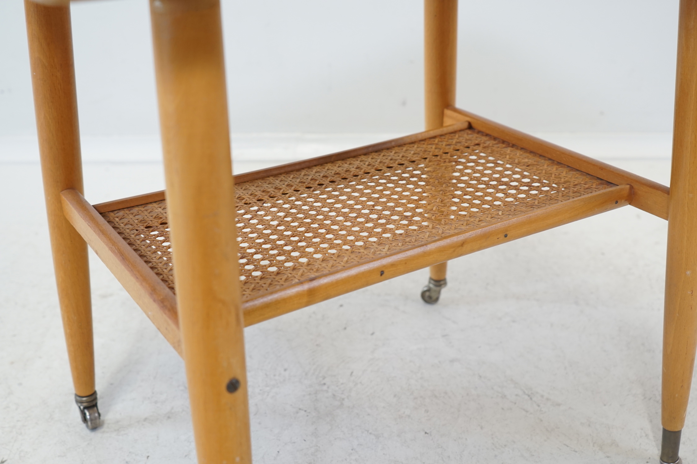Bilder Sidobord, teak, rottinghylla, hjultrissor på två ben, 1900-talets andra hälft.