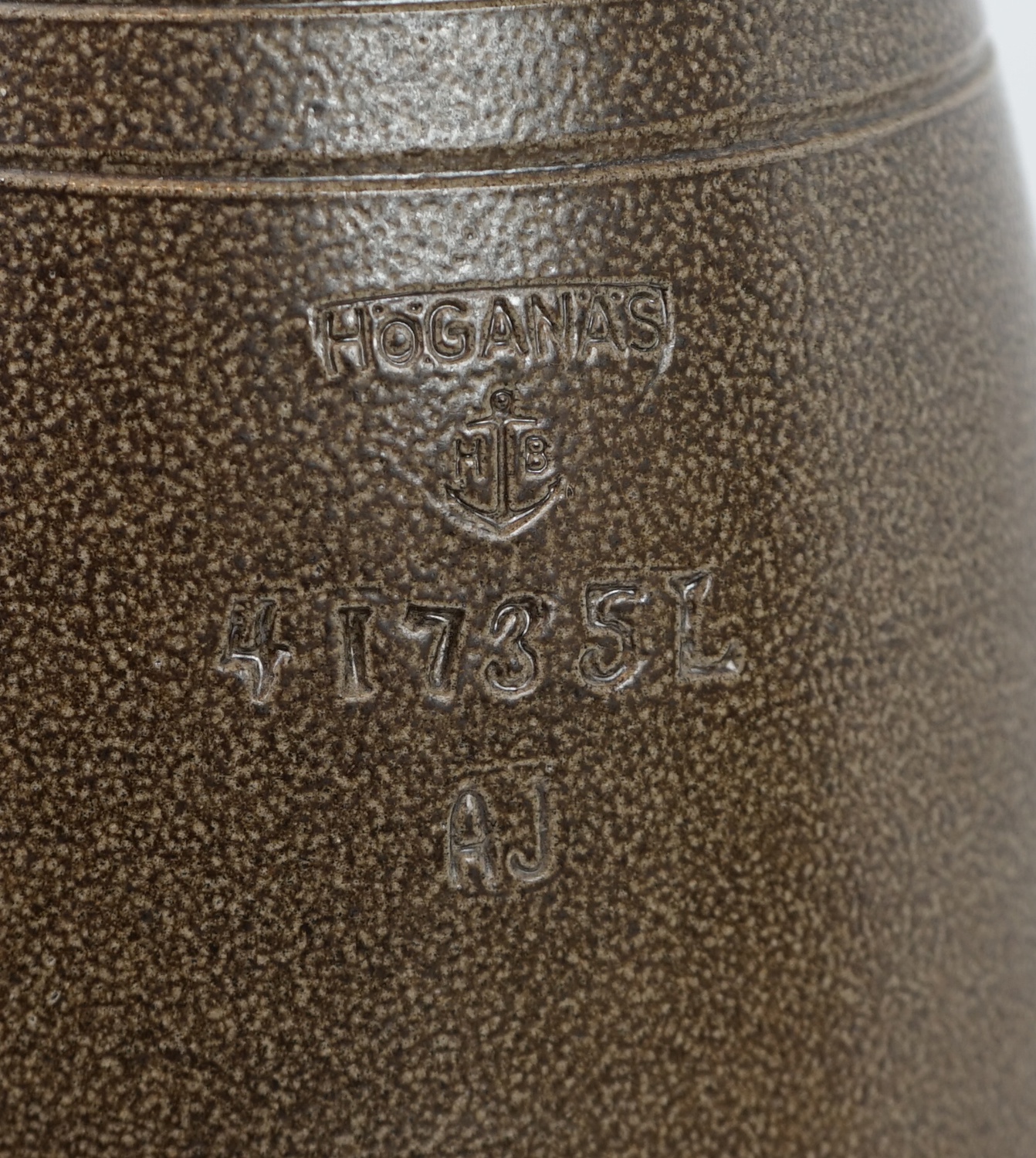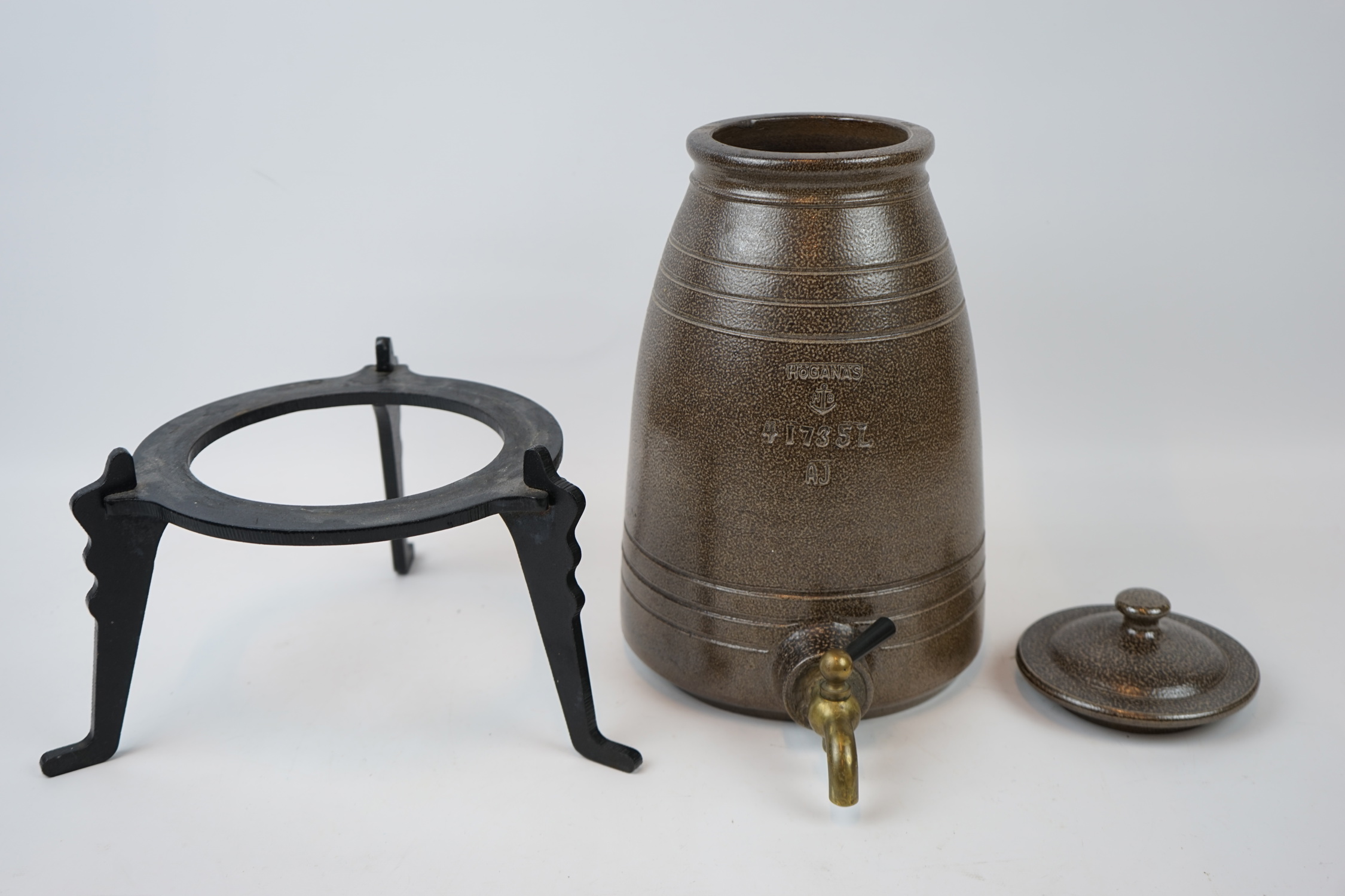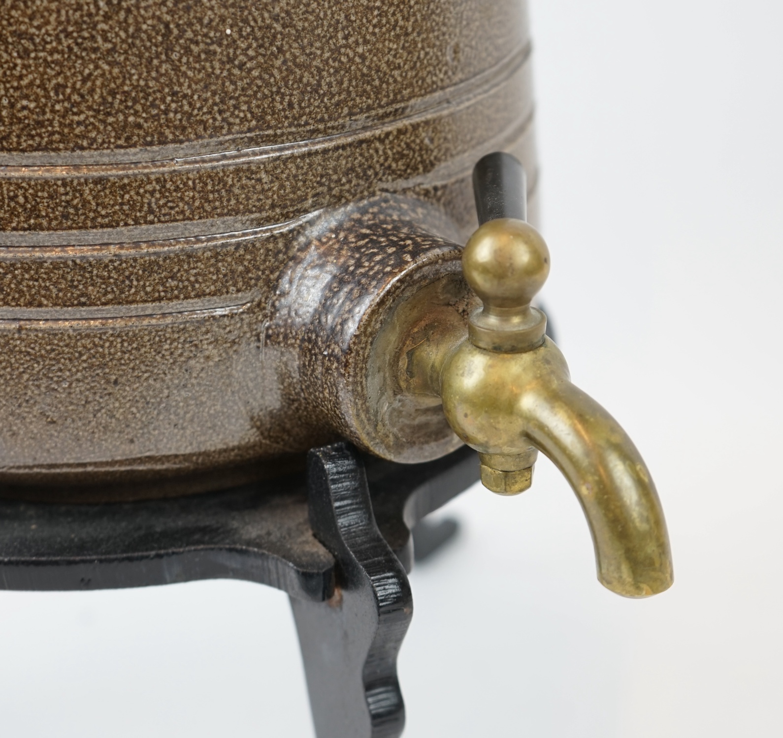 Krus med tappkran på fot, stengods/metall, Höganäs.