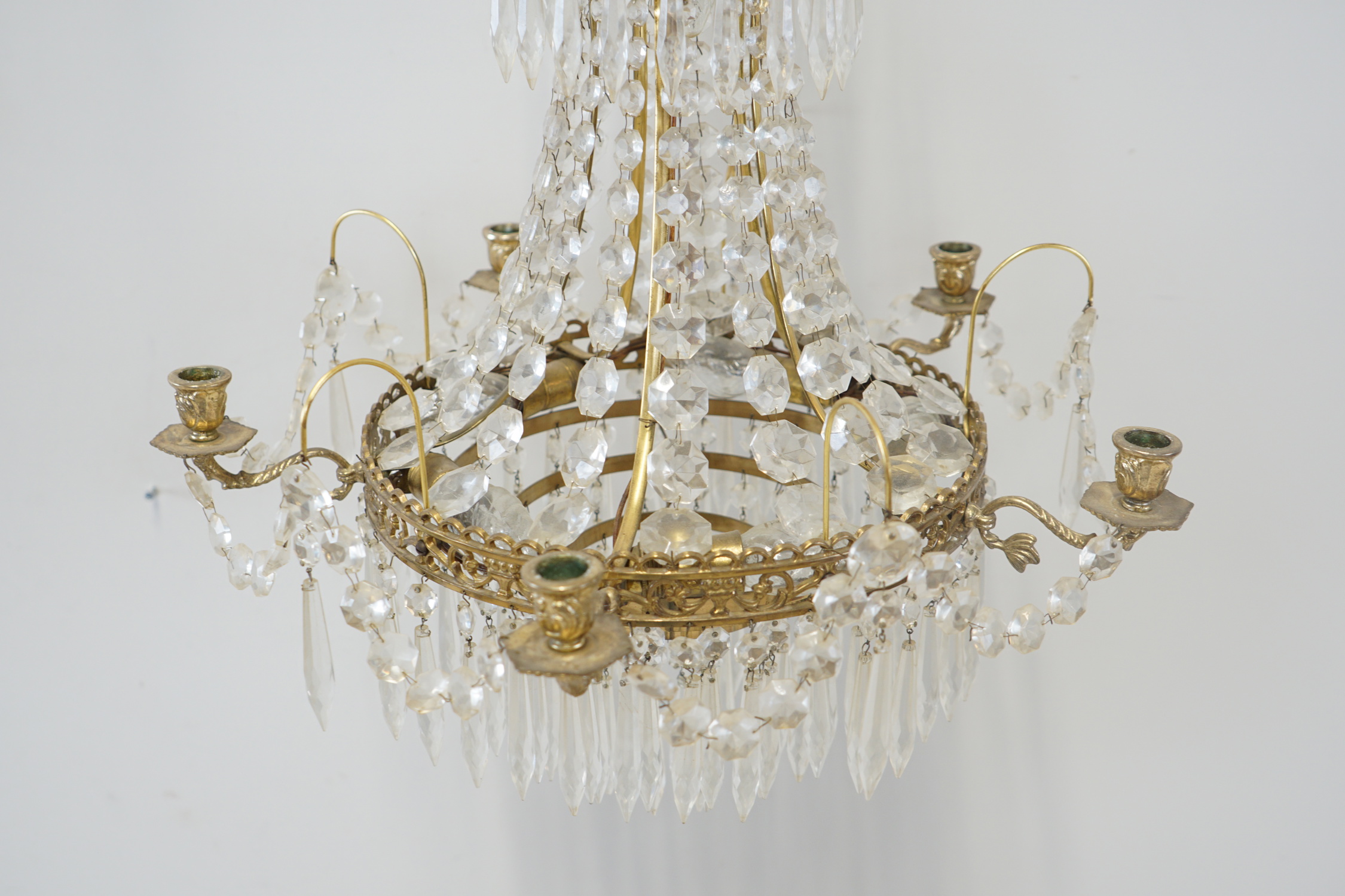 Takkrona, för 5 ljus, 6 ljuspunkter, glasprismor, mässing, 1900-tal.