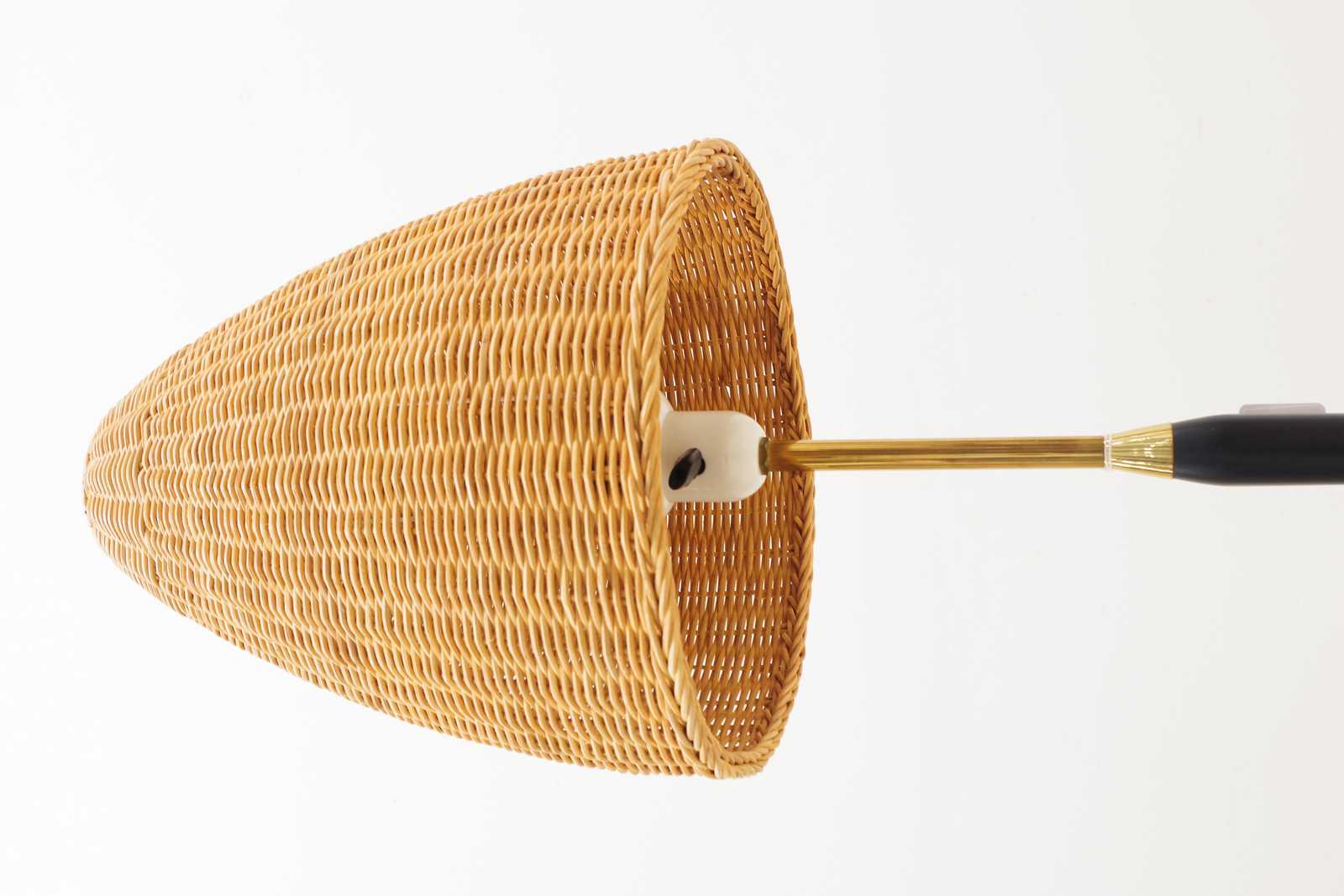 GOLVLAMPA, mässing & teak, flätad lampskärm, H: 152cm