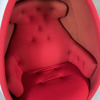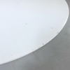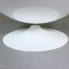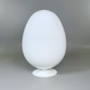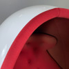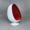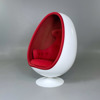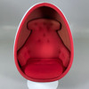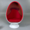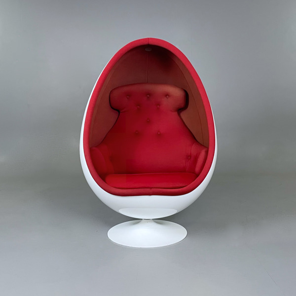 Blanklackerat vitt skal i fiberglas, invändig röd stoppad klädsel, fot av vitlackerad lättmetall. Märkt med silvermedaljong Ovalia DESIGNED 1968 BY HENRIK THOR LARSEN No 025.
