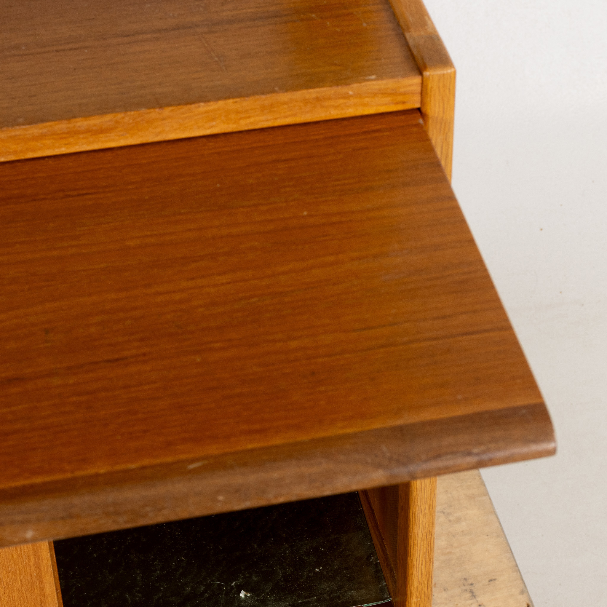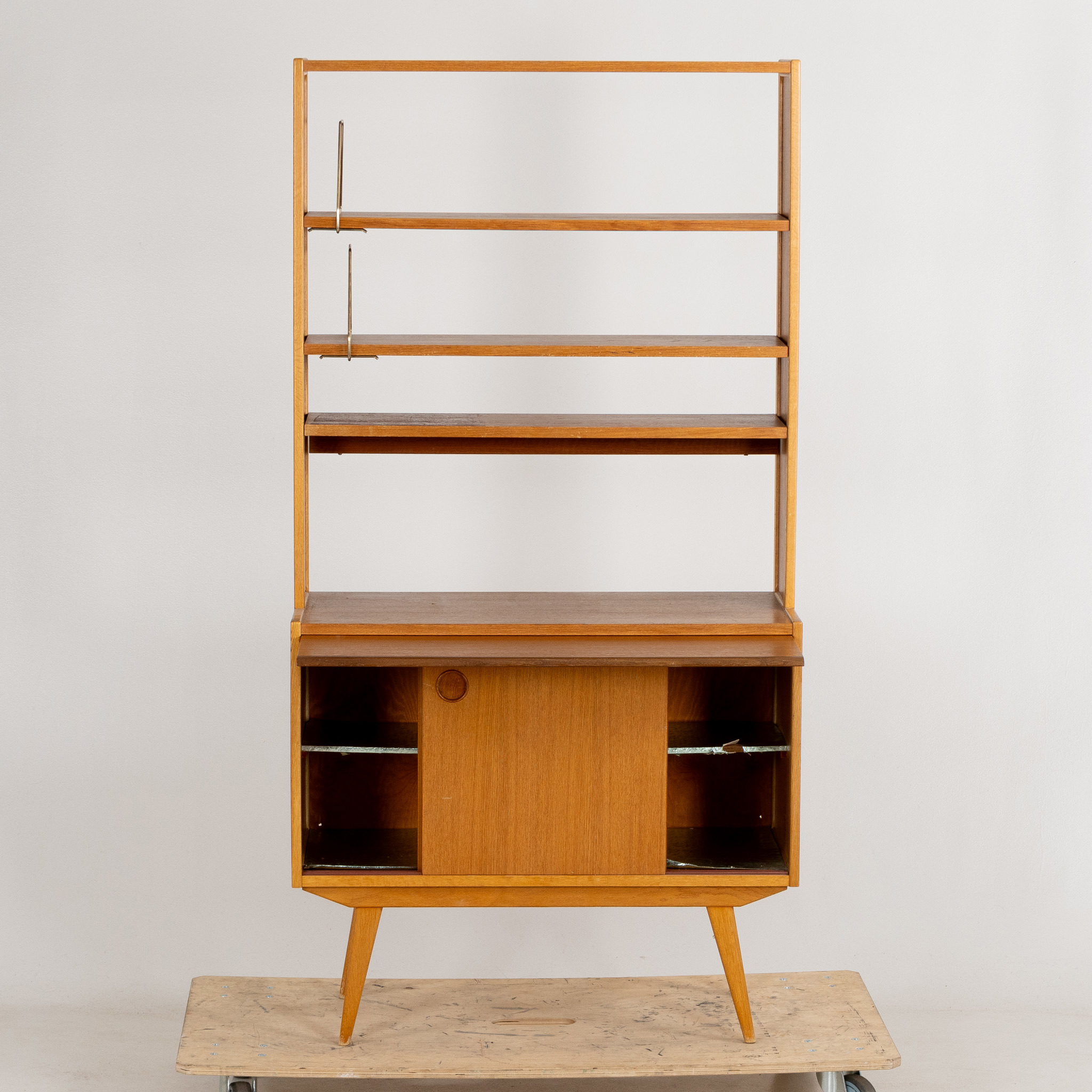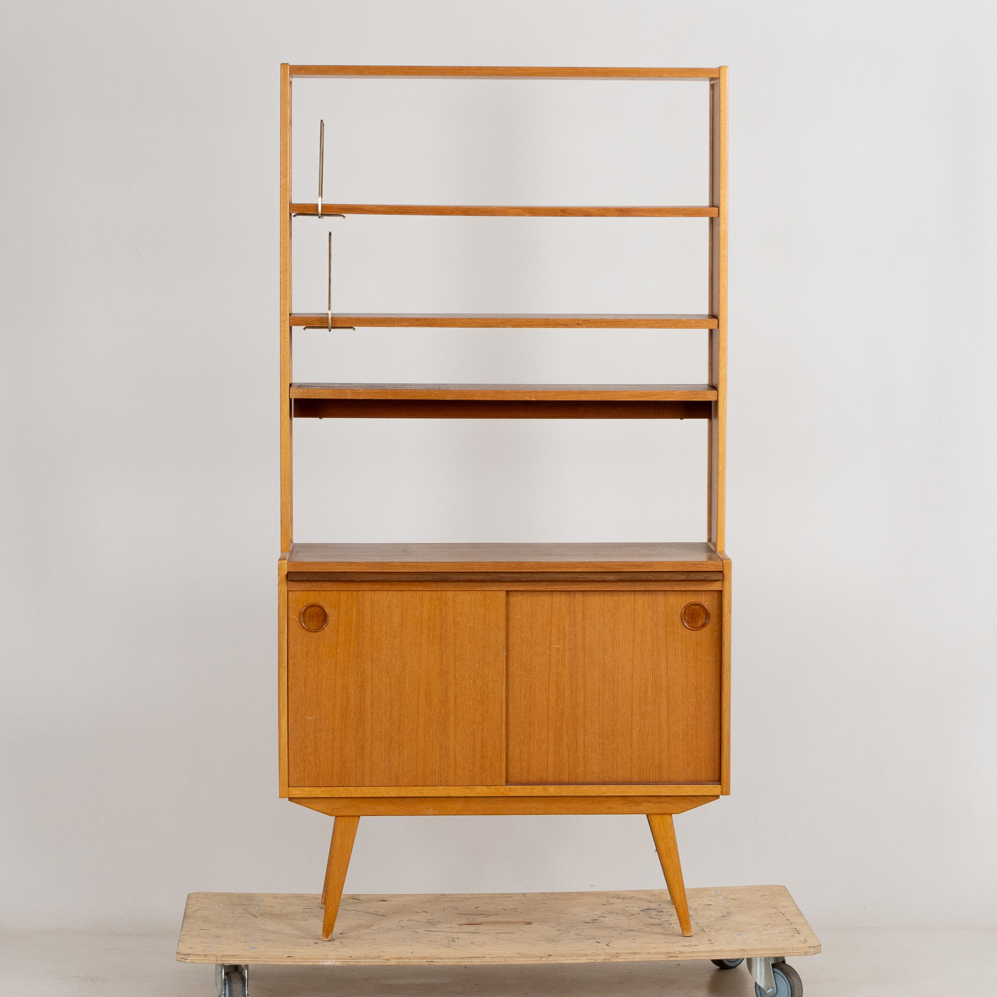 Teak och ek, skåp nedtill med skjutdörrar, höjd 164, 84 x 38 cm