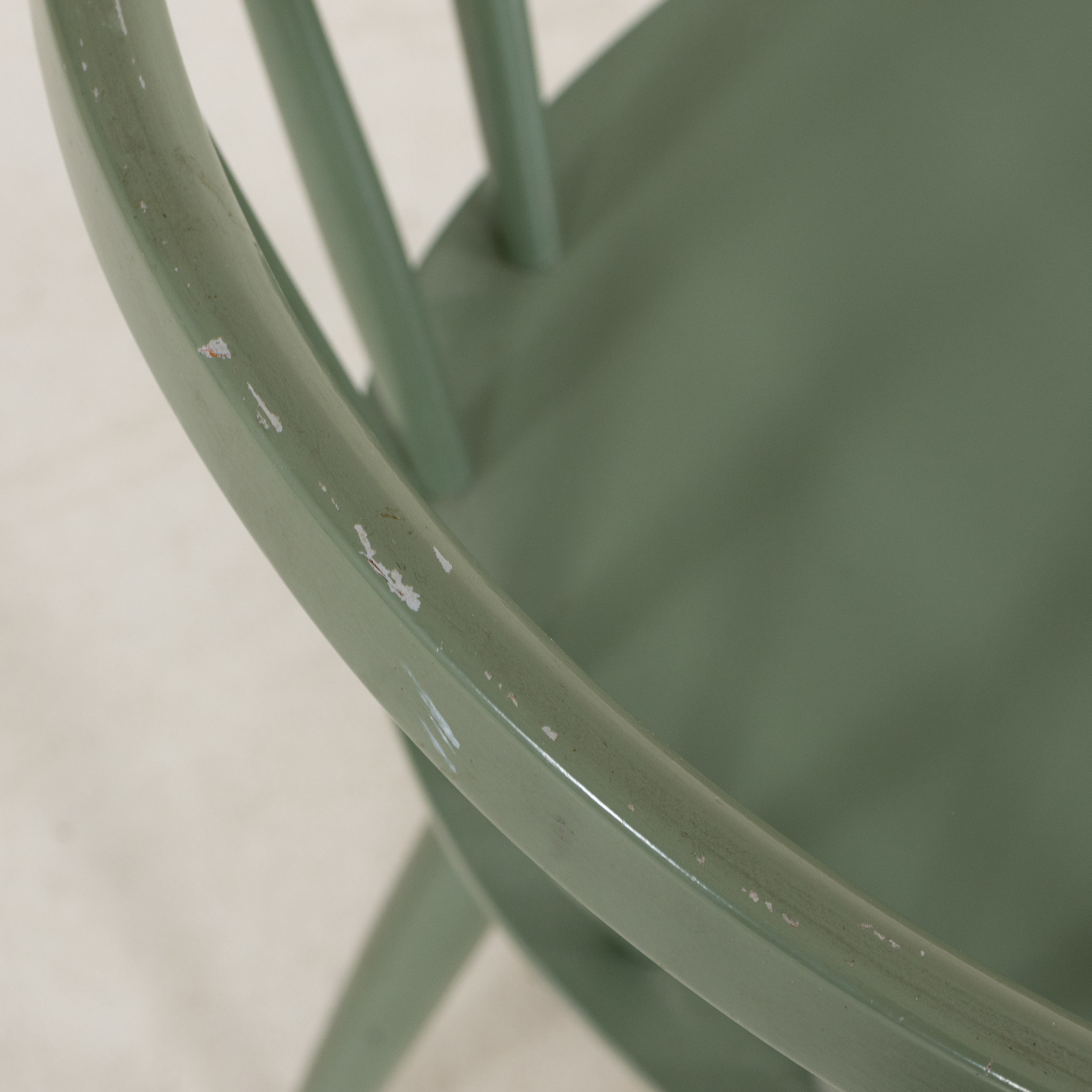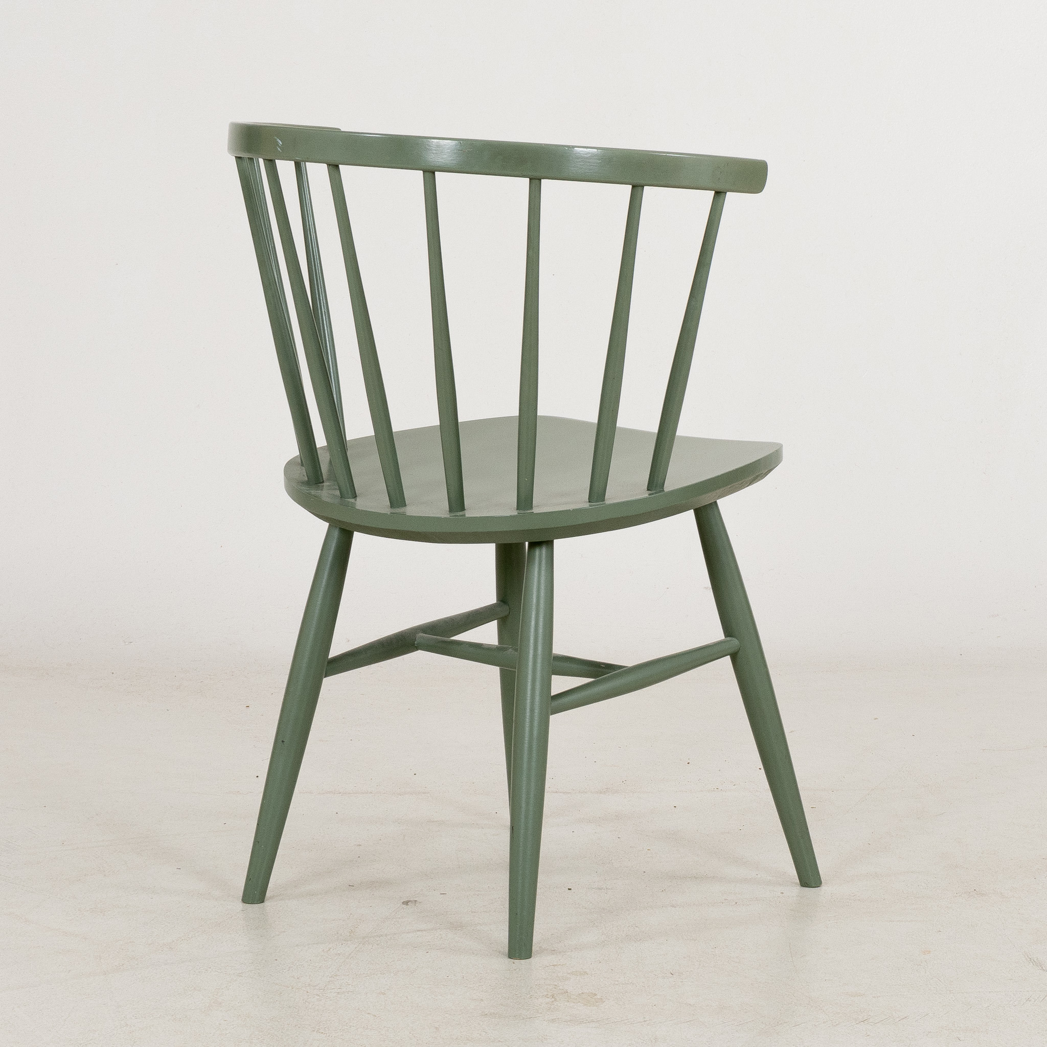 Grönmålat trä, svängd rygg med spjälor, sitthöjd ca 42 cm