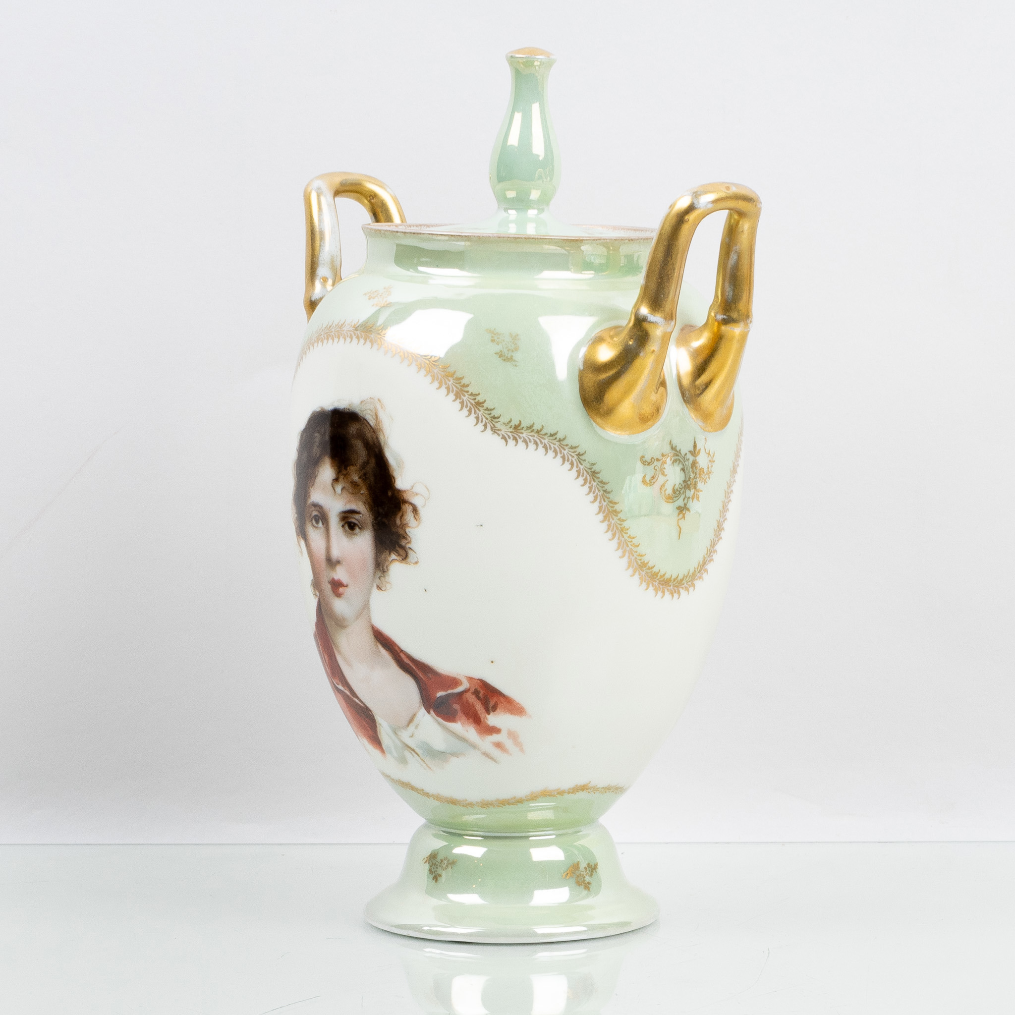 Grön lysterglasyr, förgyllda uppsvängda hänklar, dekor av kvinna, bottenmärkning, höjd ca 27 cm