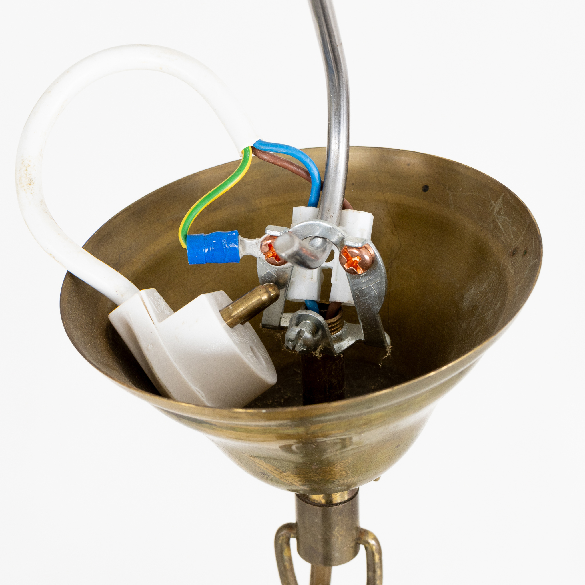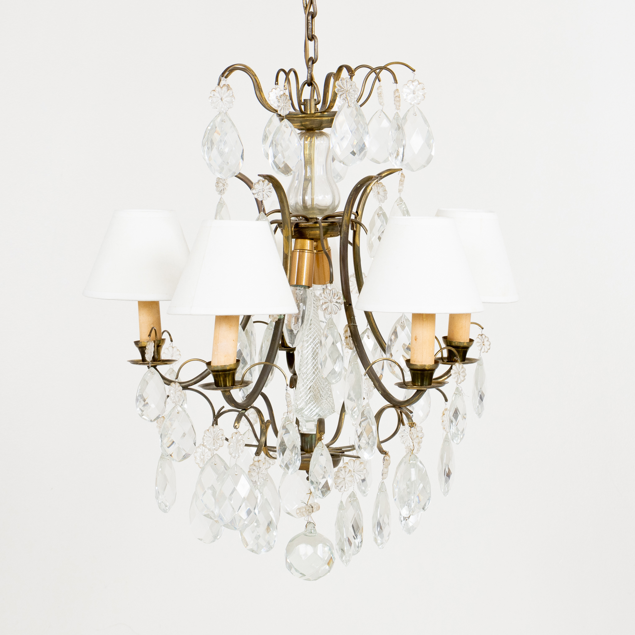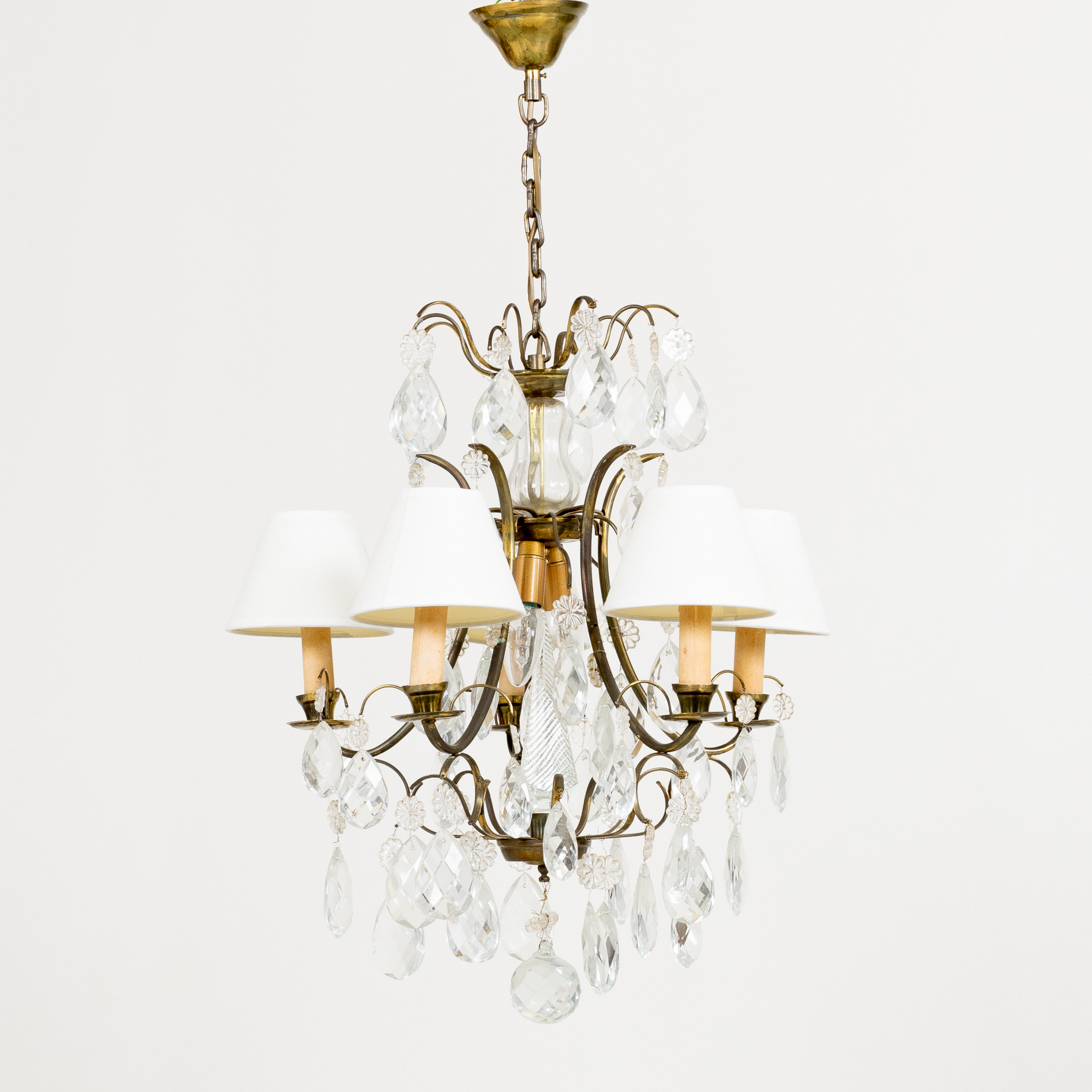Stomme av patinerad mässing, behängd med olikslipade prismor, fem ljusarmar, stamglas, sju ljuspunkter, höjd ca 50 cm