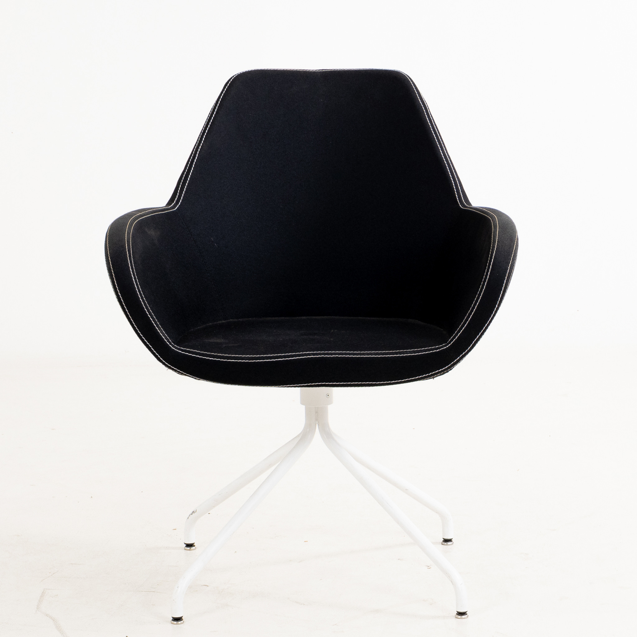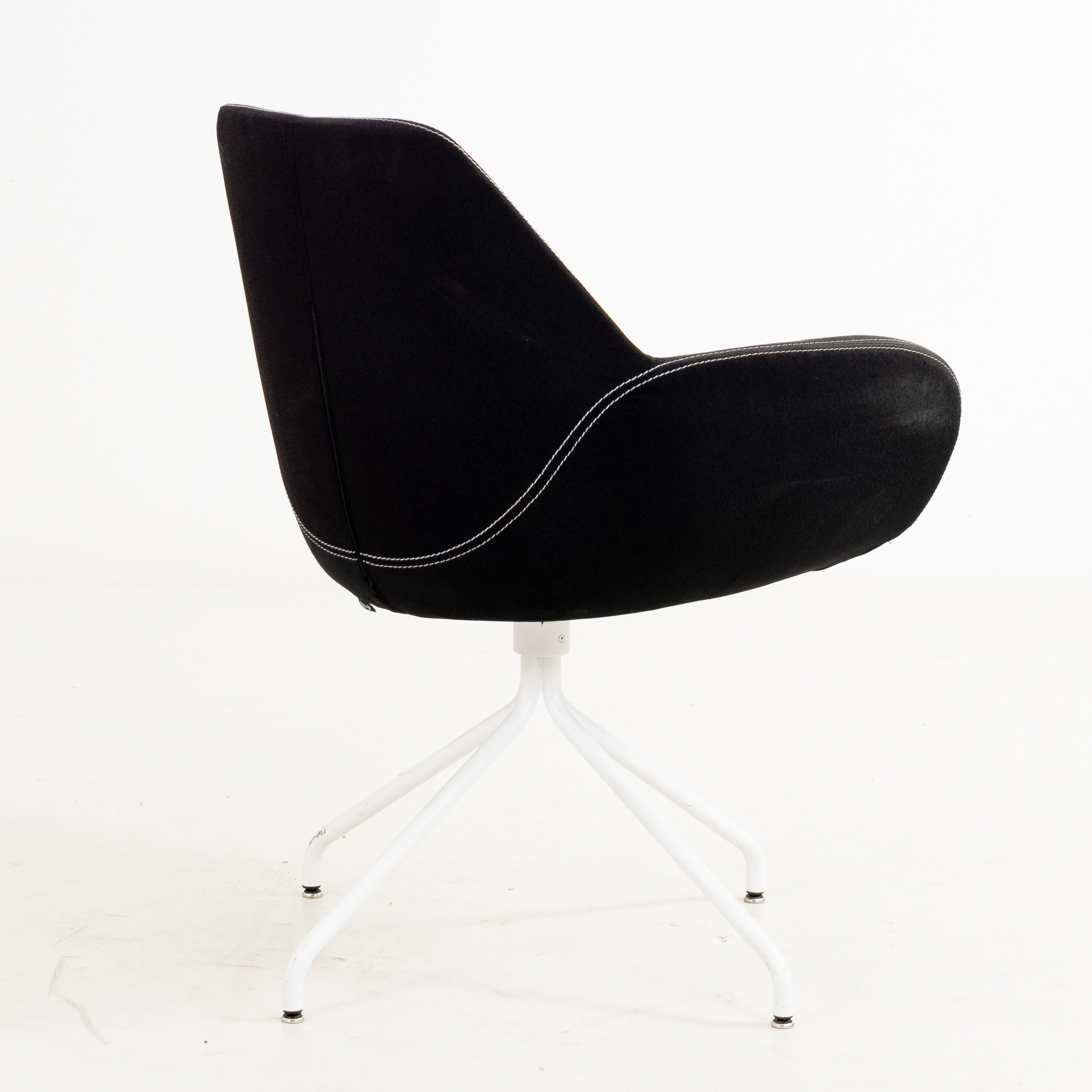 På fyrdelad fot, lackerad metall, sits av textil med vita sömmar, snurrbar, höjd ca 46 cm