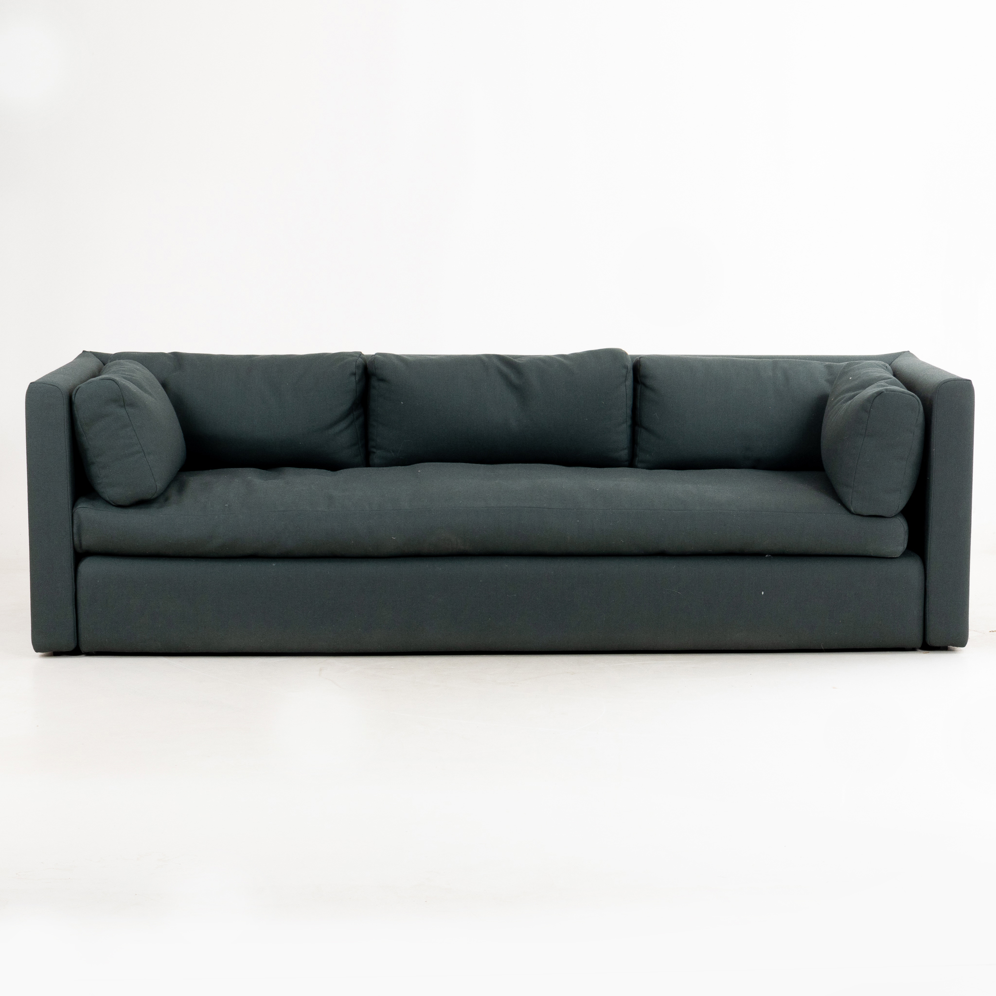 Klädsel av mörkgrön textil, lösa rygg- och sittplymåer med avtagbar klädsel, sitthöjd 44, längd 255, djup 95, rygghöjd 68 cm