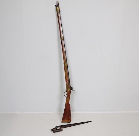 Auktioner Sport & Fritid Slaglåsgevär 1800-tal, märkt "CB", troligen ombyggt från flintlås, helstock L=147 + 2st äldre bajonetter