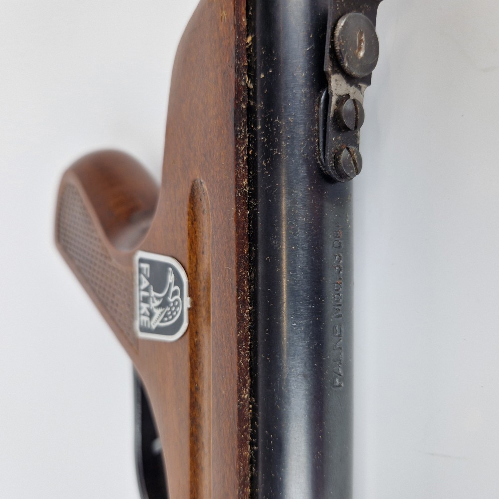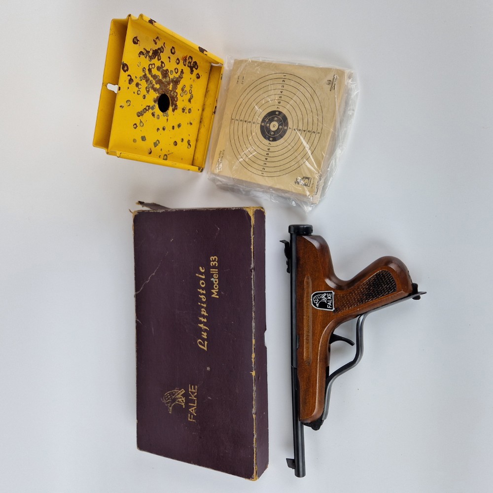 Falke Modell 33. Kaliber 4,5 mm. Med originalkartong. 1950-tal. Kulfång och tavlor av senare tillverkning medföljer.
