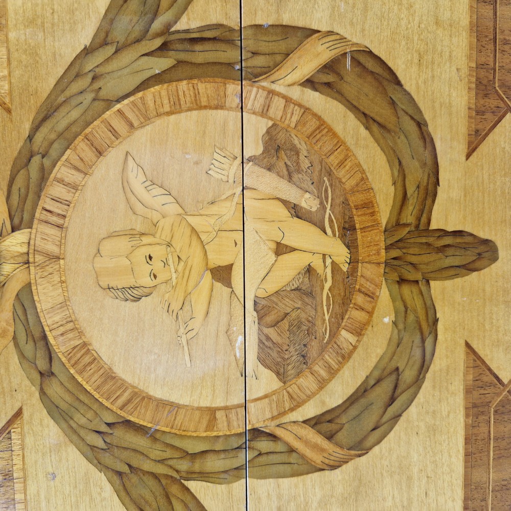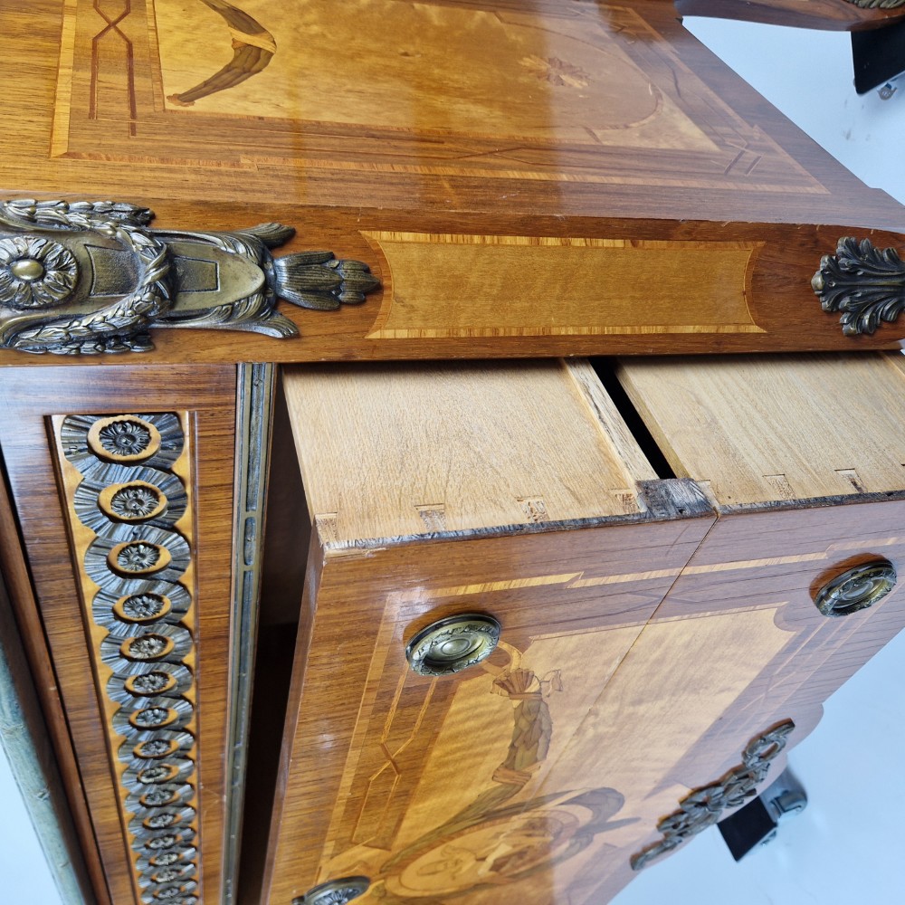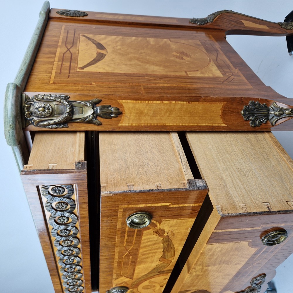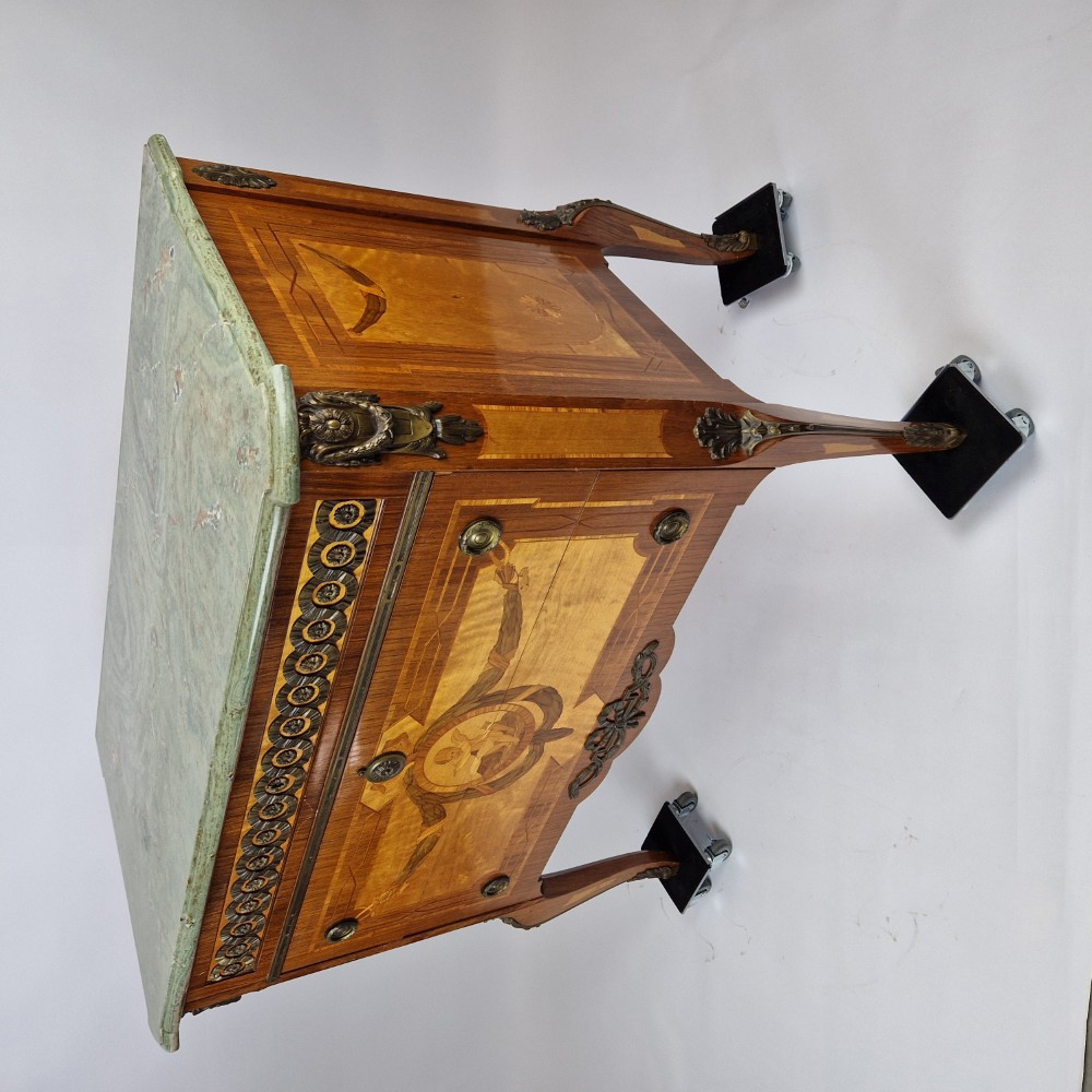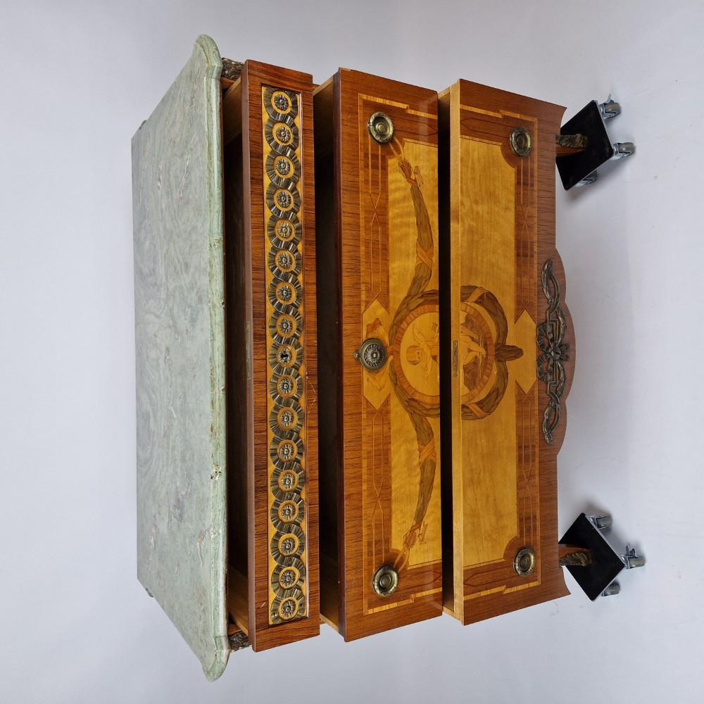1900-talets mitt. Så kallad Haupt-kopia. Intarsiadekor. Fanerad med olika träslag. Tre lådor. Skiva av kolmårdsmarmor.