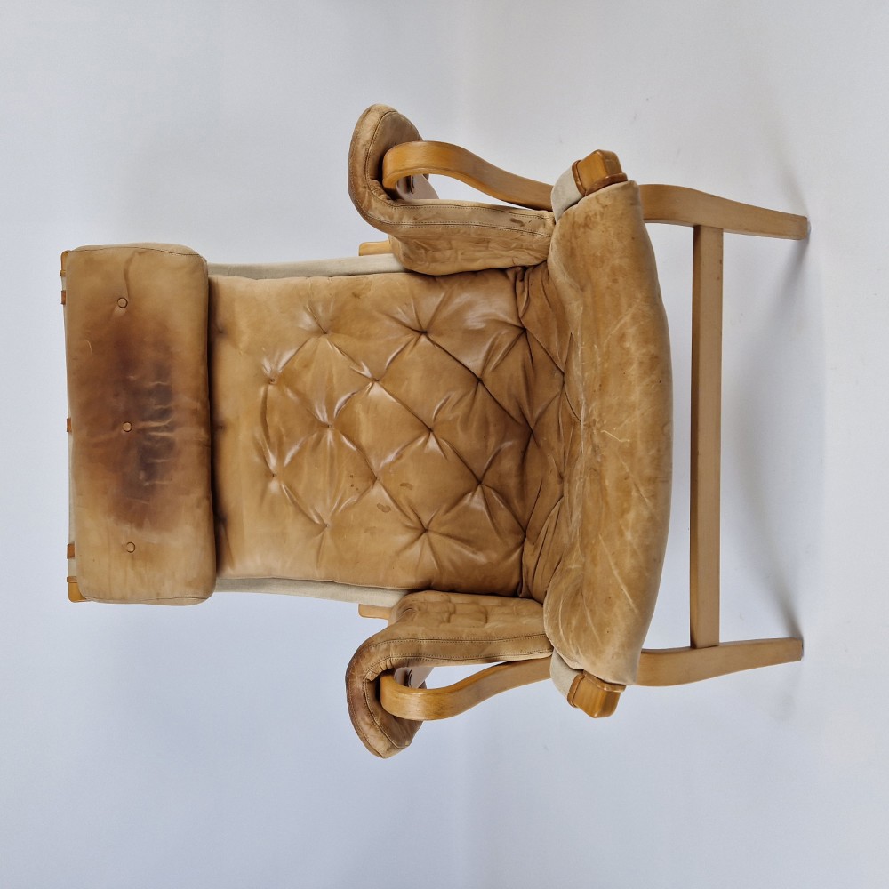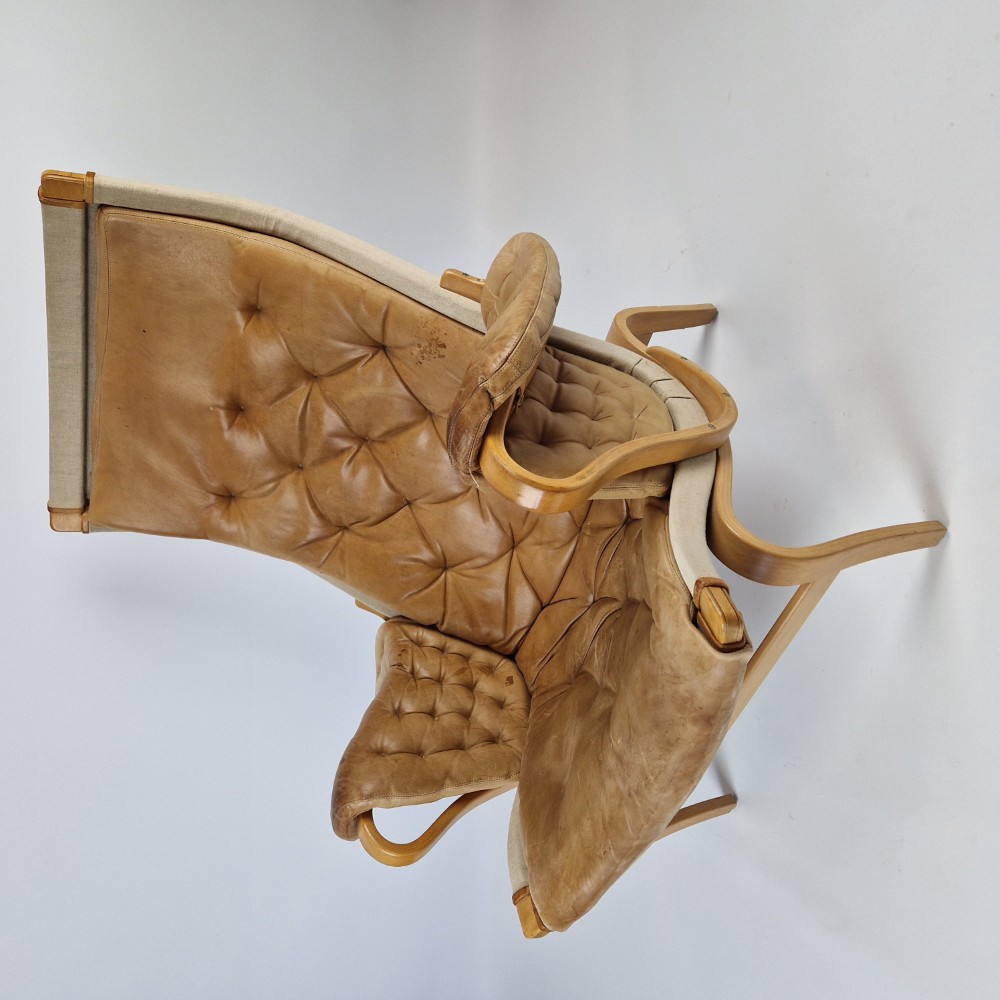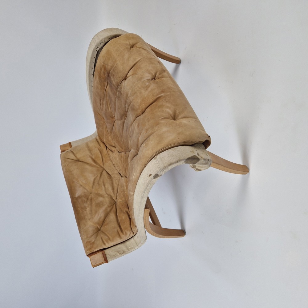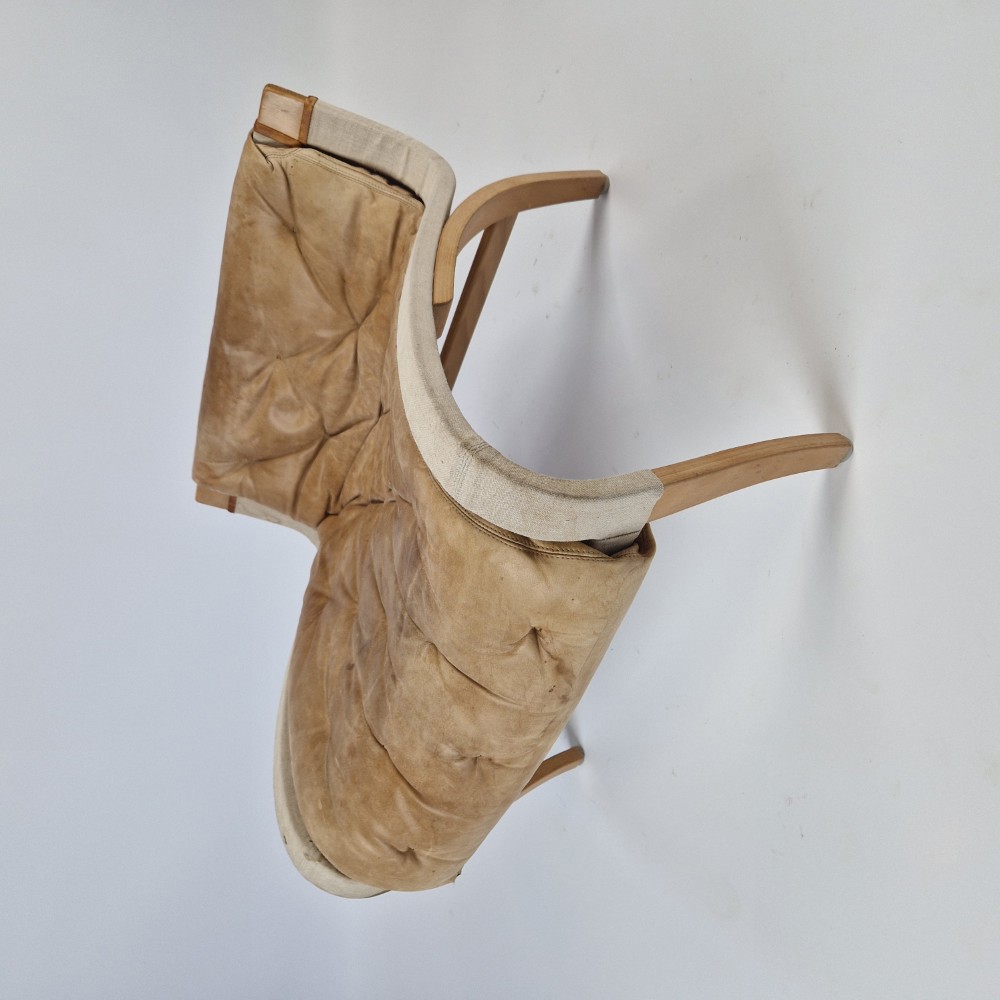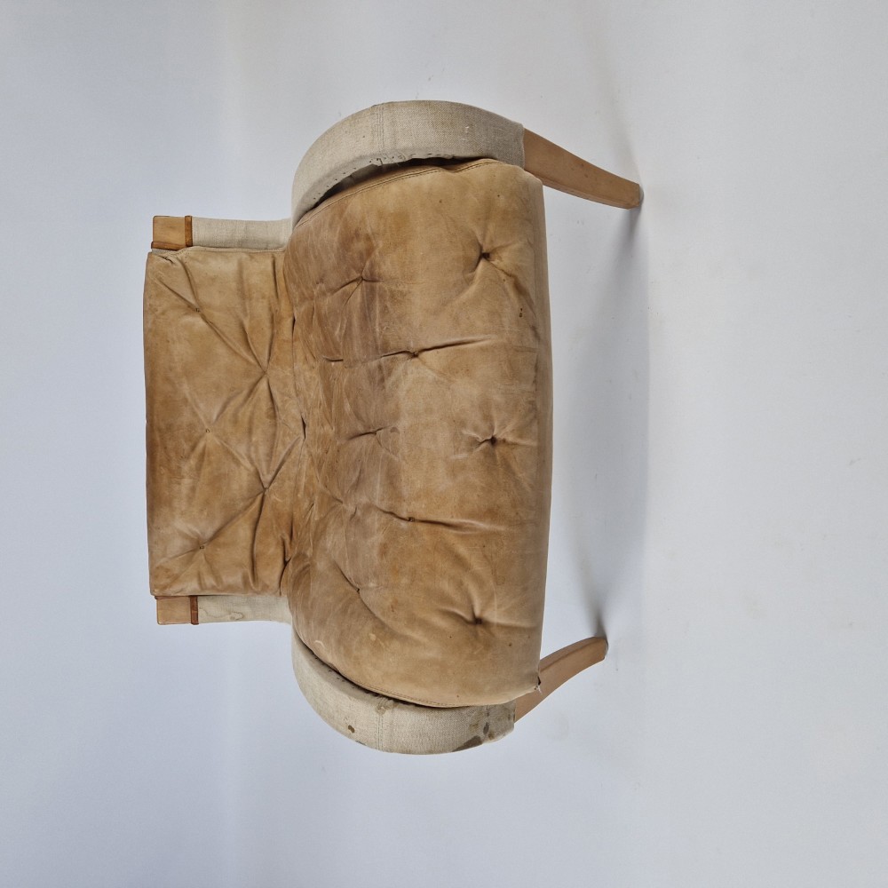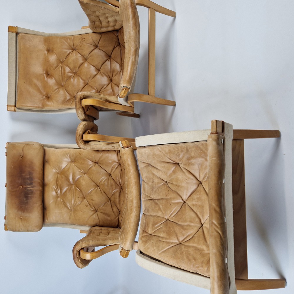 Fåtöljer, ett par och en fotpall, DUX. Böjträ i bok med ljus skinnklädsel. Brännstämplade.