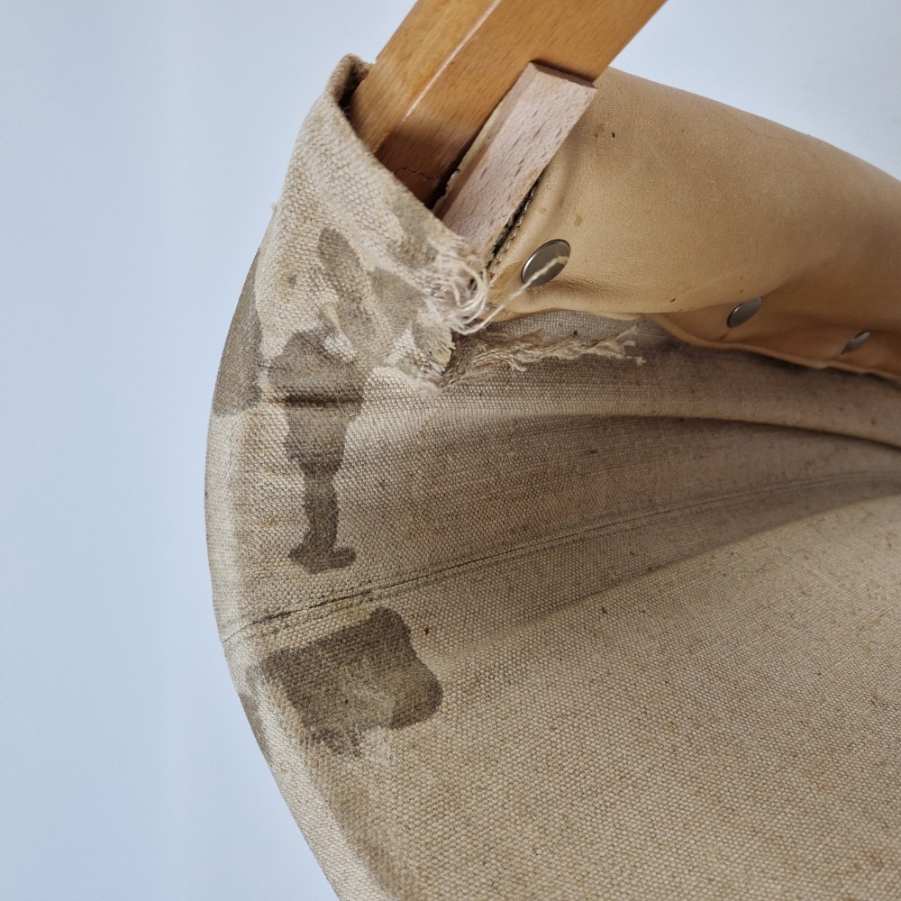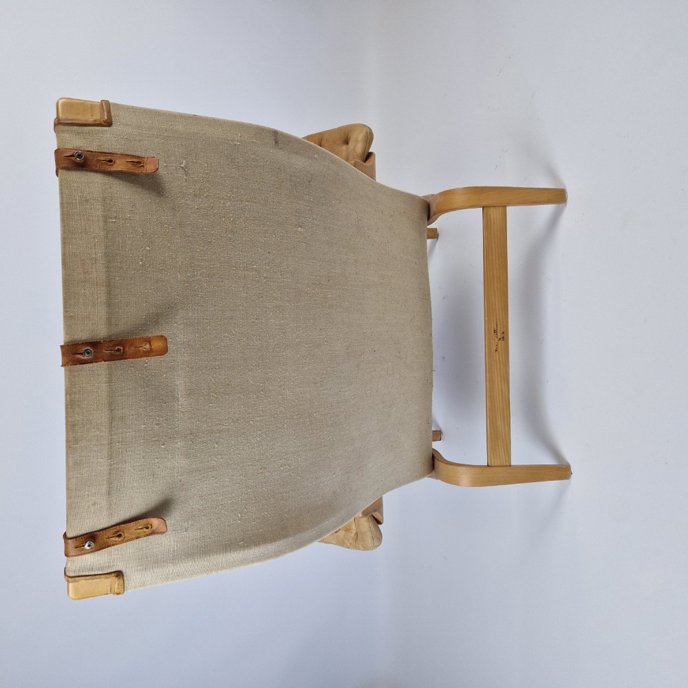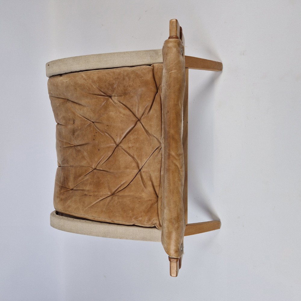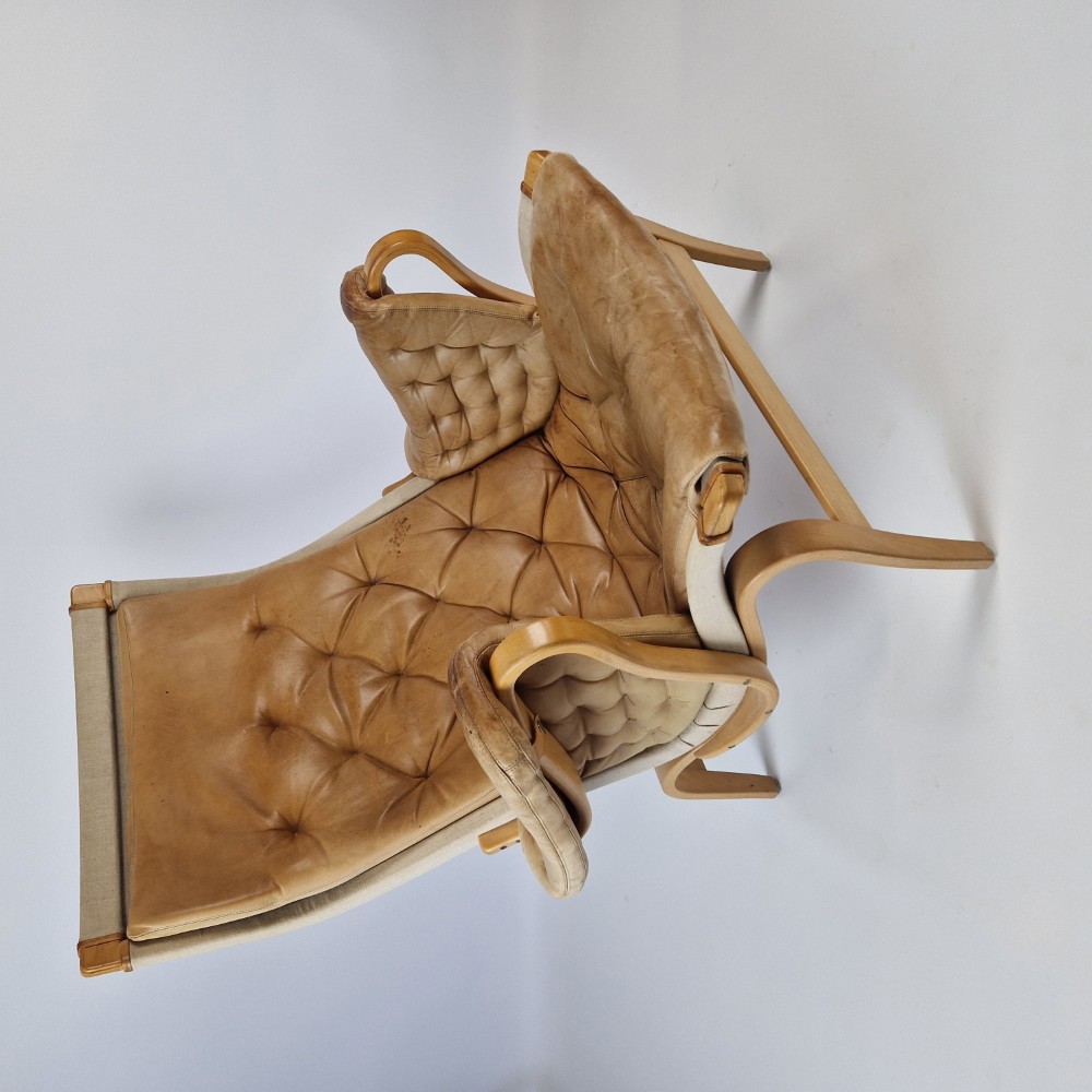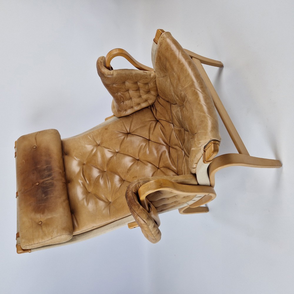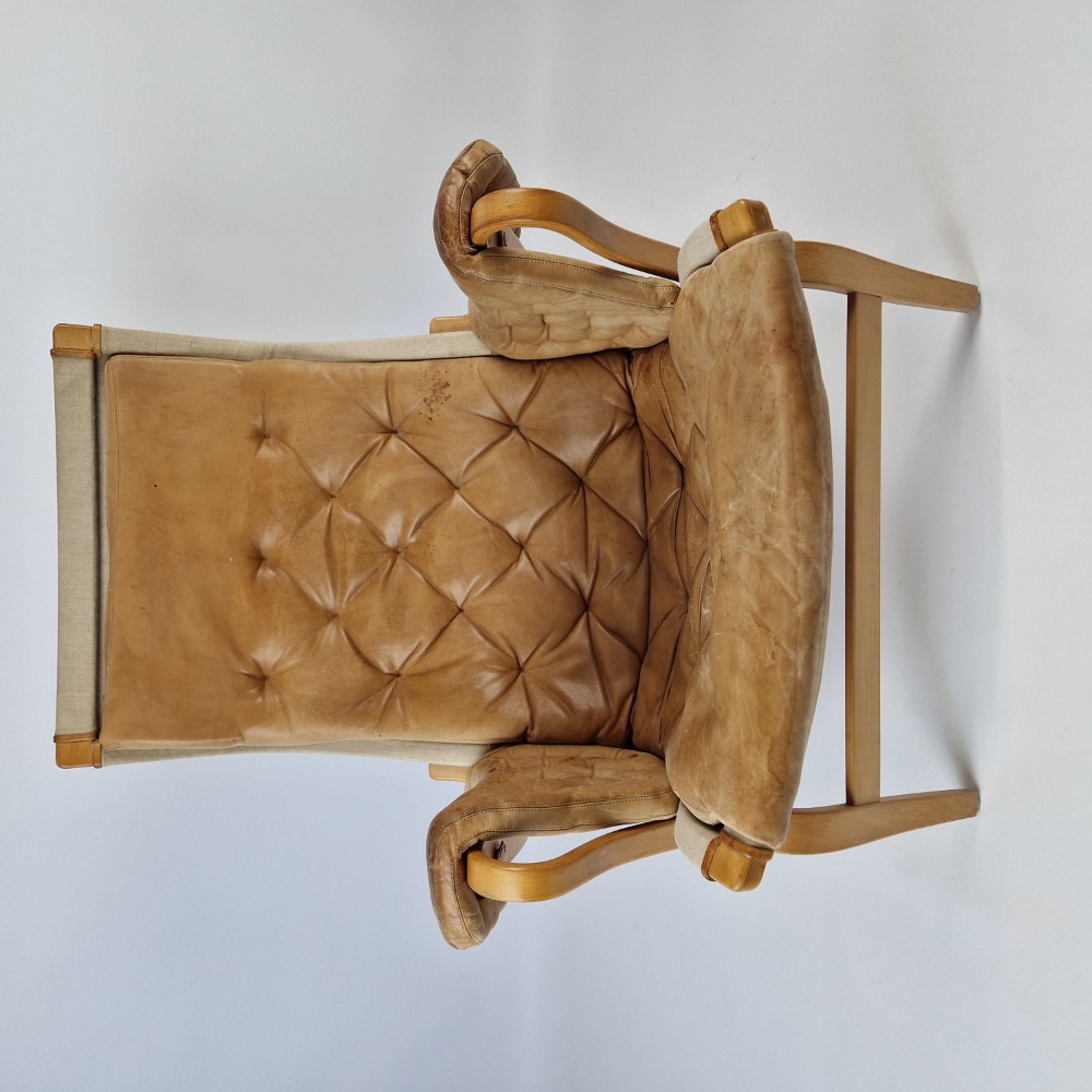 Fåtöljer, ett par och en fotpall, DUX. Böjträ i bok med ljus skinnklädsel. Brännstämplade.