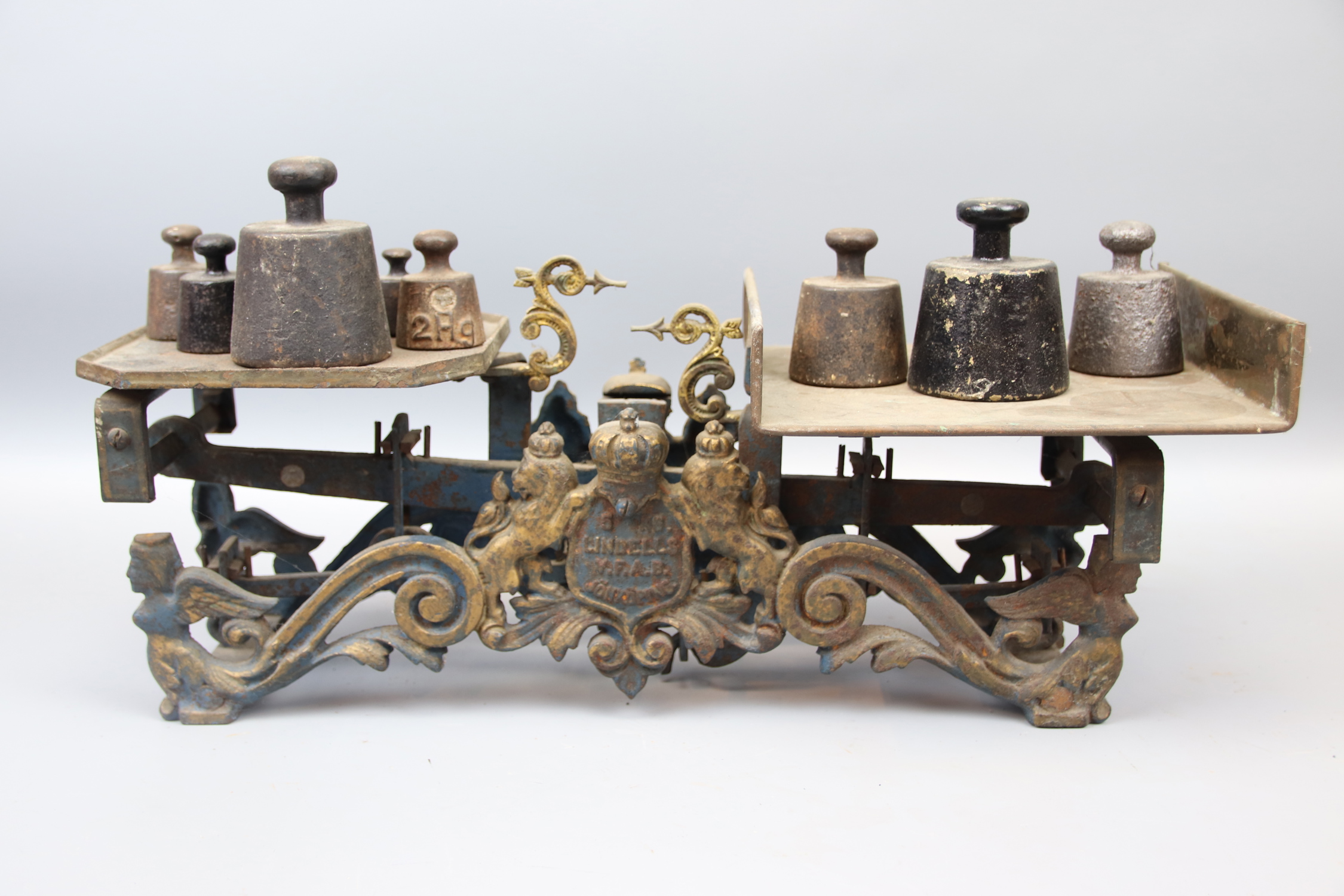 Balansvåg med vikter, 10 delar, gjutjärn, Lindells.