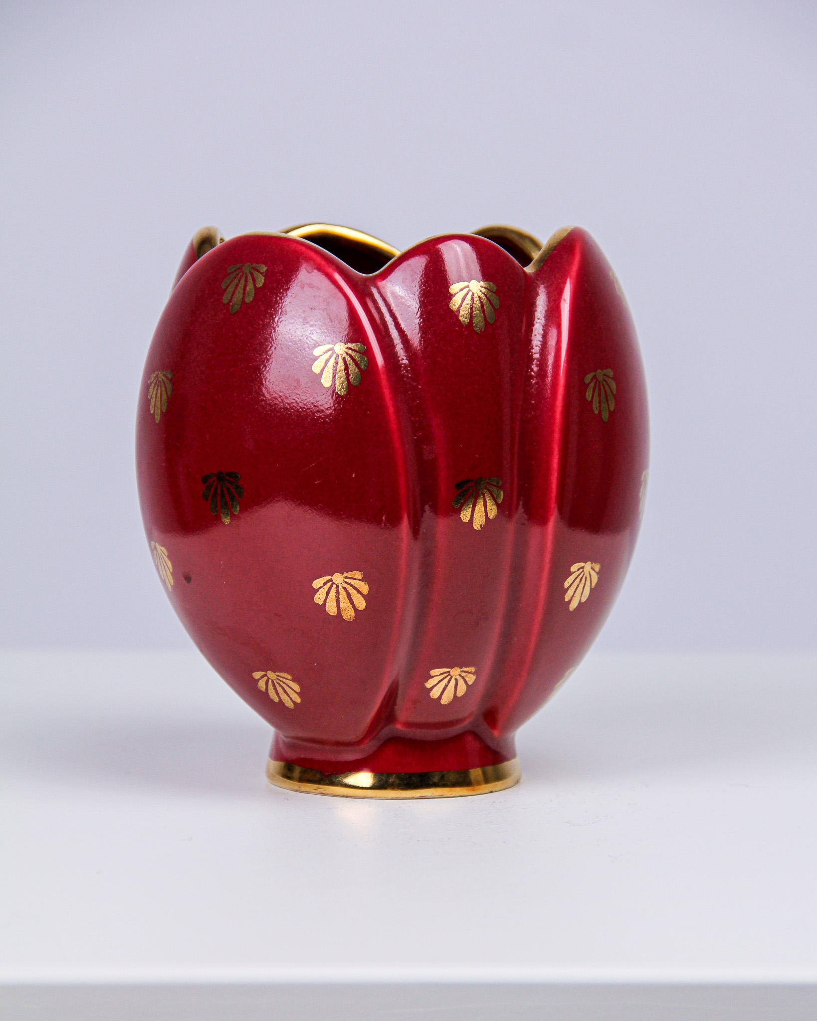 Arthur Percy, blomsteruppsats och vas, âRubinâ, rödglaserat stengods, tillverkarmĂ€rkta Upsala Ekeby Gefle