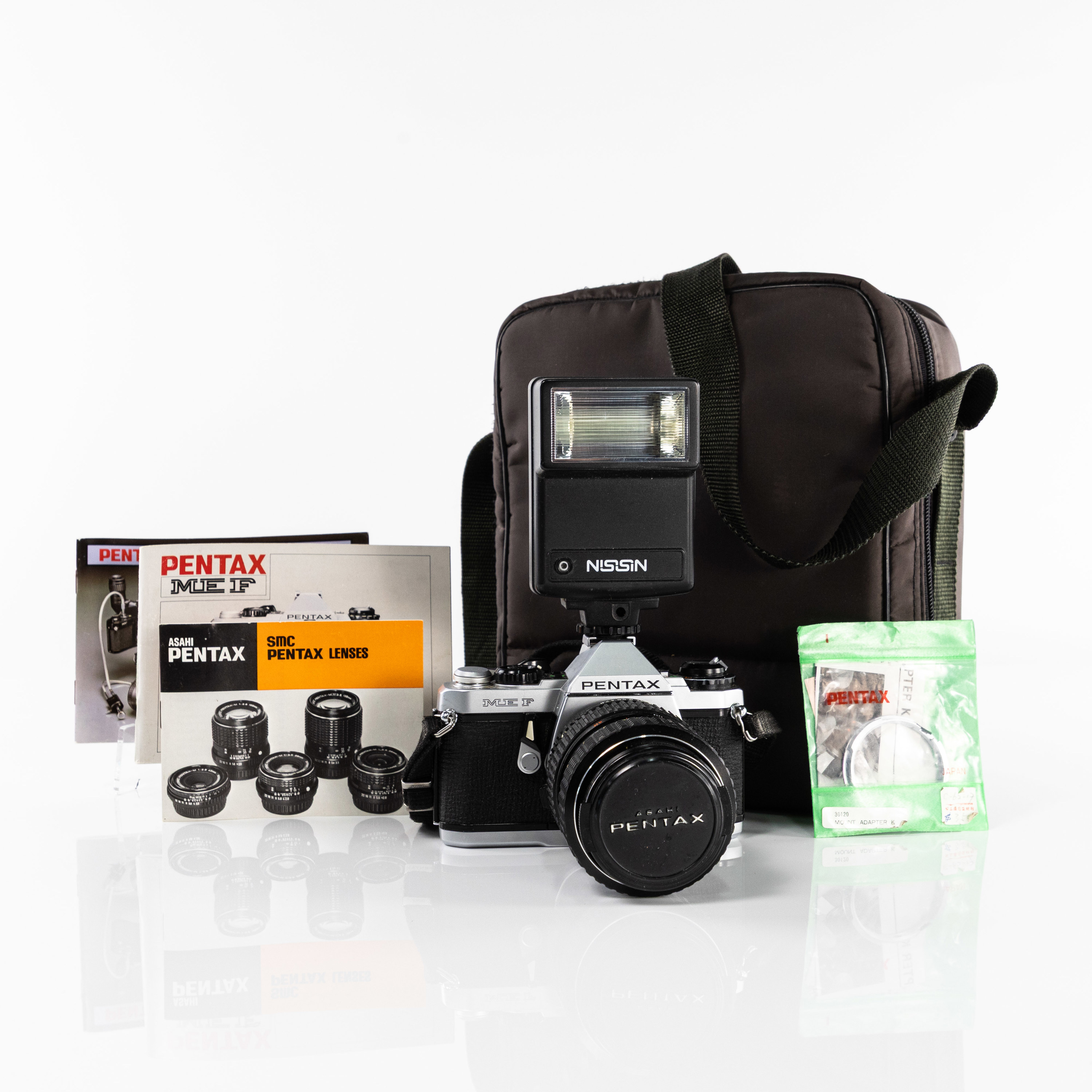 Systemkamera, Pentax ME F, Optik; SMC Pentax-M Zoom 40-80 mm/1:2.8-4.0, ca 1970-tal, Japan, kommer med Nissin-blixt i modernare kameraväska
