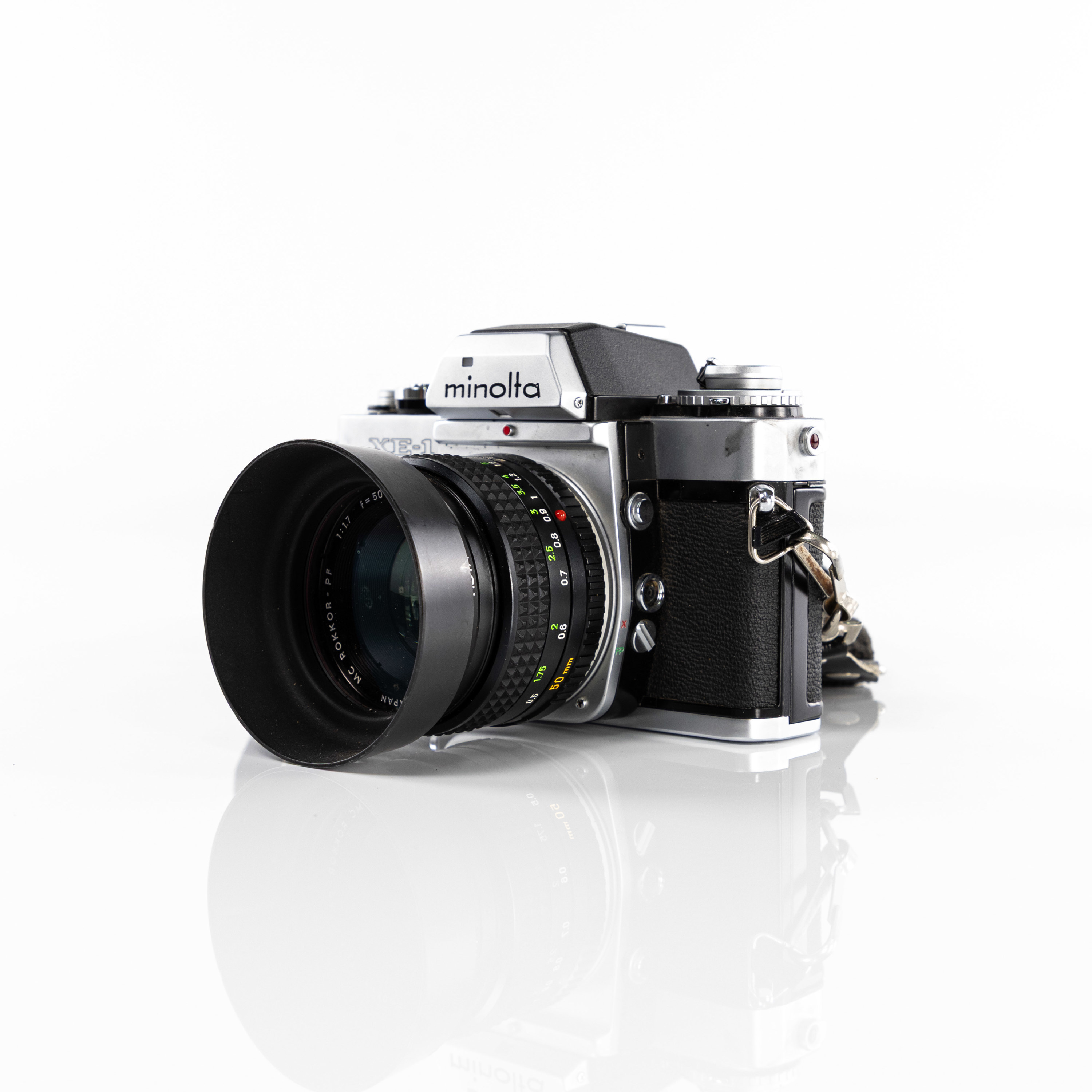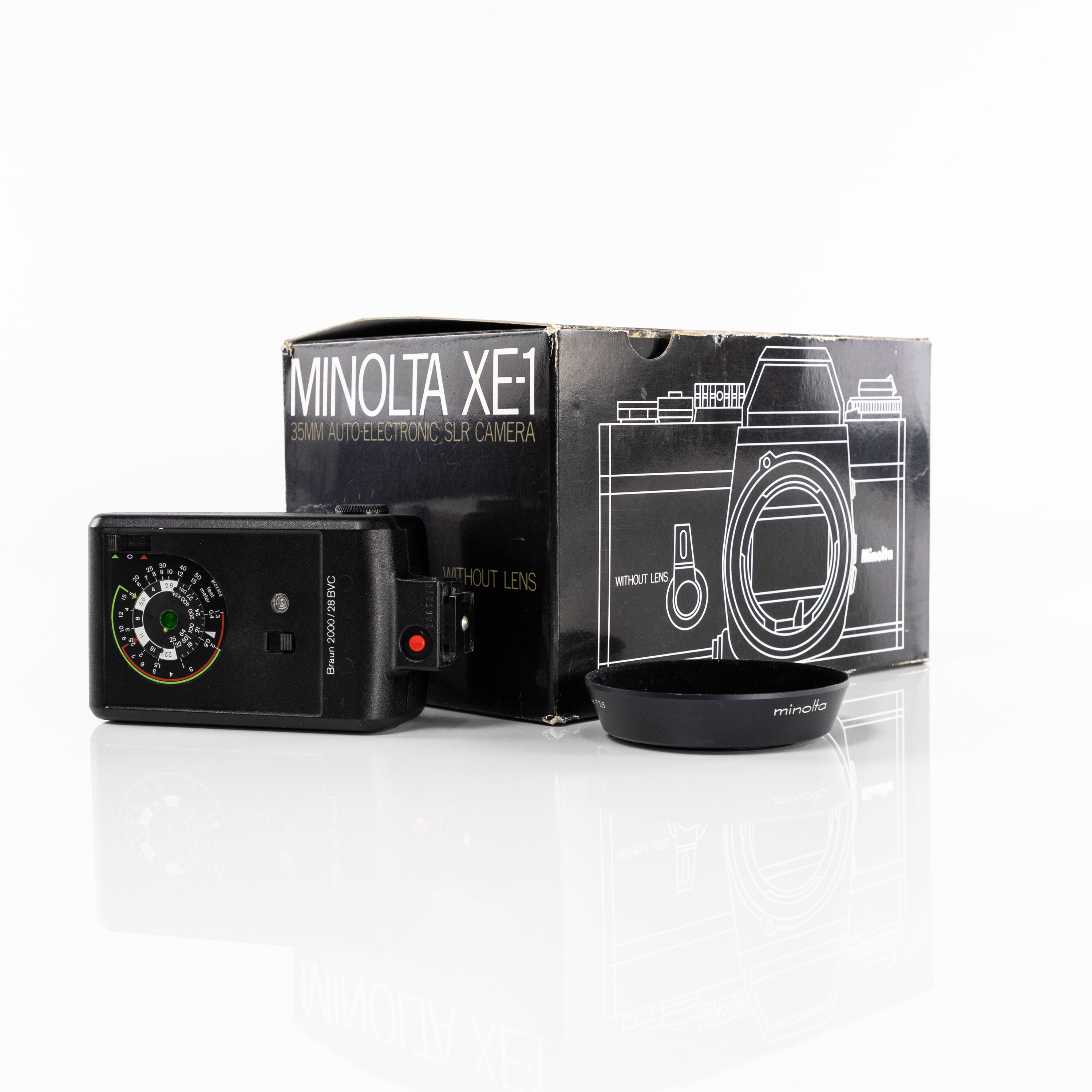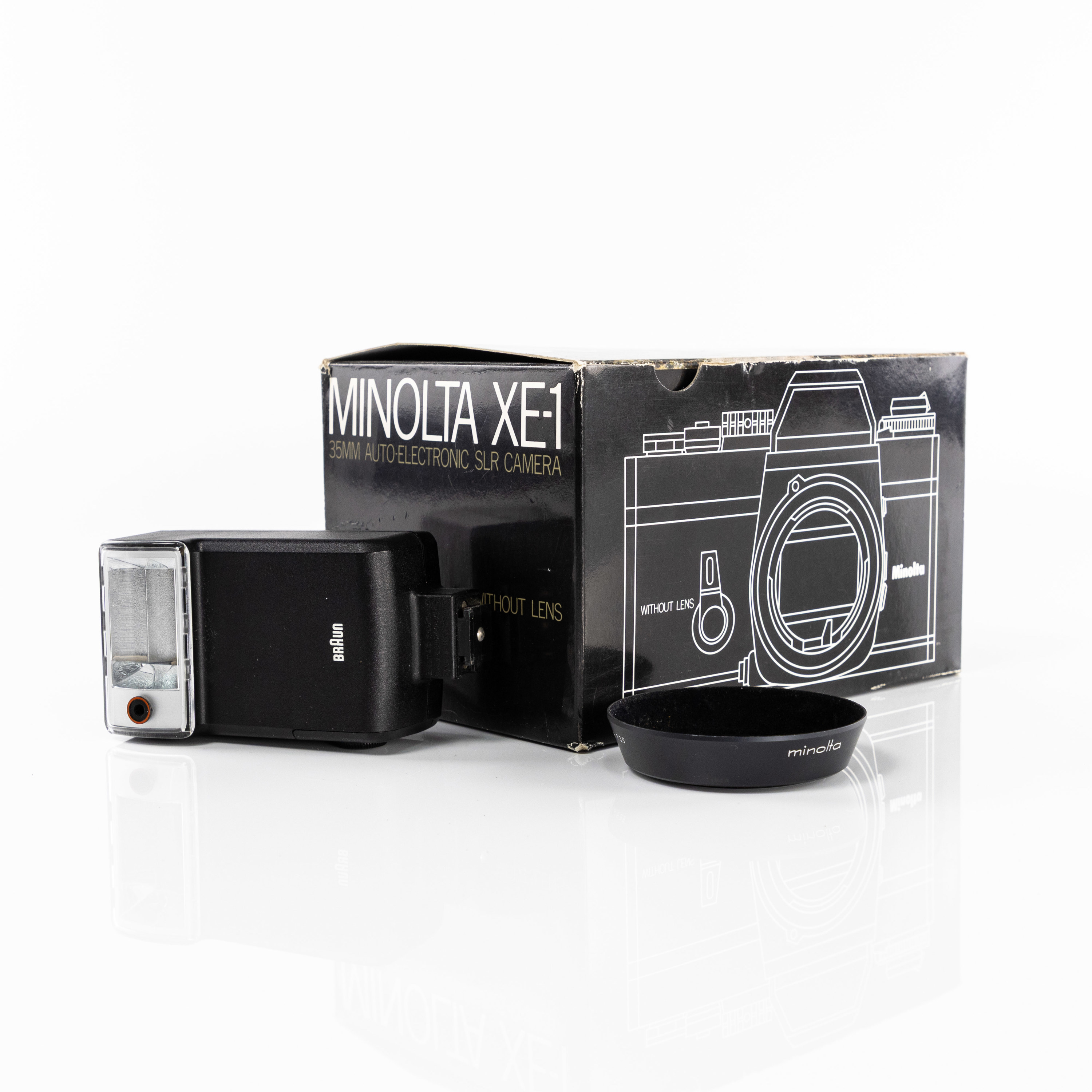 Systemkamera, Minolta XE-1, Optik; MC Rokkor-PF 50 mm/1:1.7, Blixt; Braun 2000/28 BVC, ca 1970-tal, Japan, kommer med bruksanvisningar och originalkartong