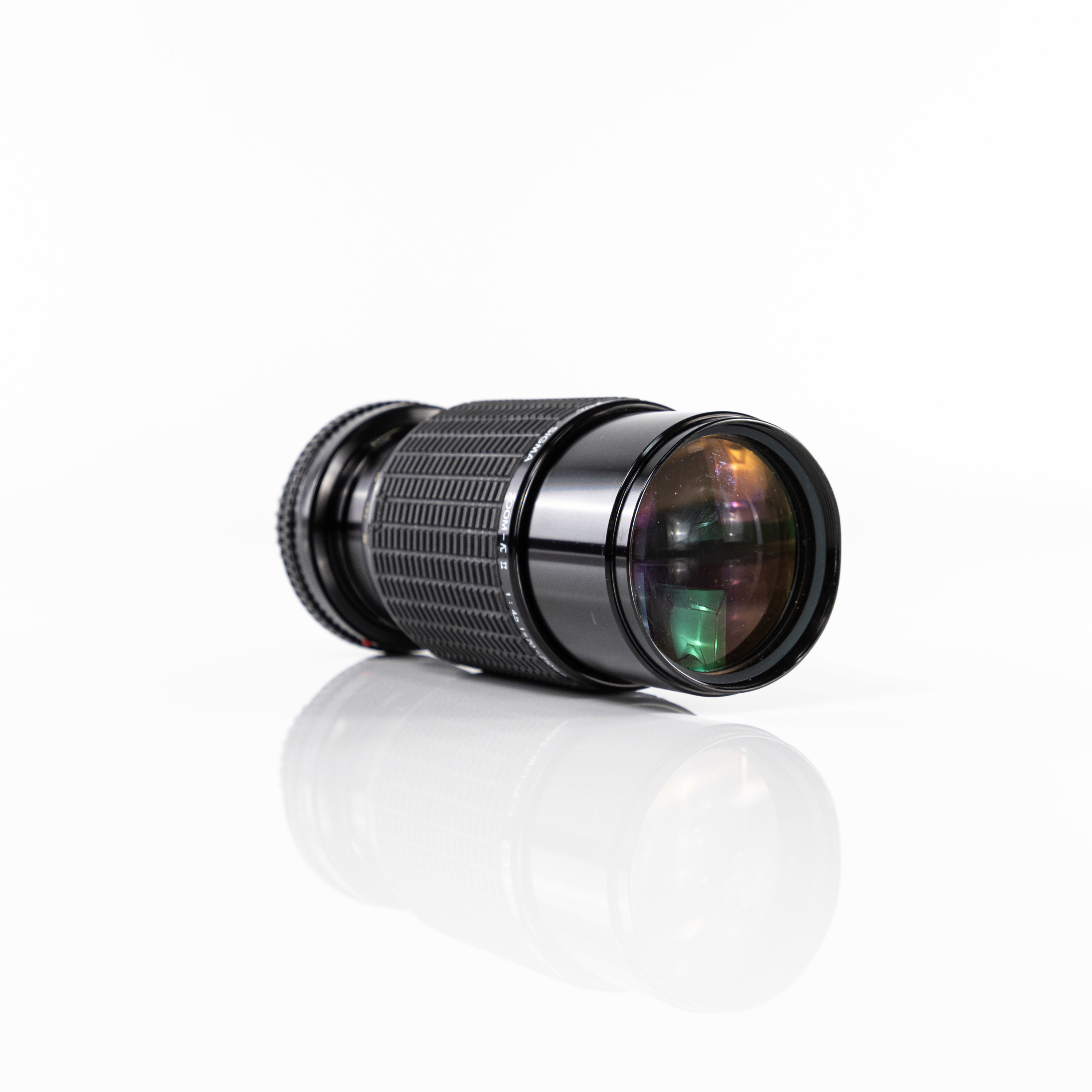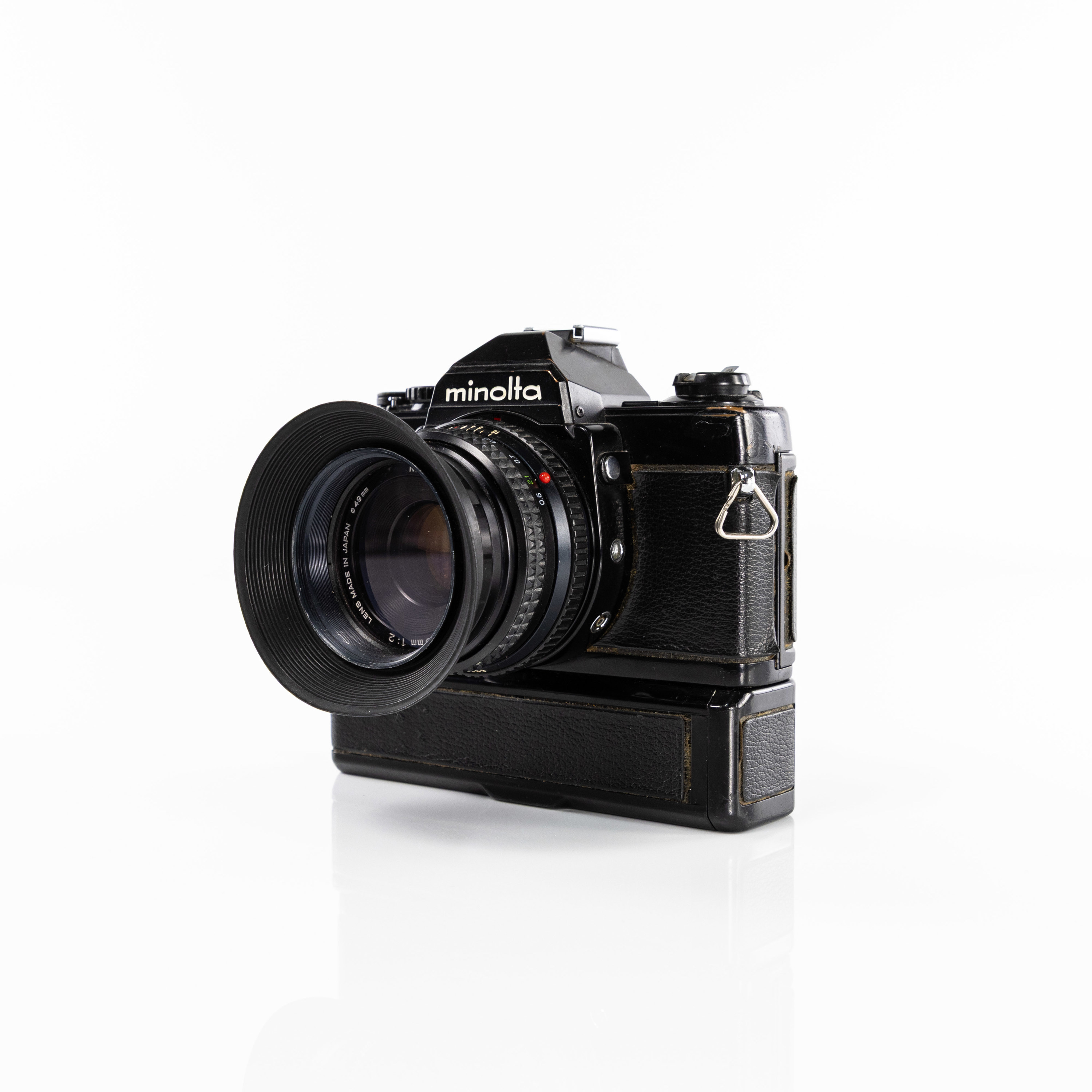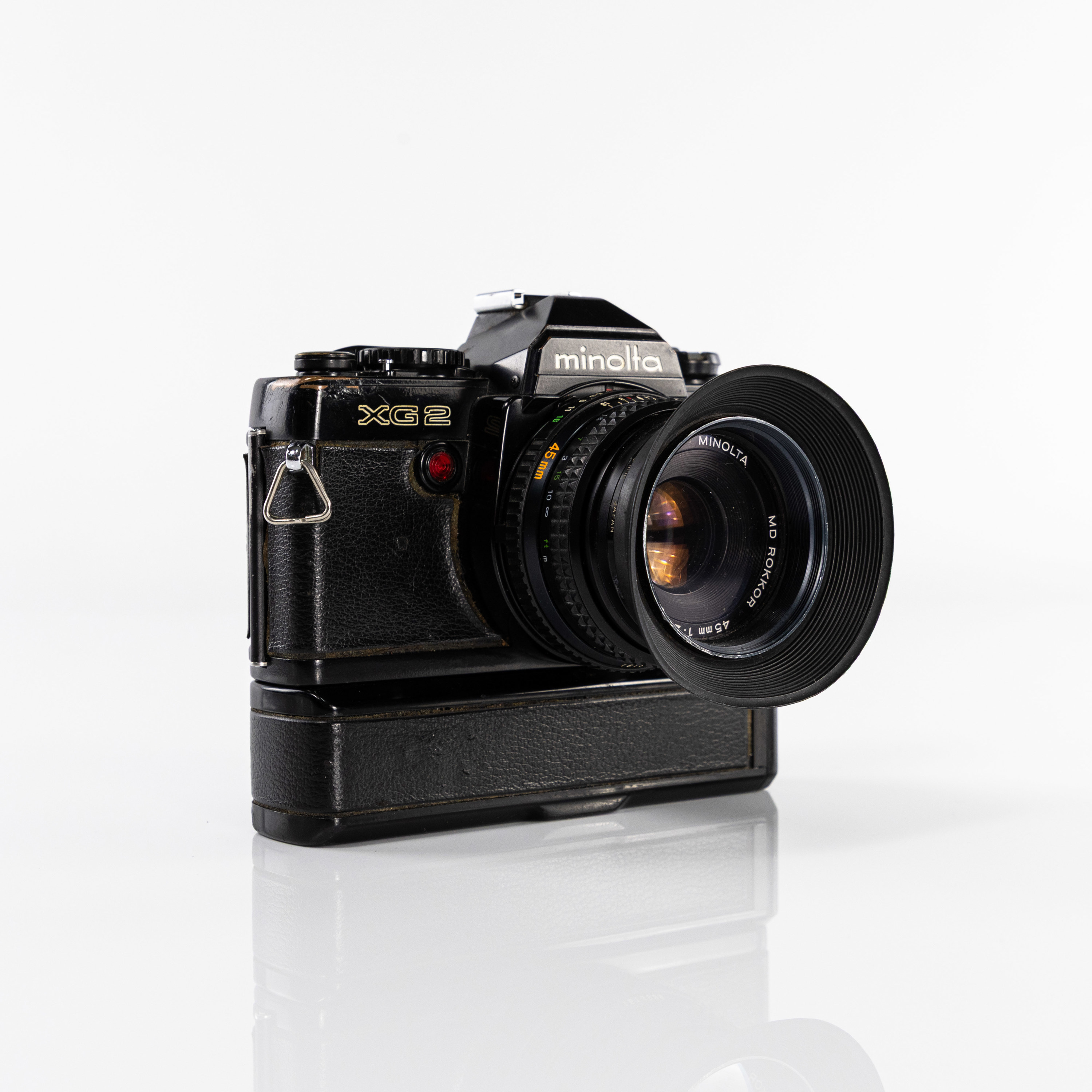 Systemkamera, Minolta XG2, Optik; Minolta Rokkor 45 mm/1:2, Sigma Zoom 70-210 mm/1:4.5, Blixt; Braun 370 BVC, ca 1970-tal, Japan, kommer med bruksanvisning