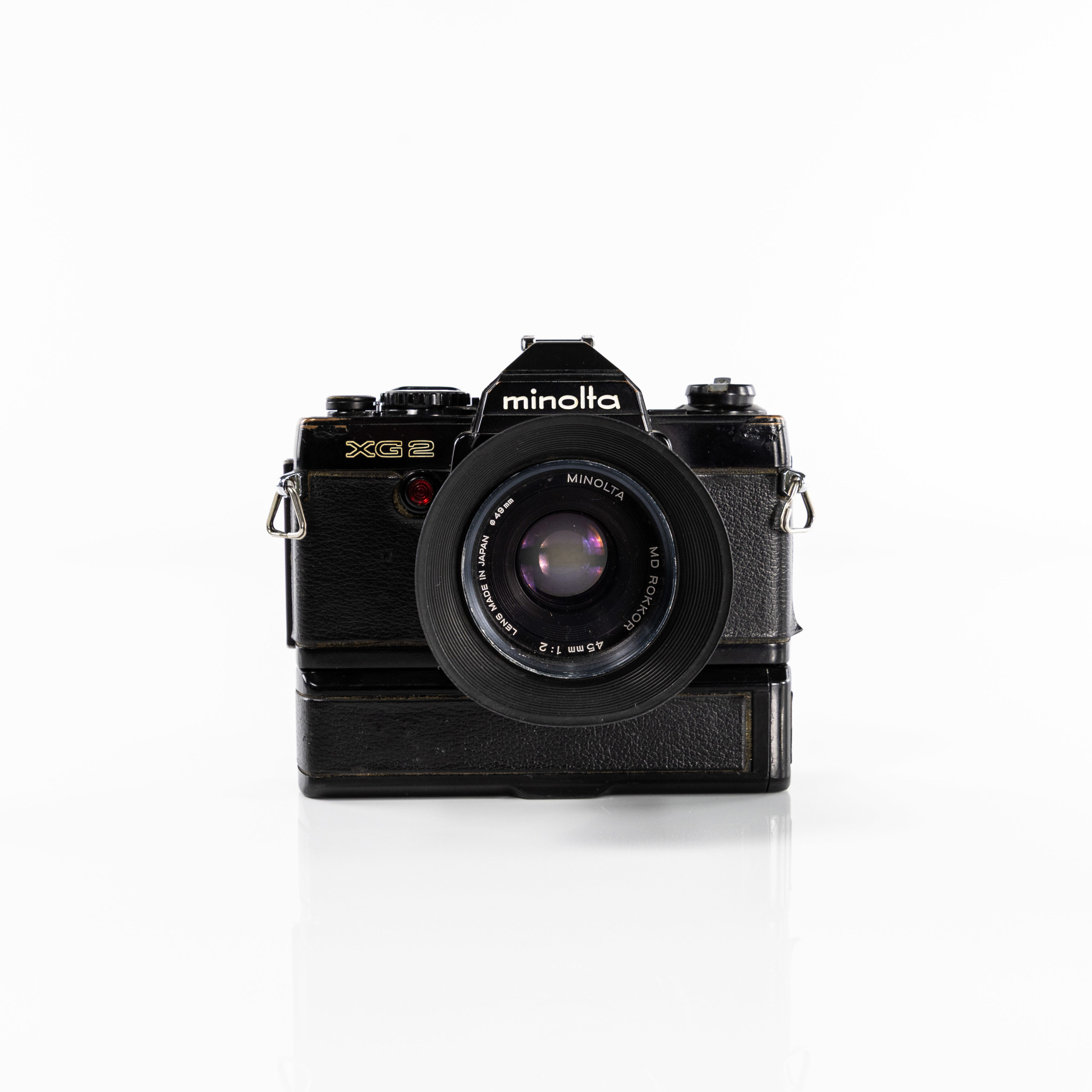 Systemkamera, Minolta, XG2, två objektiv, blixt, 70-tal, Japan