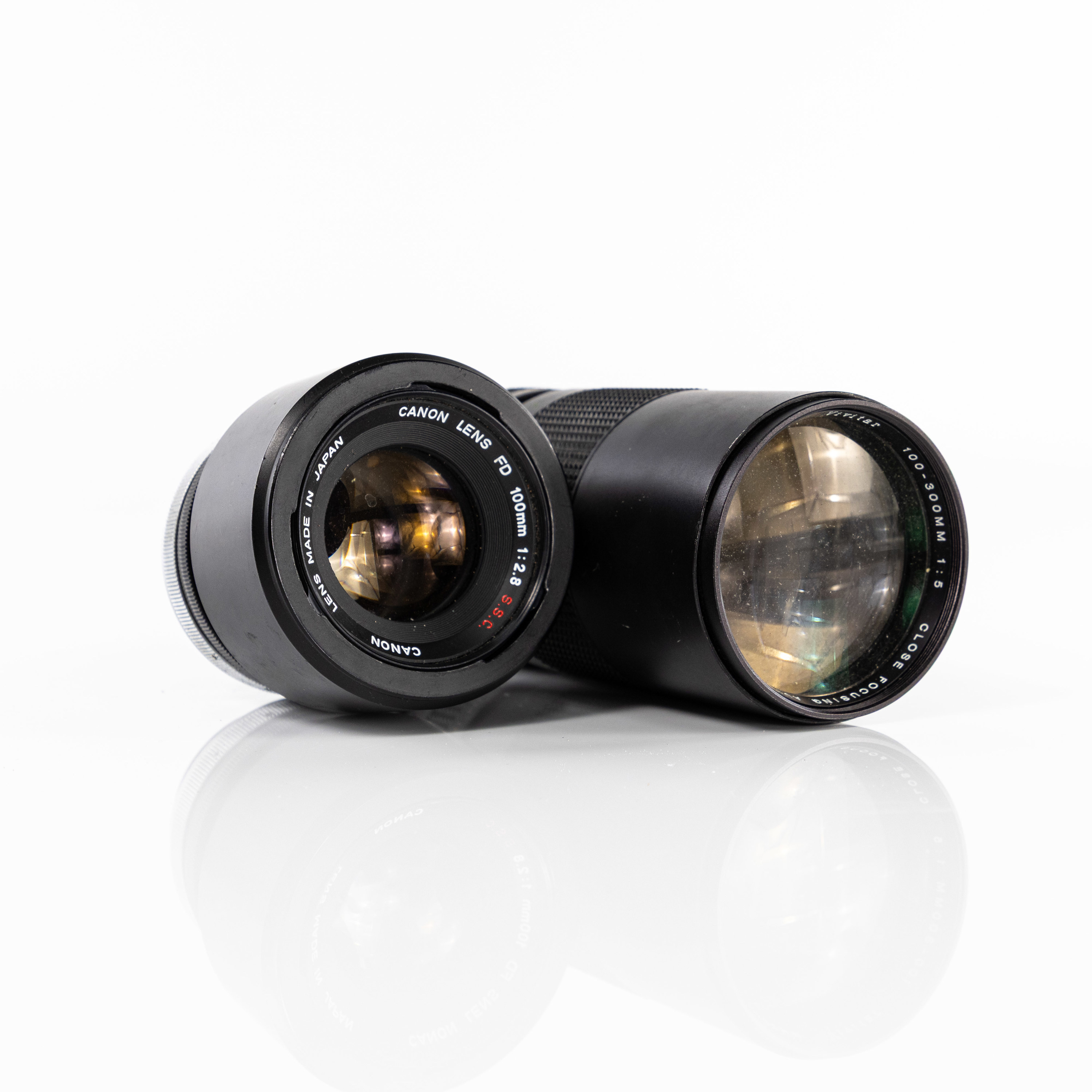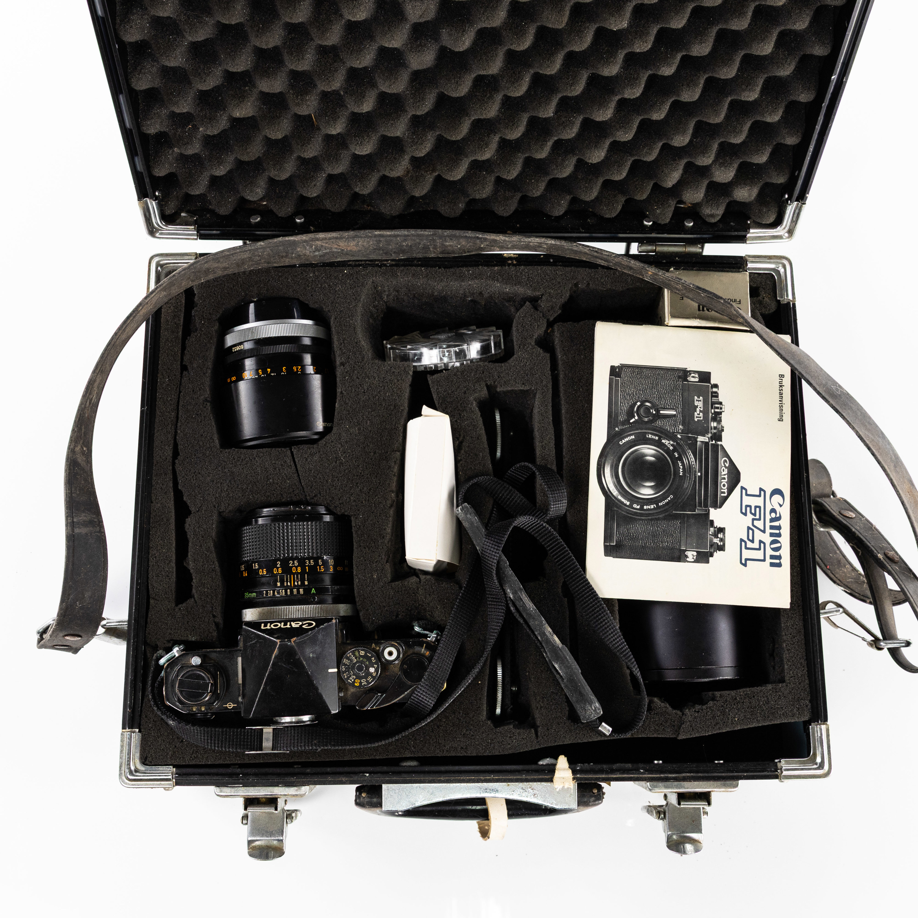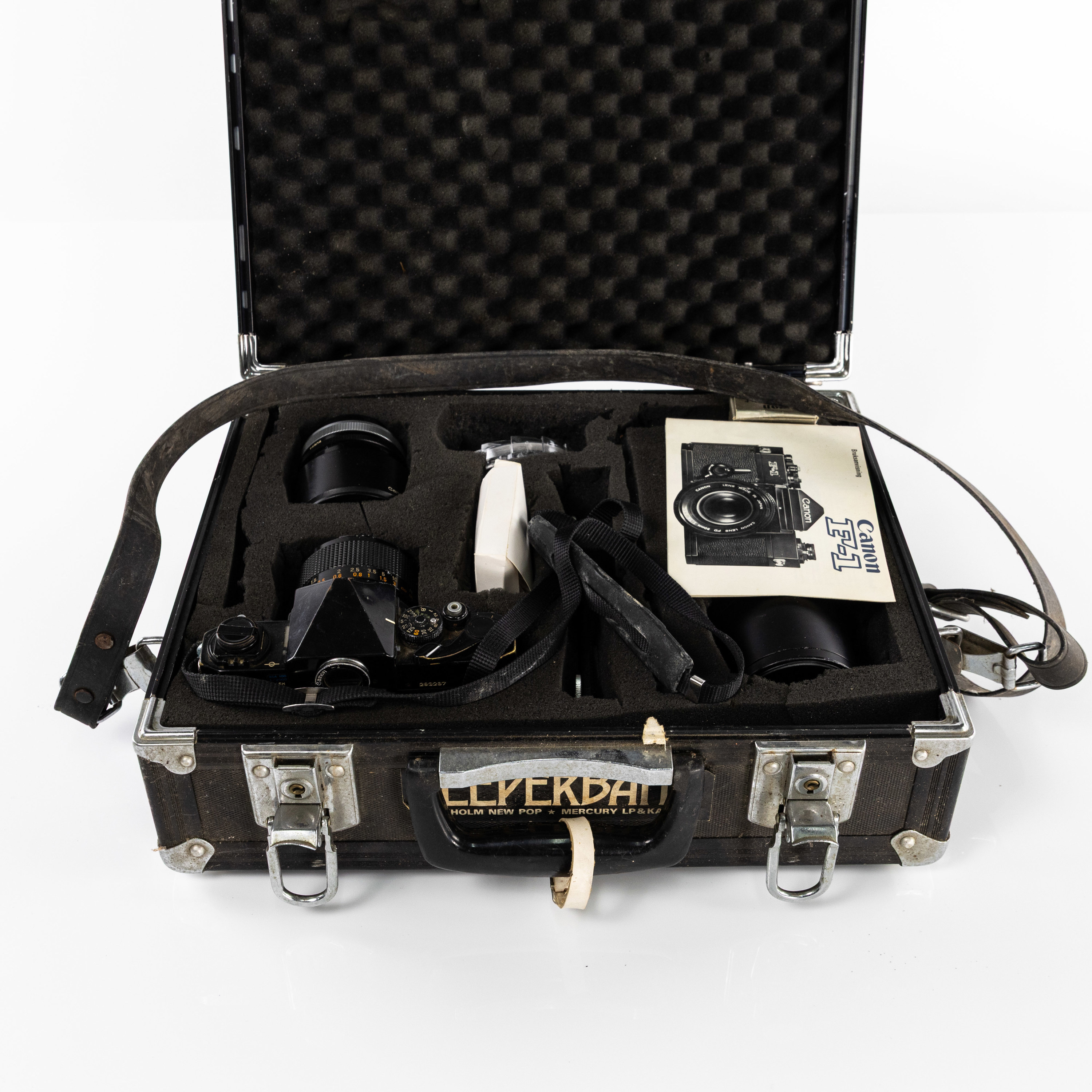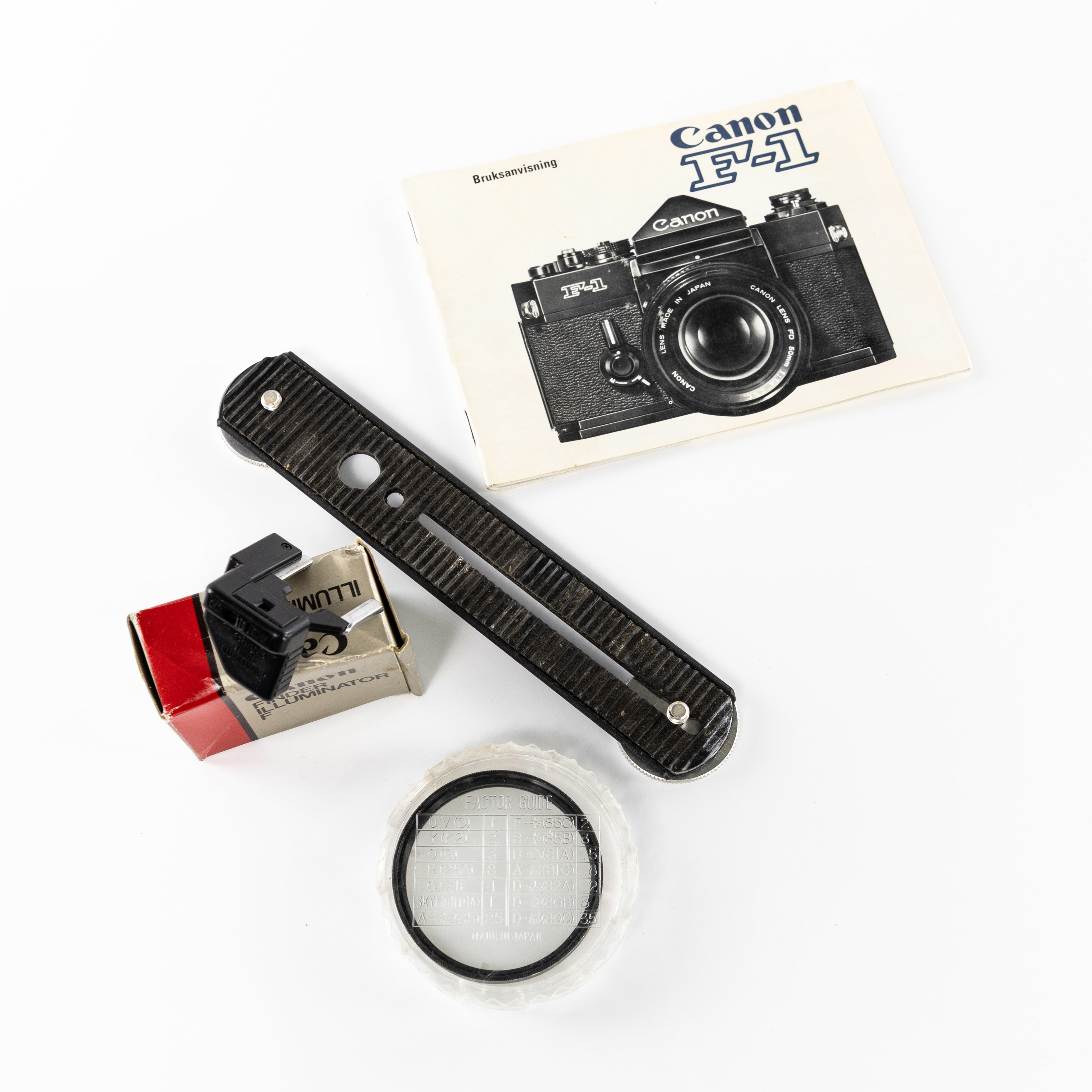 Systemkamera, Canon F1 Montreal, Optik; Canon Lens FD 35 mm/1:2, Canon Lens FD 100 mm/1:2.8, Vivitar Auto Zoom 100-300 mm/1:5, Tillbehör; Canon Finder Illuminator F, Hoya-filter, m.m., ca 1976, Japan, kommer i aluminiumväska med bruksanvisning
