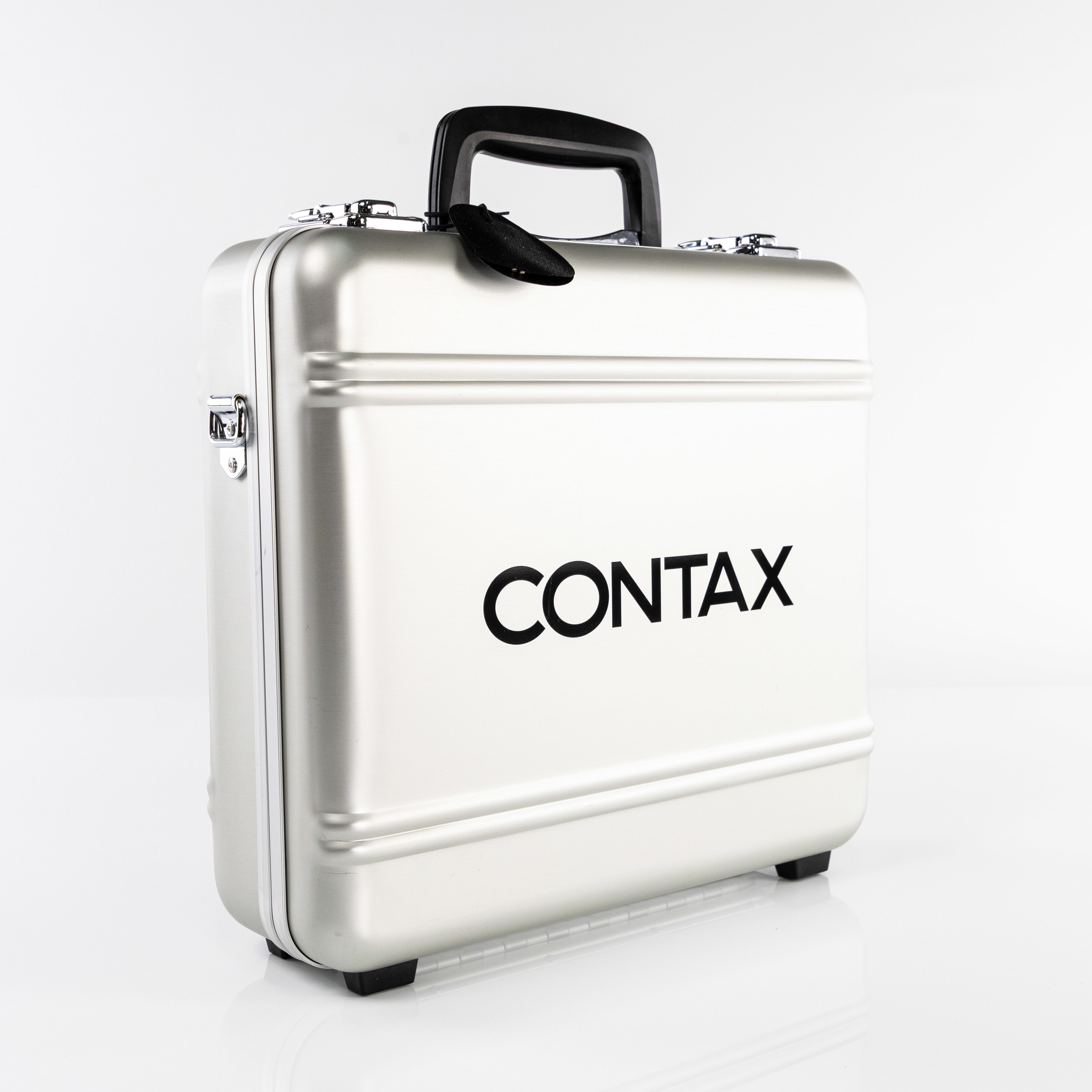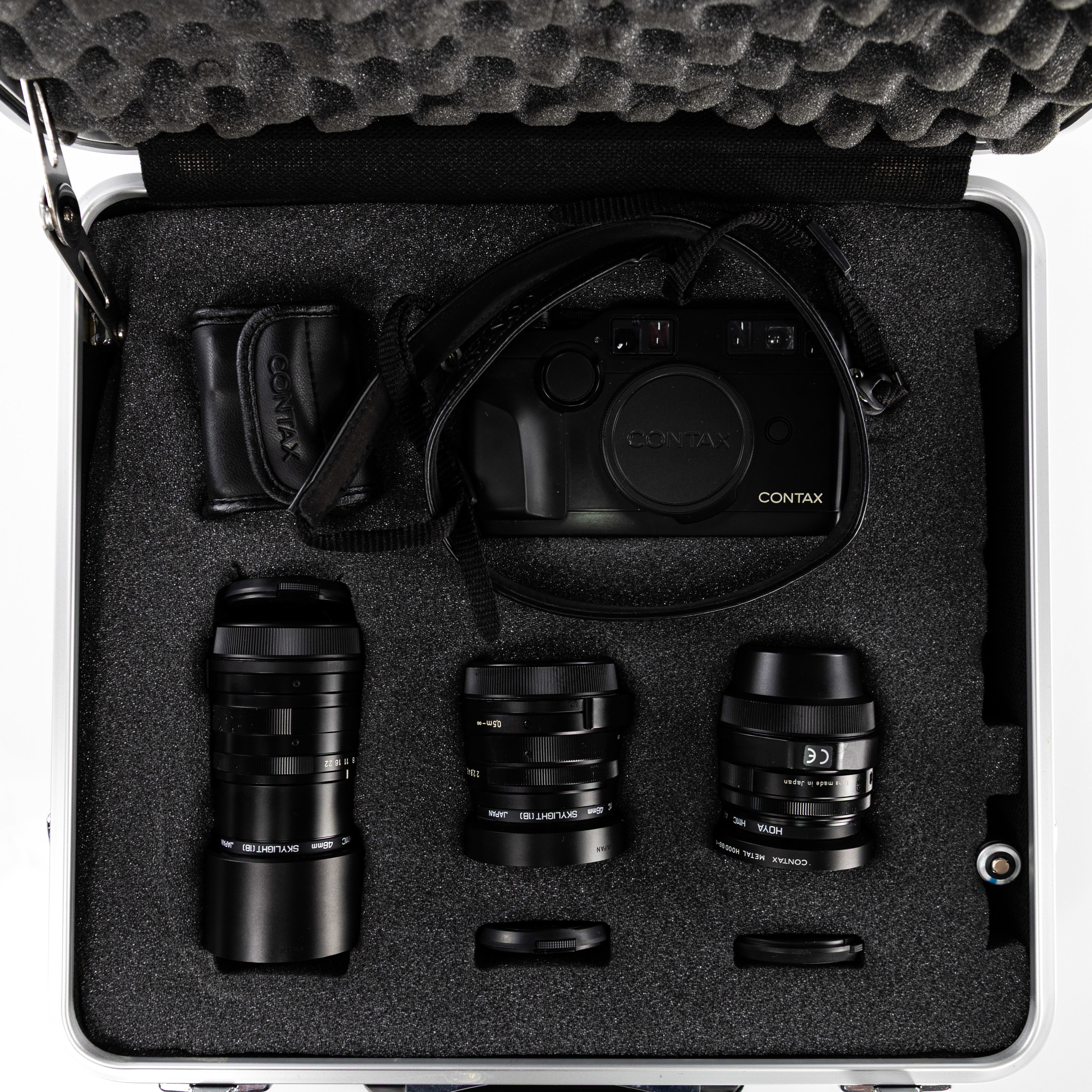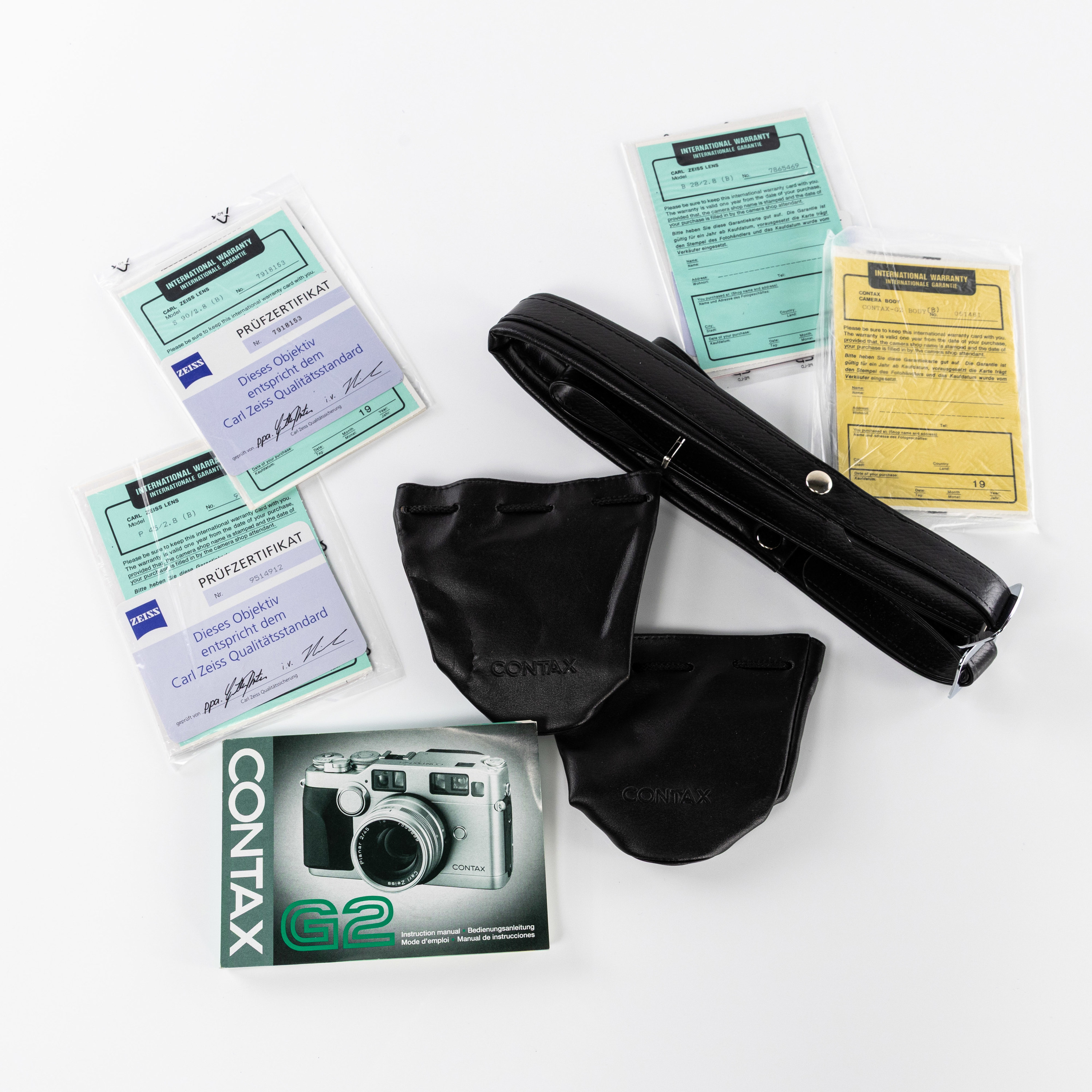 Systemkamera, Contax G2, Optik; Biogon 28 mm/1:2.8, Planar 45 mm/1:2, Sonnar 90 mm/1:2.8, blixt; TLA 200, ca 1990-tal, Japan, kommer med bruksanvisningar, extra objektivpåsar samt Contax-märkt hardcase-väska i aluminium
