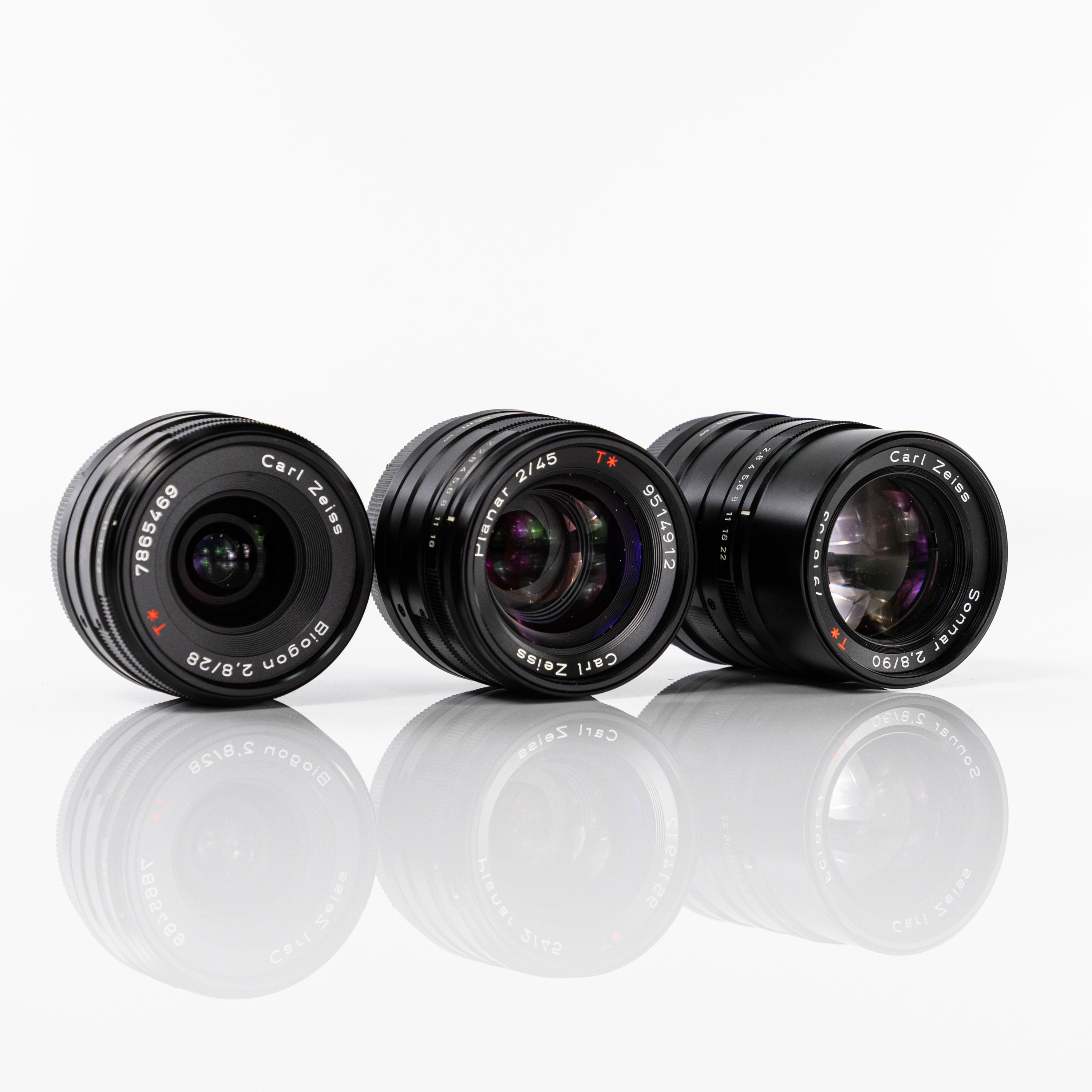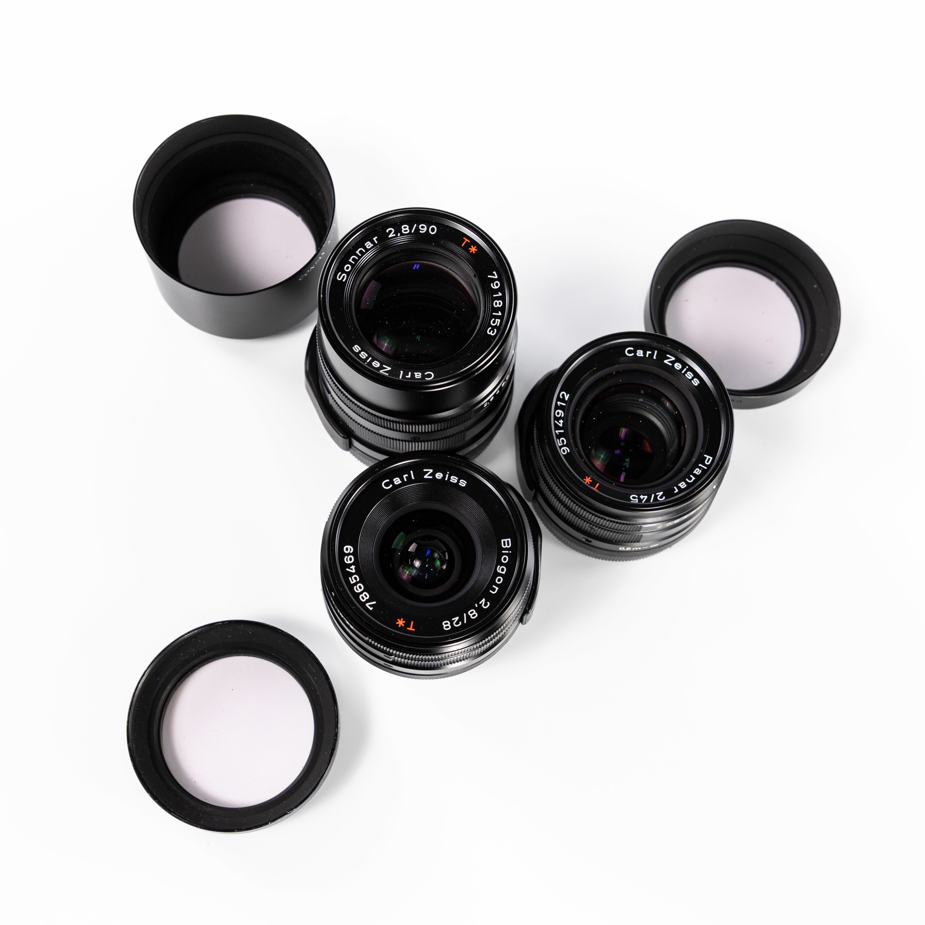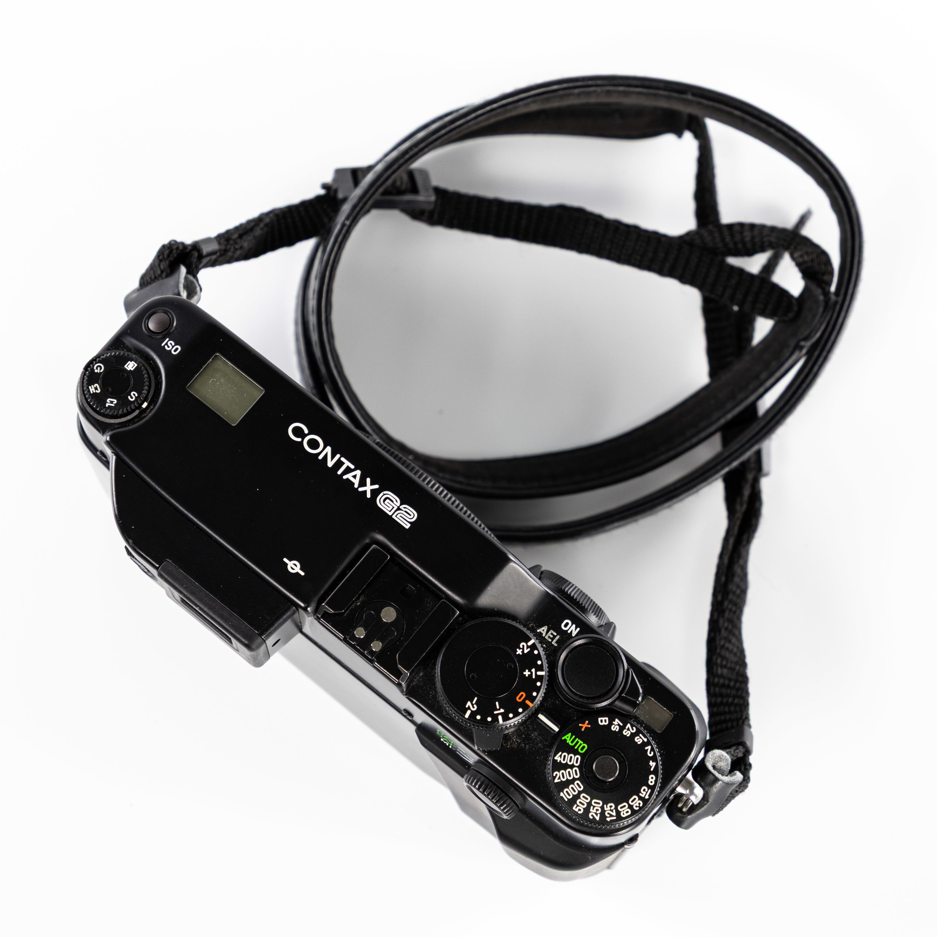 Systemkamera, Contax G2, Optik; Biogon 28 mm/1:2.8, Planar 45 mm/1:2, Sonnar 90 mm/1:2.8, blixt; TLA 200, ca 1990-tal, Japan, kommer med bruksanvisningar, extra objektivpåsar samt Contax-märkt hardcase-väska i aluminium