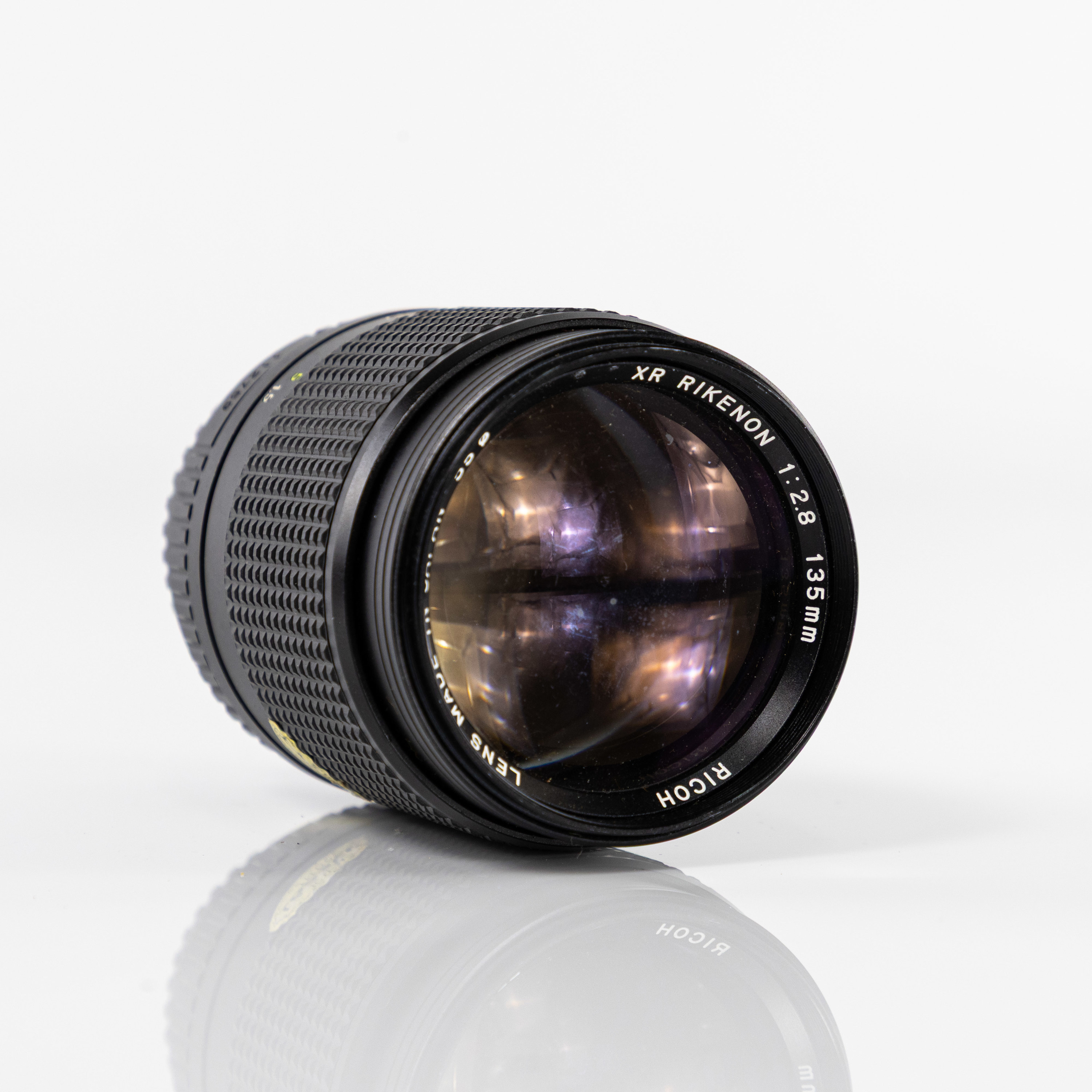 Systemkamera, Ricoh KR-10, Optik; XR Rikenon 50 mm/1:2, XR Rikenon 135 mm/1:2.8, Tillbehör; Winder; Ricoh XR Winder-1, Blixt; Tickytron 16, ca tidigt 1980-tal, Japan, kommer i enklare kameraväska i fuskläder