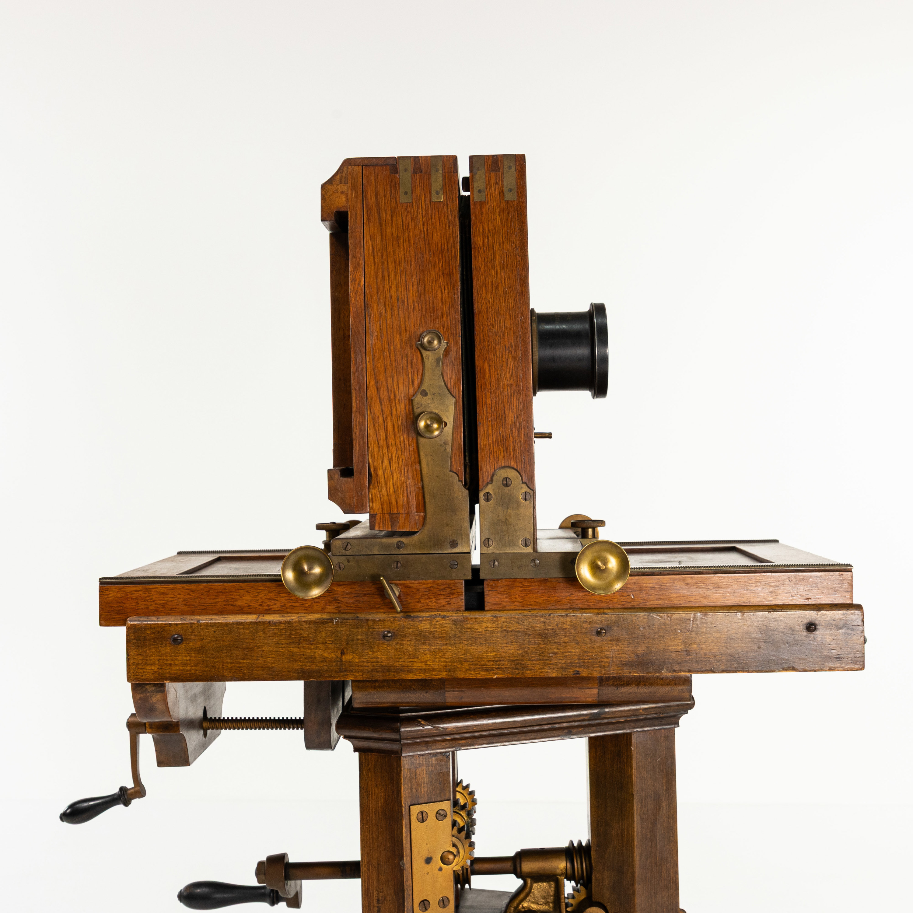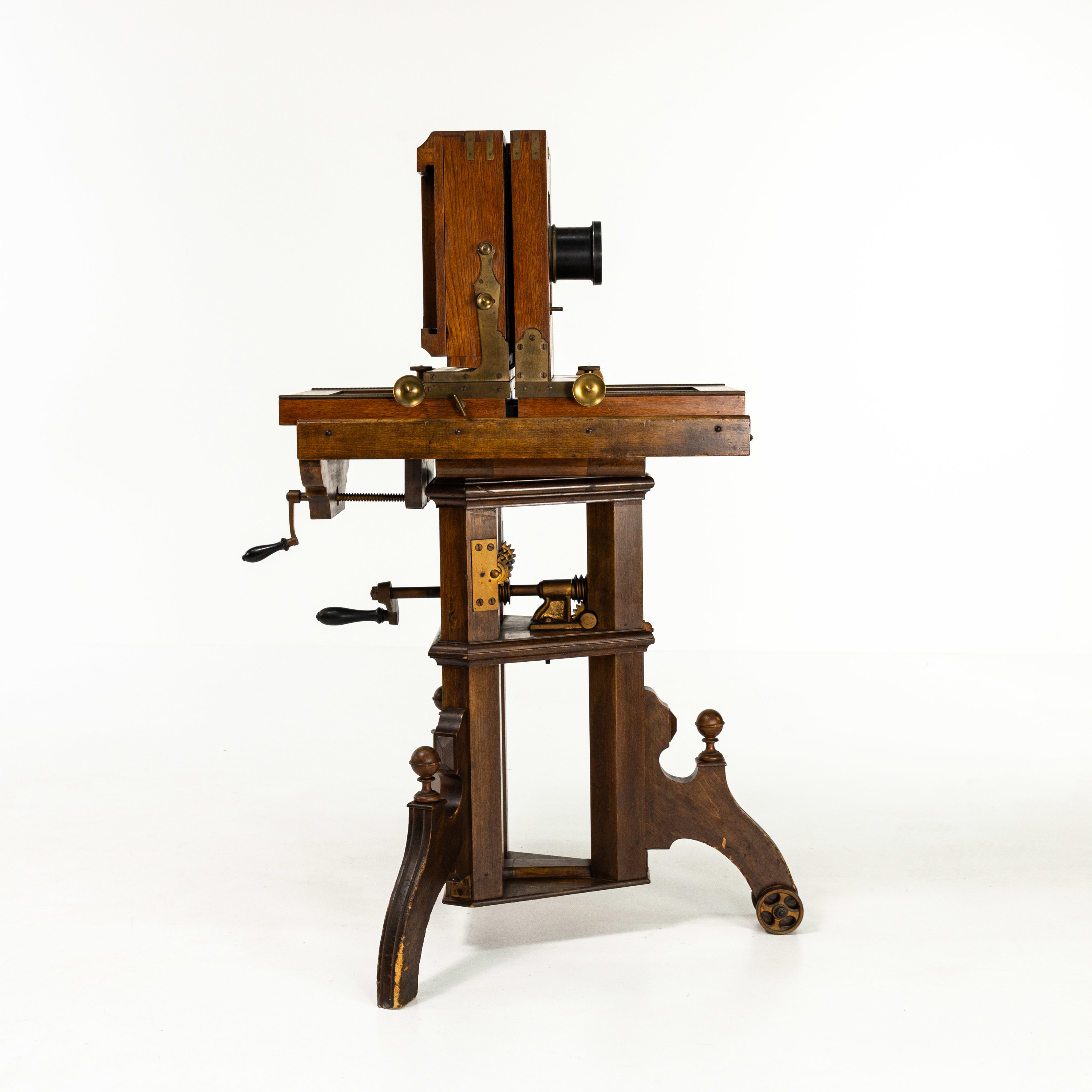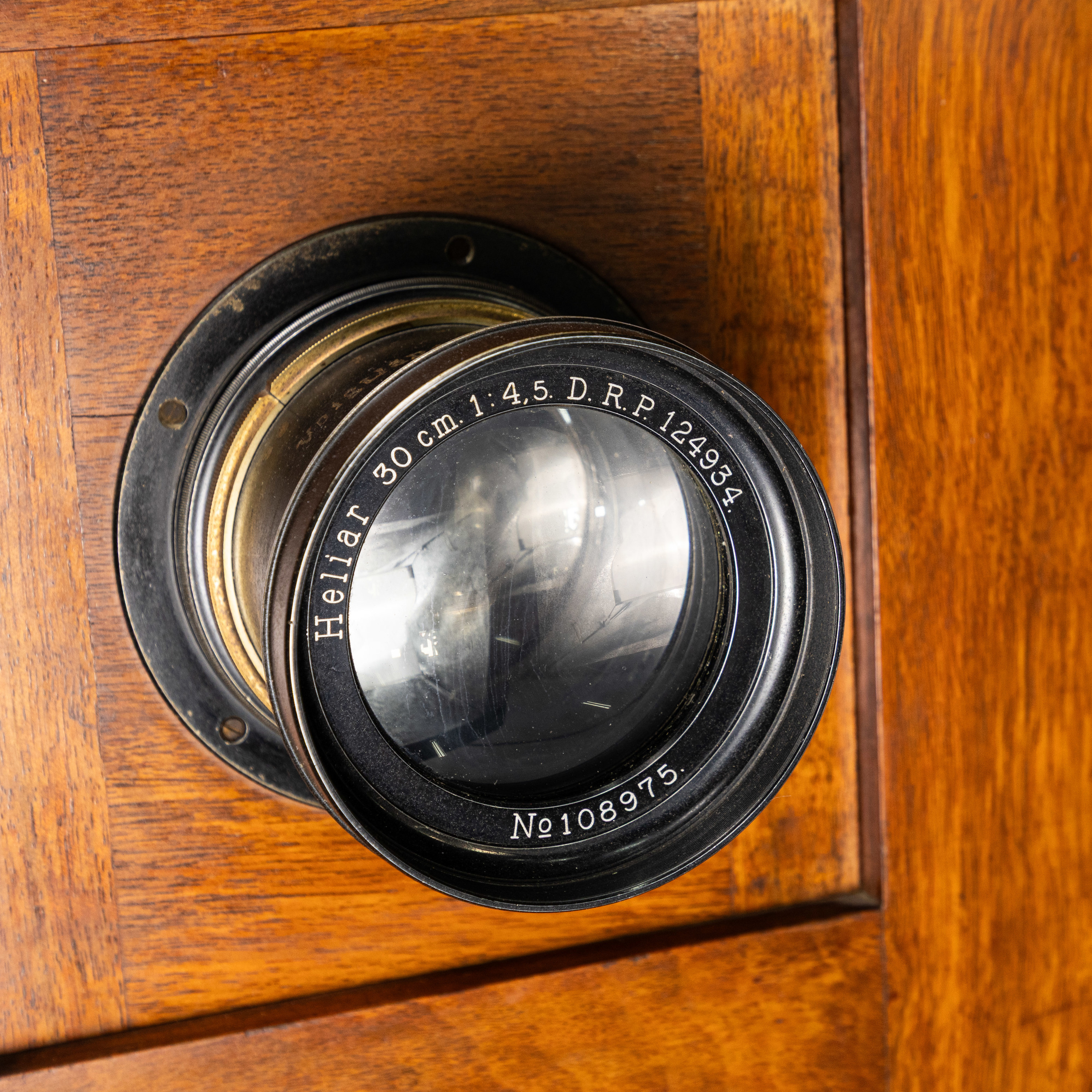 Storbildskamera för studioanvädning, mahogny och mässing, på höj-/sänkbart samt vinklingsbart statativ på hjul, Optik; Voigtländer Heliar 300 mm/1:4.5, 1900-talets början, Stölten & Simmonsen, Malmö, brickmärkt
