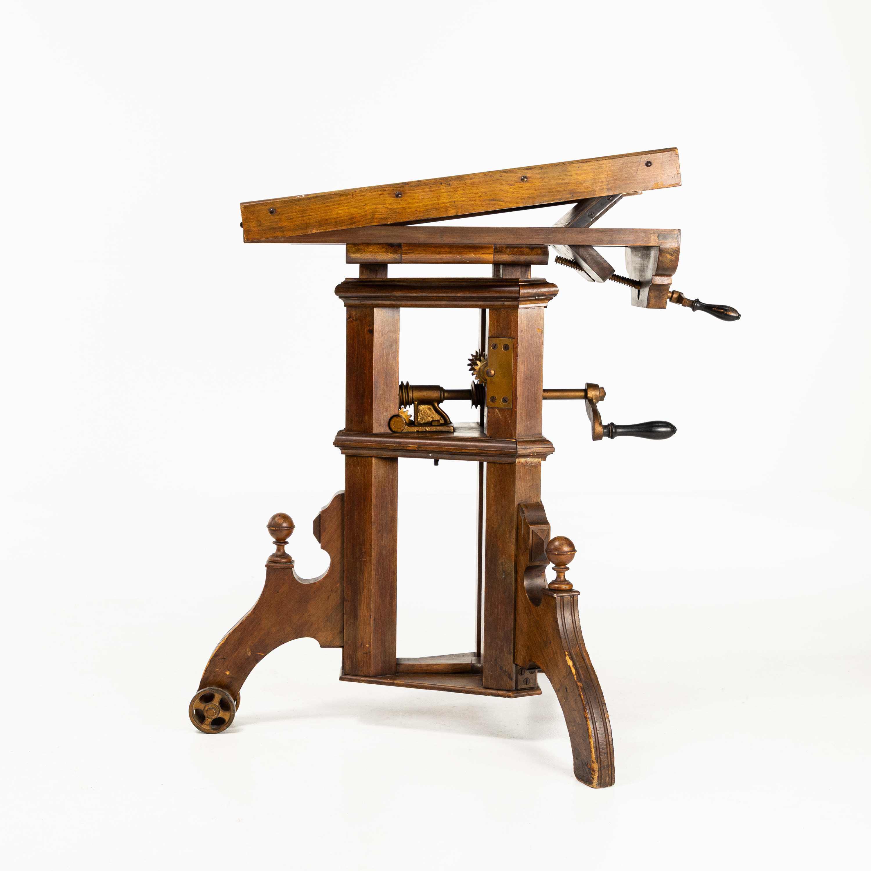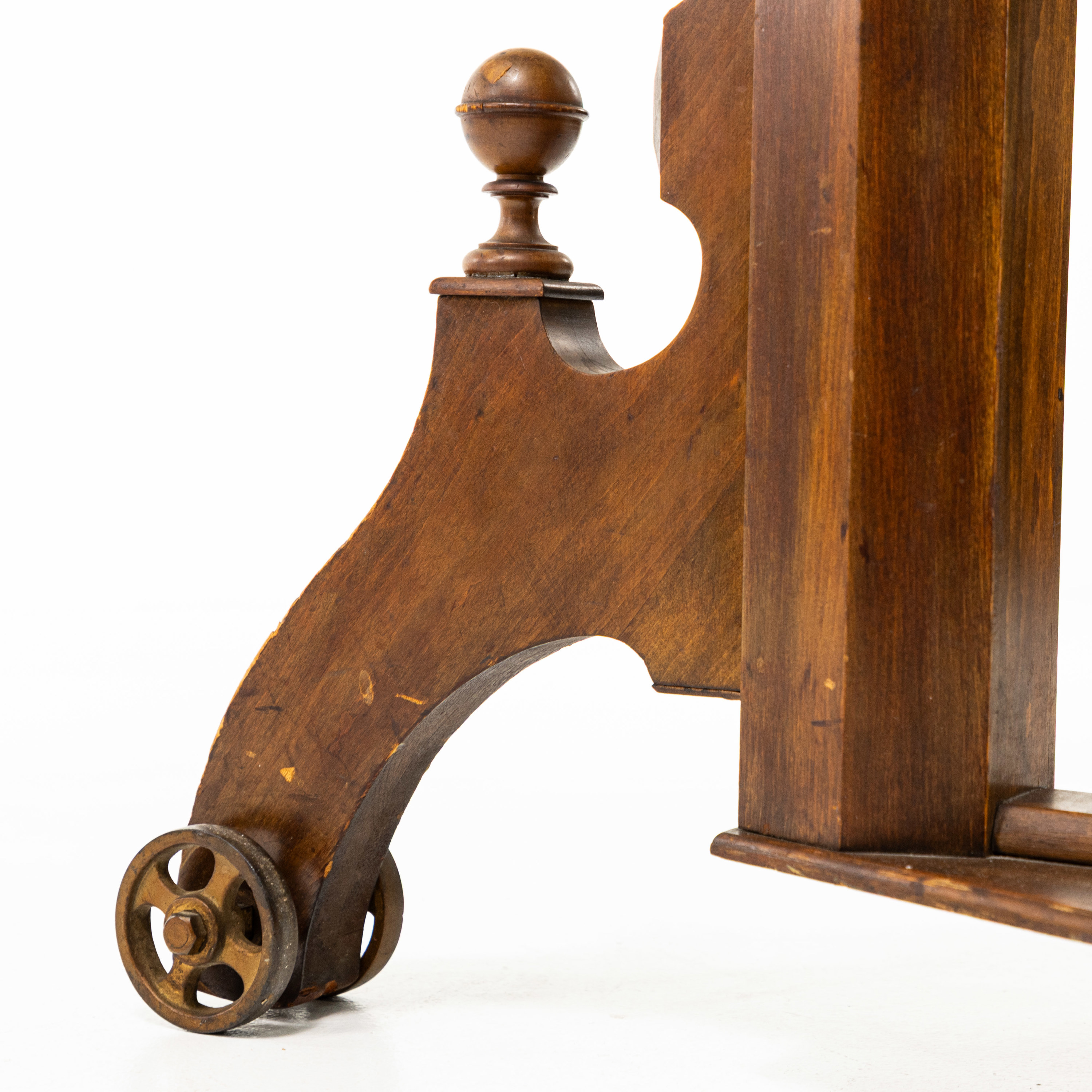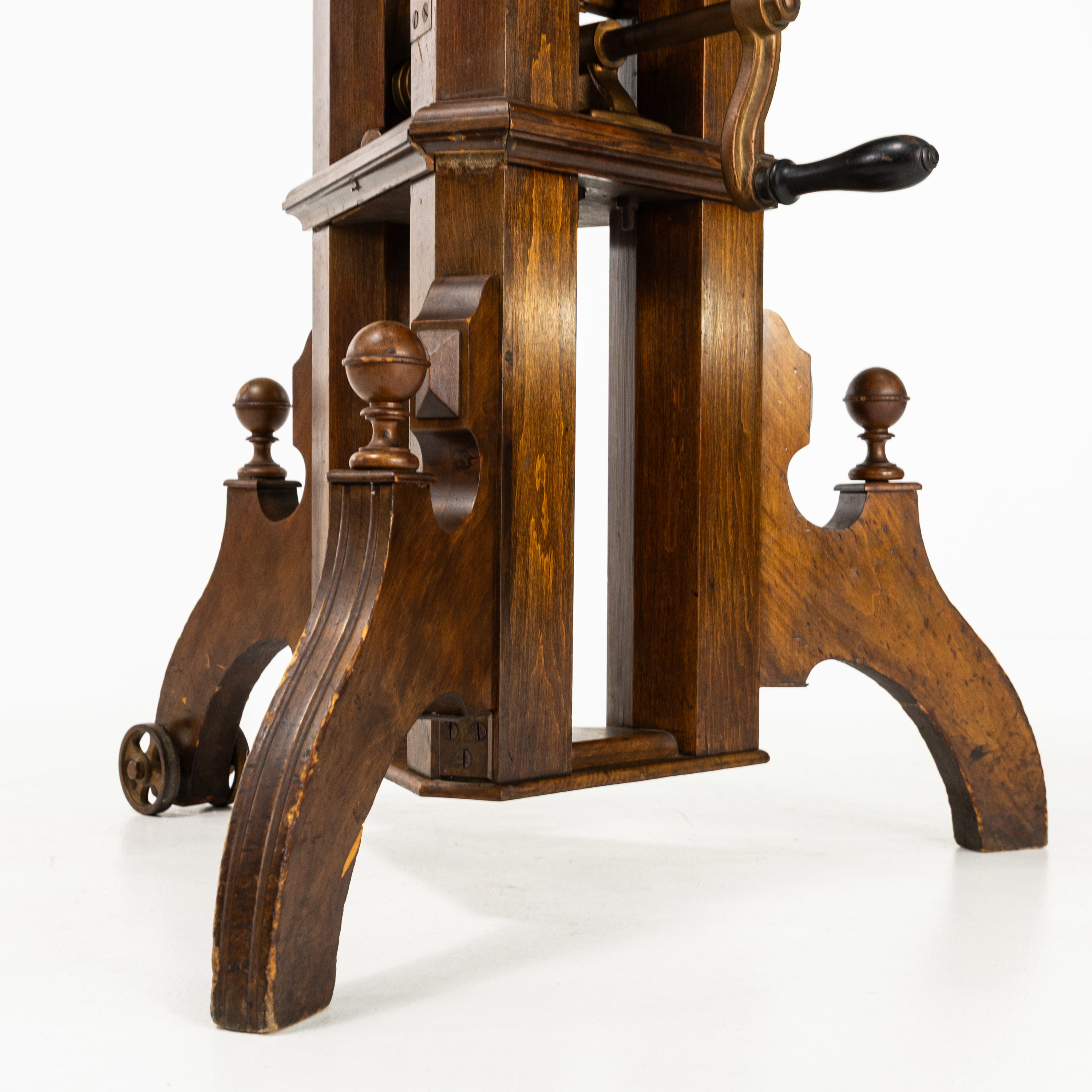 Storbildskamera för studioanvädning, mahogny och mässing, på höj-/sänkbart samt vinklingsbart statativ på hjul, Optik; Voigtländer Heliar 300 mm/1:4.5, 1900-talets början, Stölten & Simmonsen, Malmö, brickmärkt