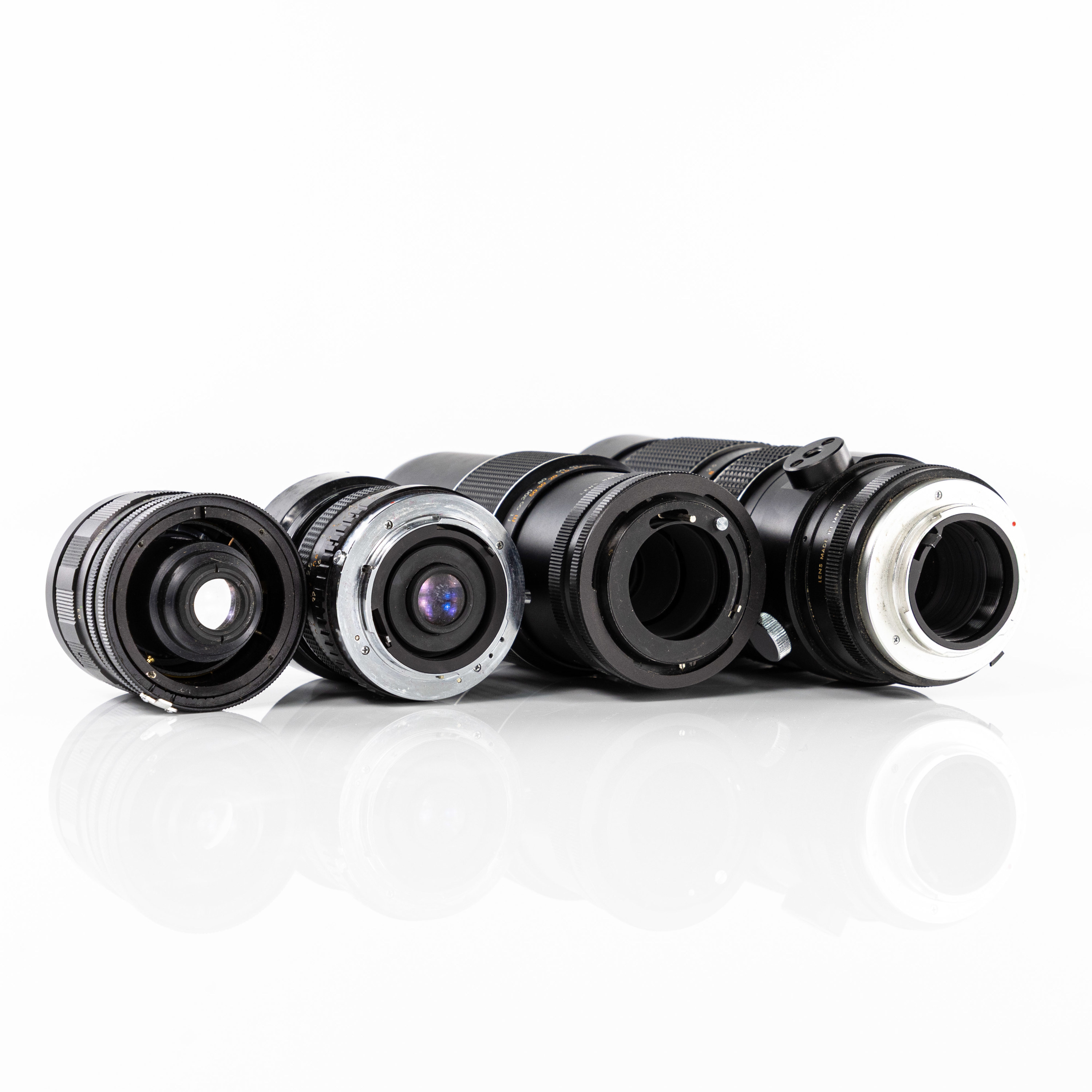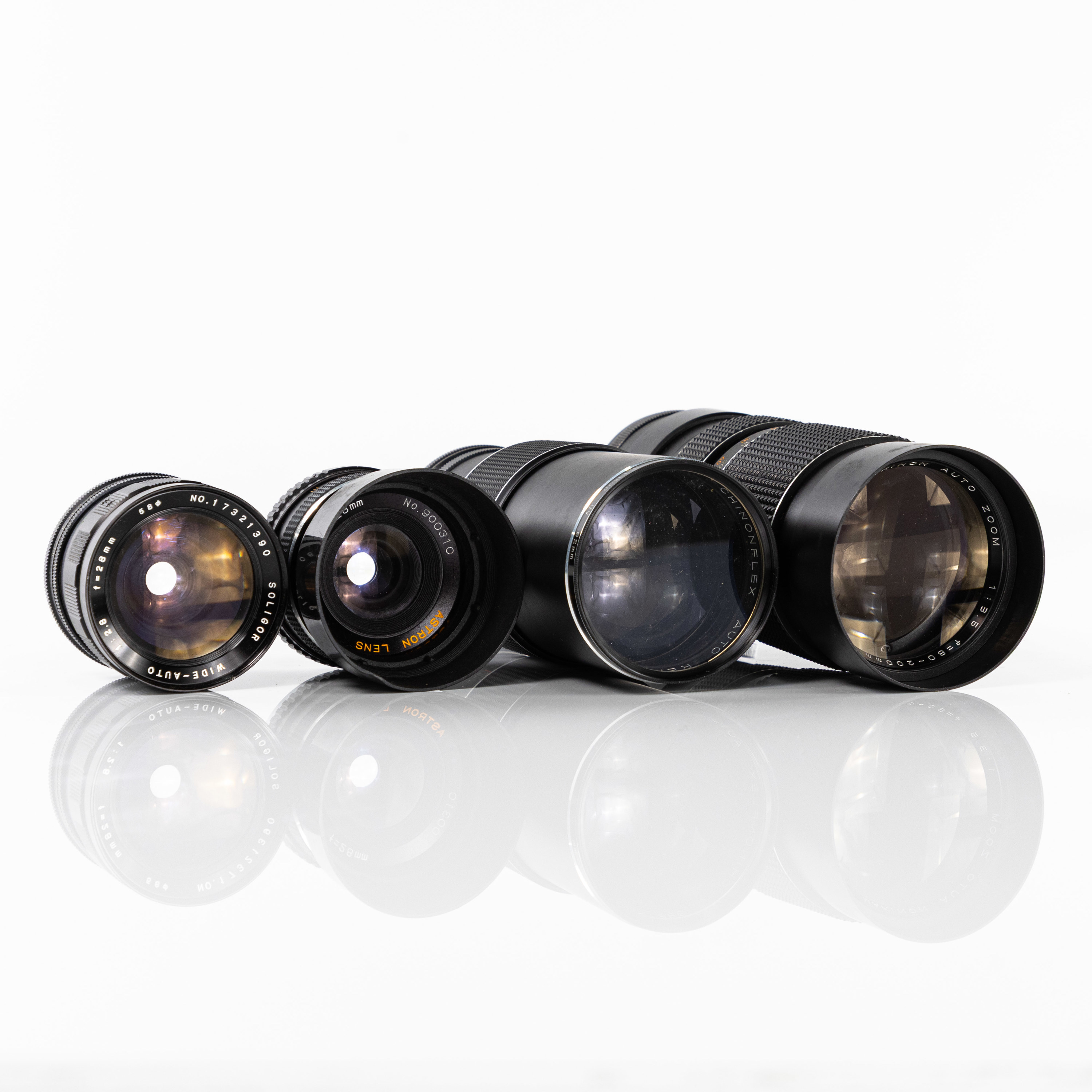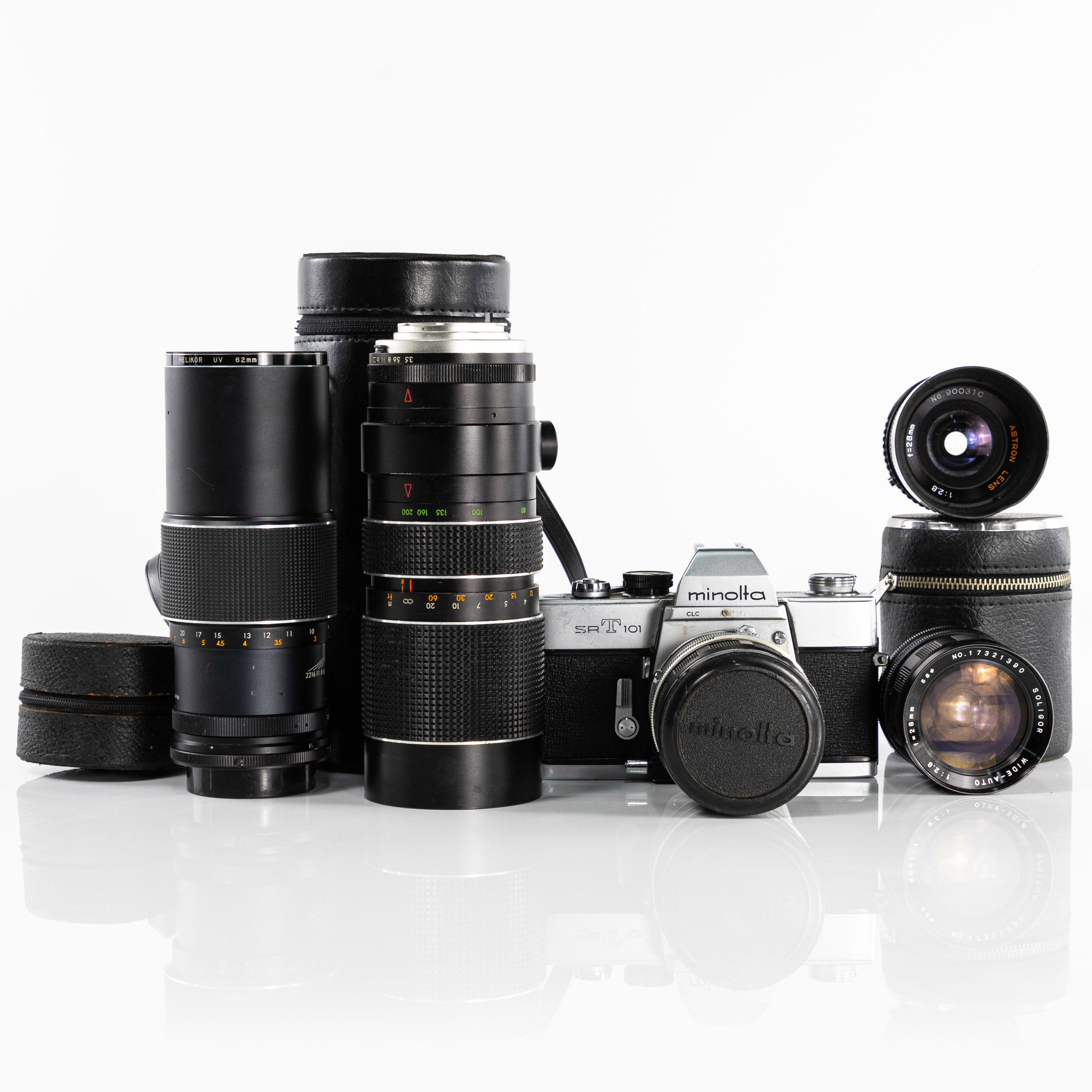 Systemkamera, Minolta SRT-101, Optik; Astron Lens, 28 mm/1:2.8Soligor Wide Auto 28 mm/1:2.8, Minolta MC Rokkor-PF 58 mm/1:1.4, Makinon Auto Zoom 80-200 mm/1:3.5, Chinonflex Auto Reflex 200 mm/1:3.5, ca 1970-tal, Japan
