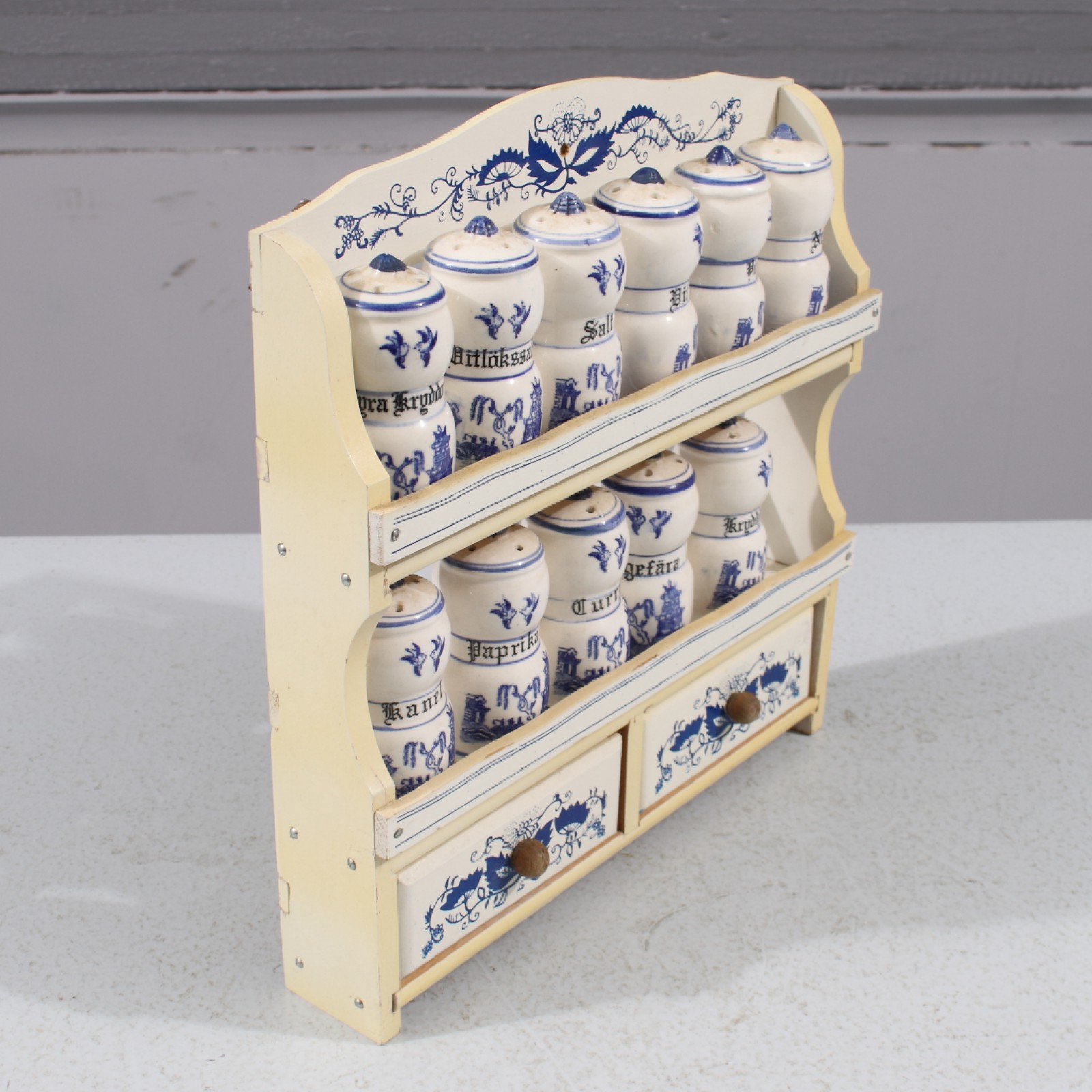 Hylla i trä, kryddburkar/ströare i flintgods, hylla 26x24,5x4 cm, ströare 8 cm. (vån3)